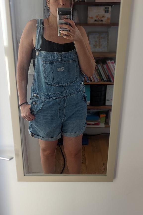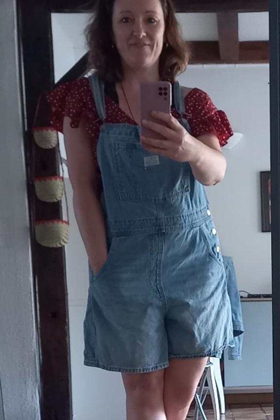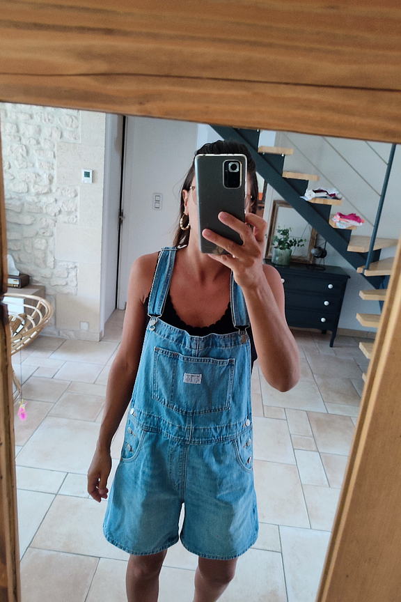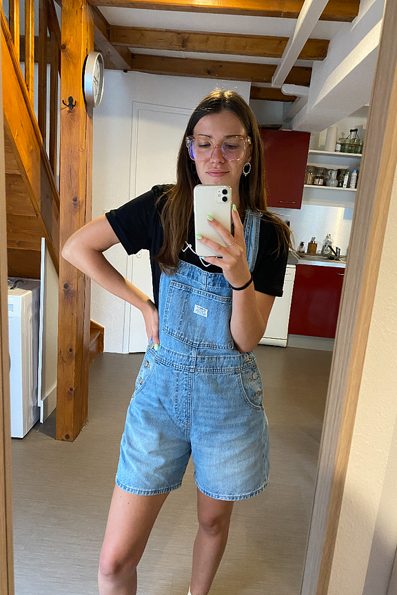 โข Combinaison short style salopette en jean bleu ciel โข Relaxed fit โข Poche plaquรฉe sur le devant โข Bretelles ajustables โข Poches cรดtรฉ et dos โข Bas de jambe ร revers โข Pas de stretch