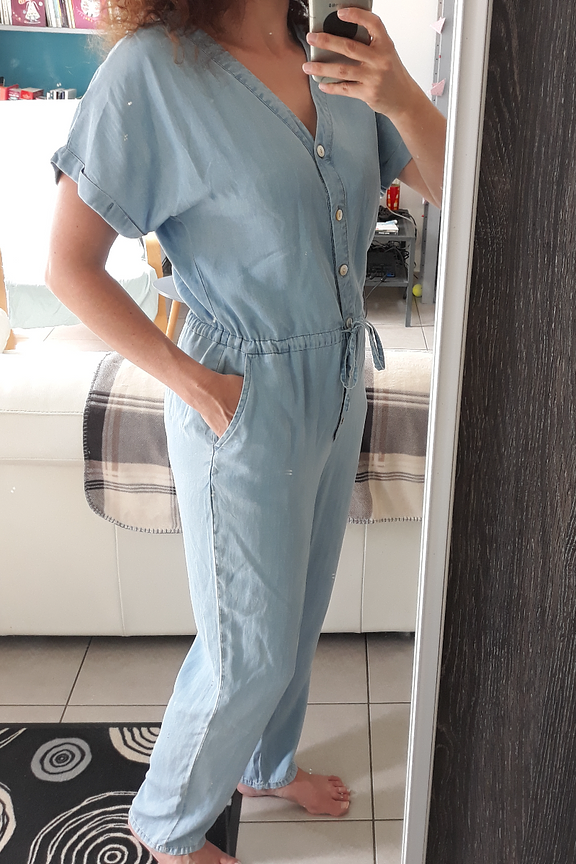 โข Combinaison longue en Tencel โข Encolure en V โข Boutons sur le devant โข Manches courtes ร revers โข Taille cintrรฉe รฉlastiquรฉe โข Poches latรฉrales
