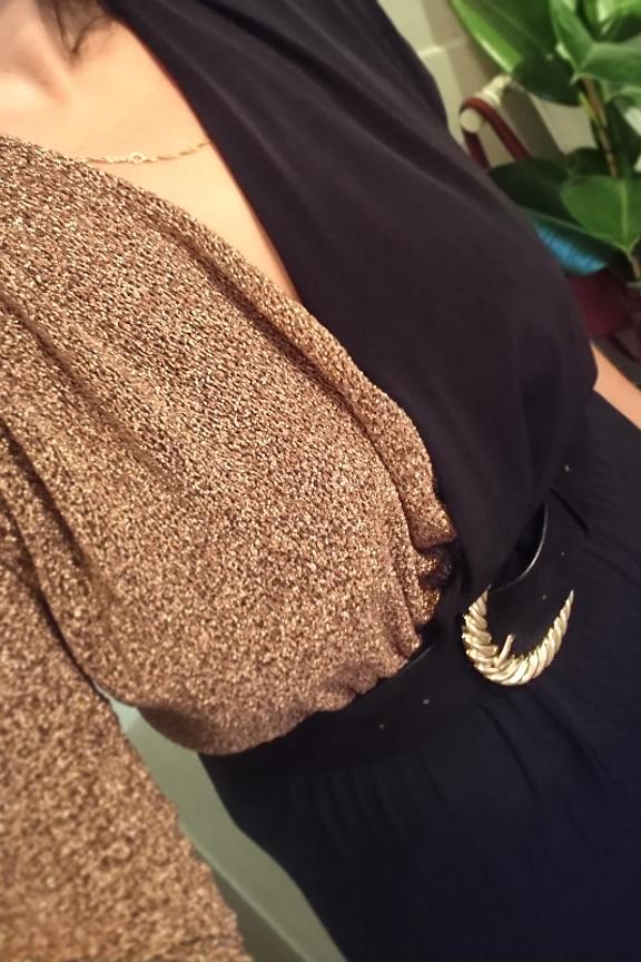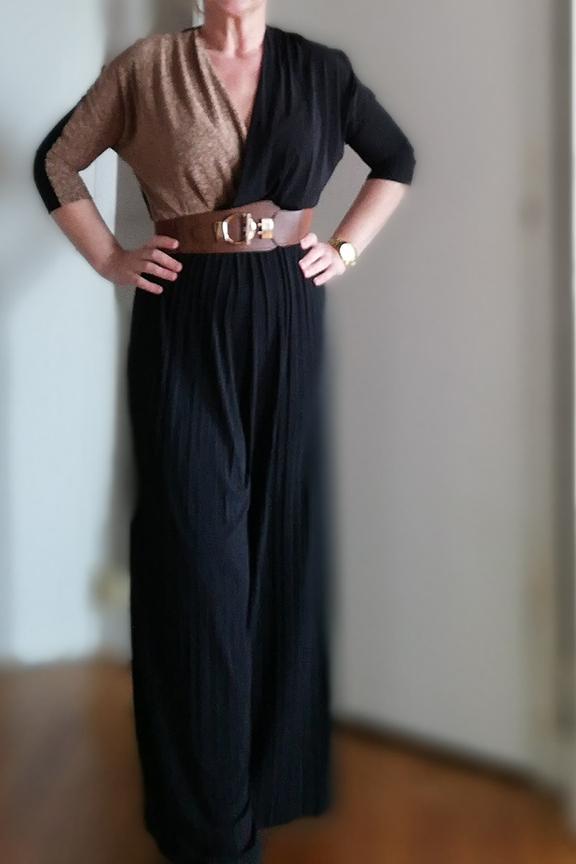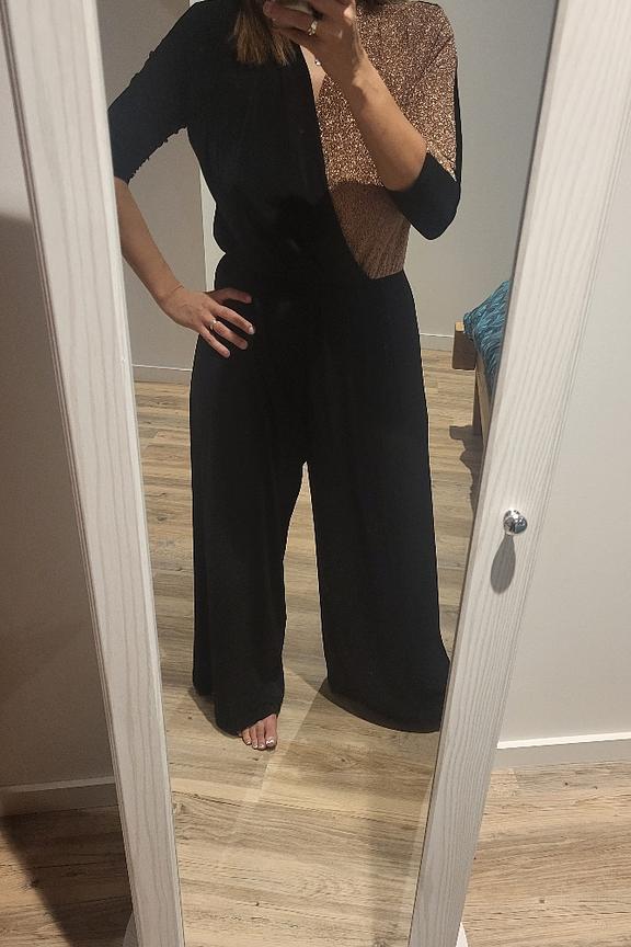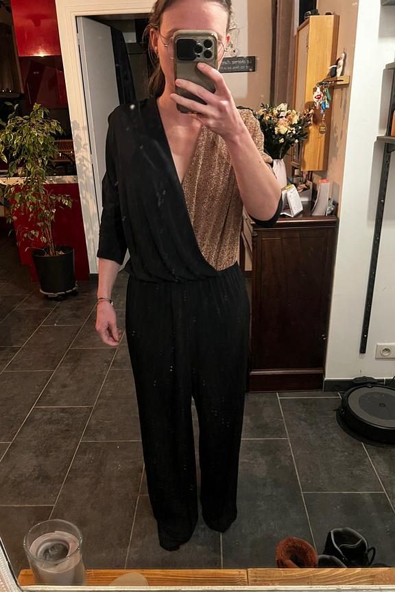 Zelda sublime avec sa matiรจre tout en fluiditรฉ & son plissรฉ ultra habillรฉ. Cโ€™est LA piรจce dans laquelle on se sent belle & bien. Une taille parfaitement soulignรฉe, des hanches magnifiรฉes. On garde sa sensualitรฉ avec un dรฉcolletรฉ cache-cล“ur ! โ€ข Fabrication Franรงaise/ Marque Franรงaise โ€ข Combinaison pantalon ร  manches 3/4 โ€ข Encolure forme cache coeur โ€ข Resserrรฉe ร  la taille par un รฉlastique โ€ข Jambes larges โ€ข Longueur intรฉrieur jambe : 67 cm (pour un 44/46) โ€ข Sara porte du 44/46 et mesure 1m79. Carla porte du 40/42 et mesure 1m77. Longueur depuis l'รฉpaule 148 cm (pour un 44/46). โ€ข Matiรจres: noir : 95% polyester, 5% รฉlasthanne , dorรฉ : 70% polyamide, 25% mรฉtal, 5% รฉlasthanne.