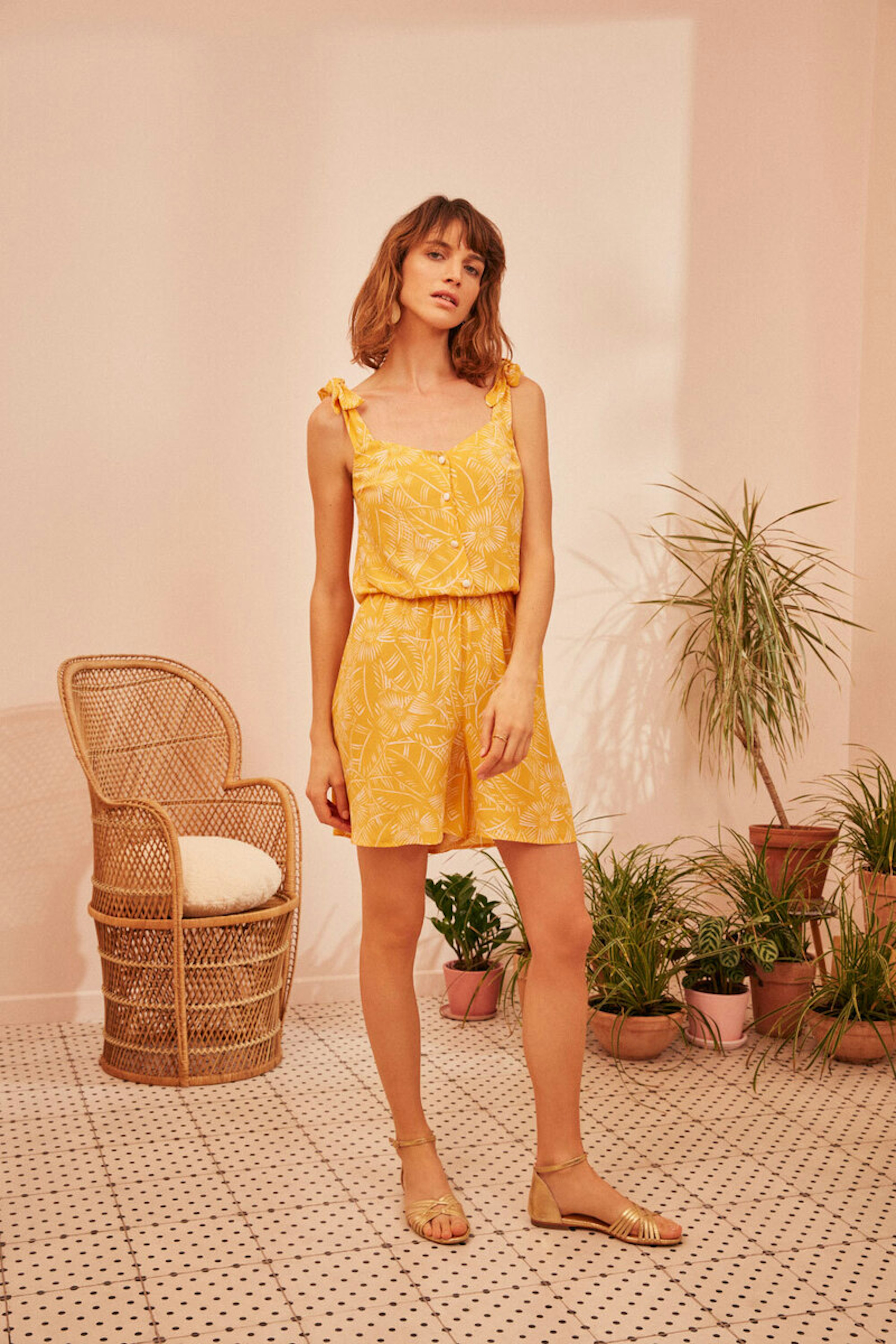 โข Combinaison short avec bretelles ร nouer sur l'รฉpaule โข Encolure V avec patte de boutonnage jusqu'ร la taille โข Boutons fantaisie ร pieds dorรฉs, ton sur ton avec l'รฉcru de l'imprimรฉ โข Elastiquรฉe ร la taille โข Pinces niveau poitrine โข Rรฉalisรฉe en crรชpe de viscose imprimรฉe
