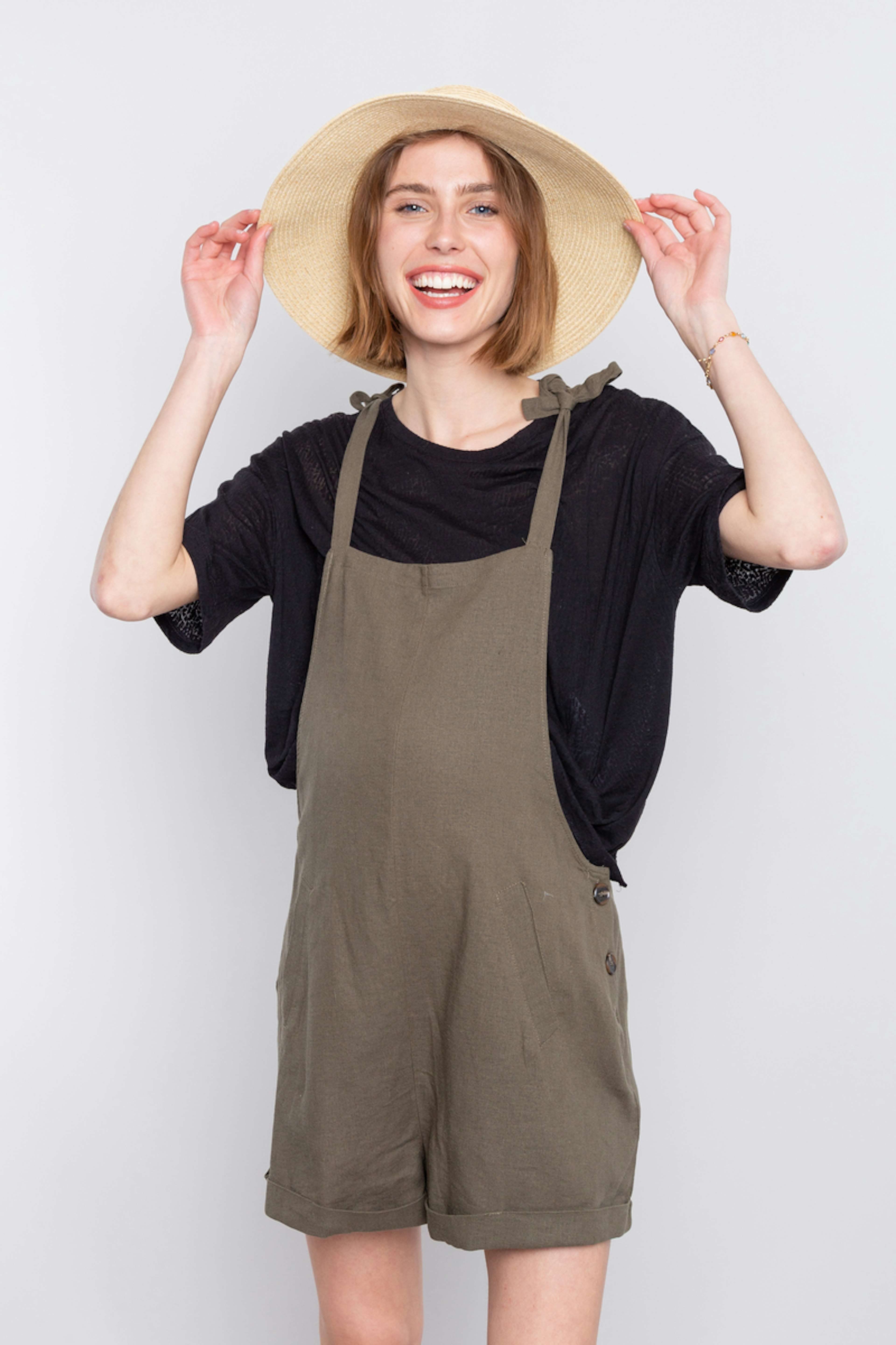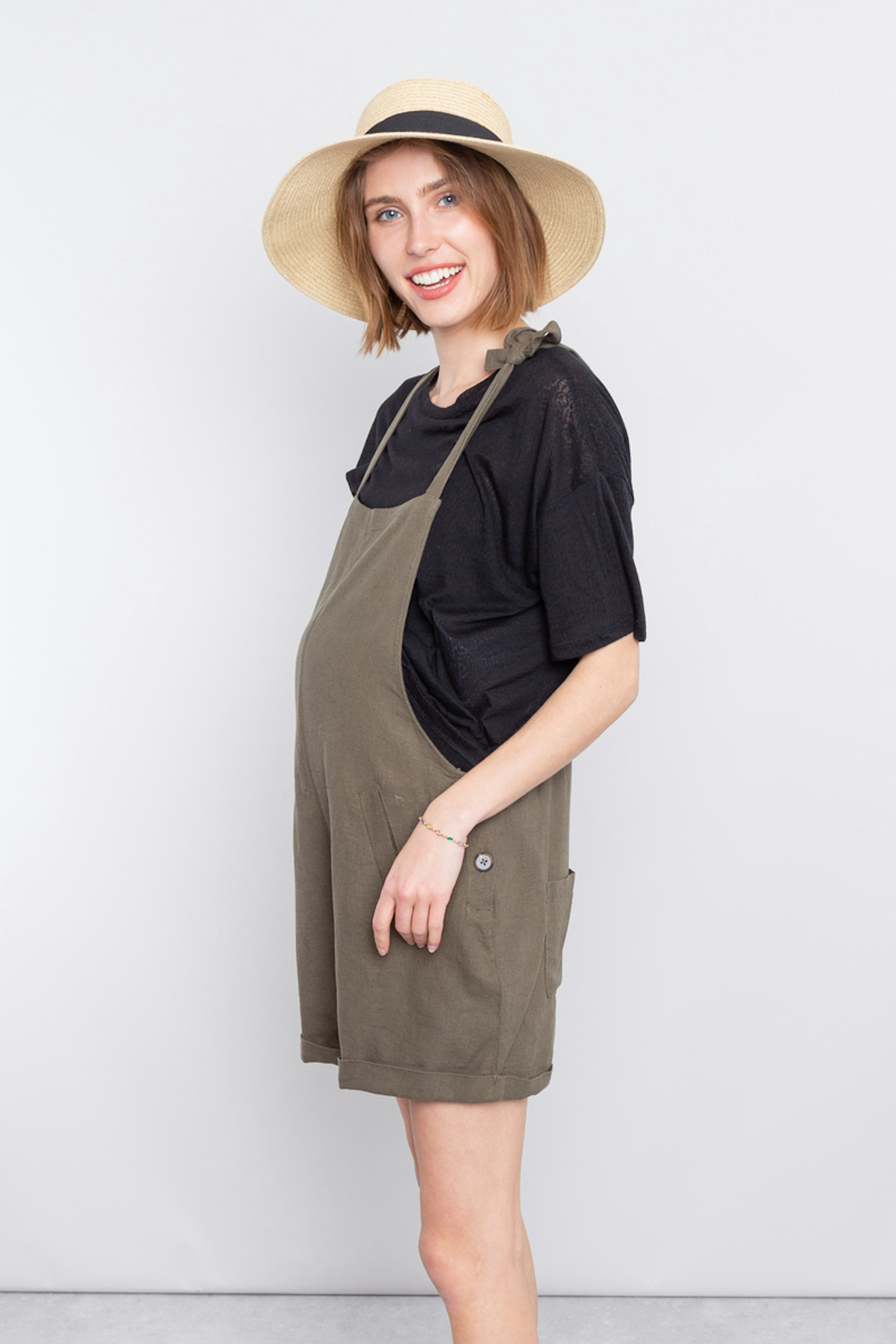 โข Combishort de grossesse en lin et viscose mรฉlangรฉ โข Bretelles ร nouer et ajustables โข Poches latรฉrales โข Boutons sur le cรดtรฉ โข Sans manches