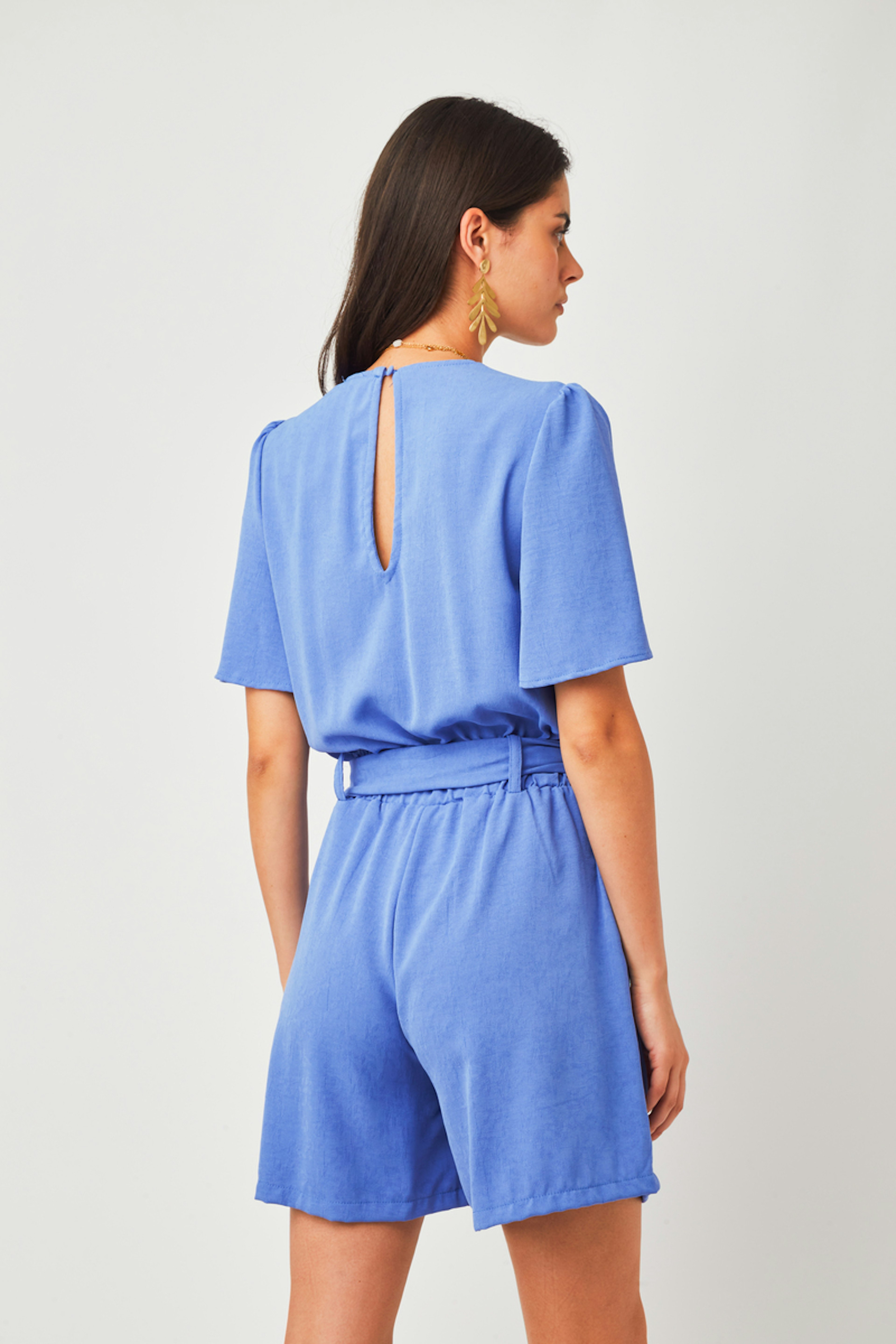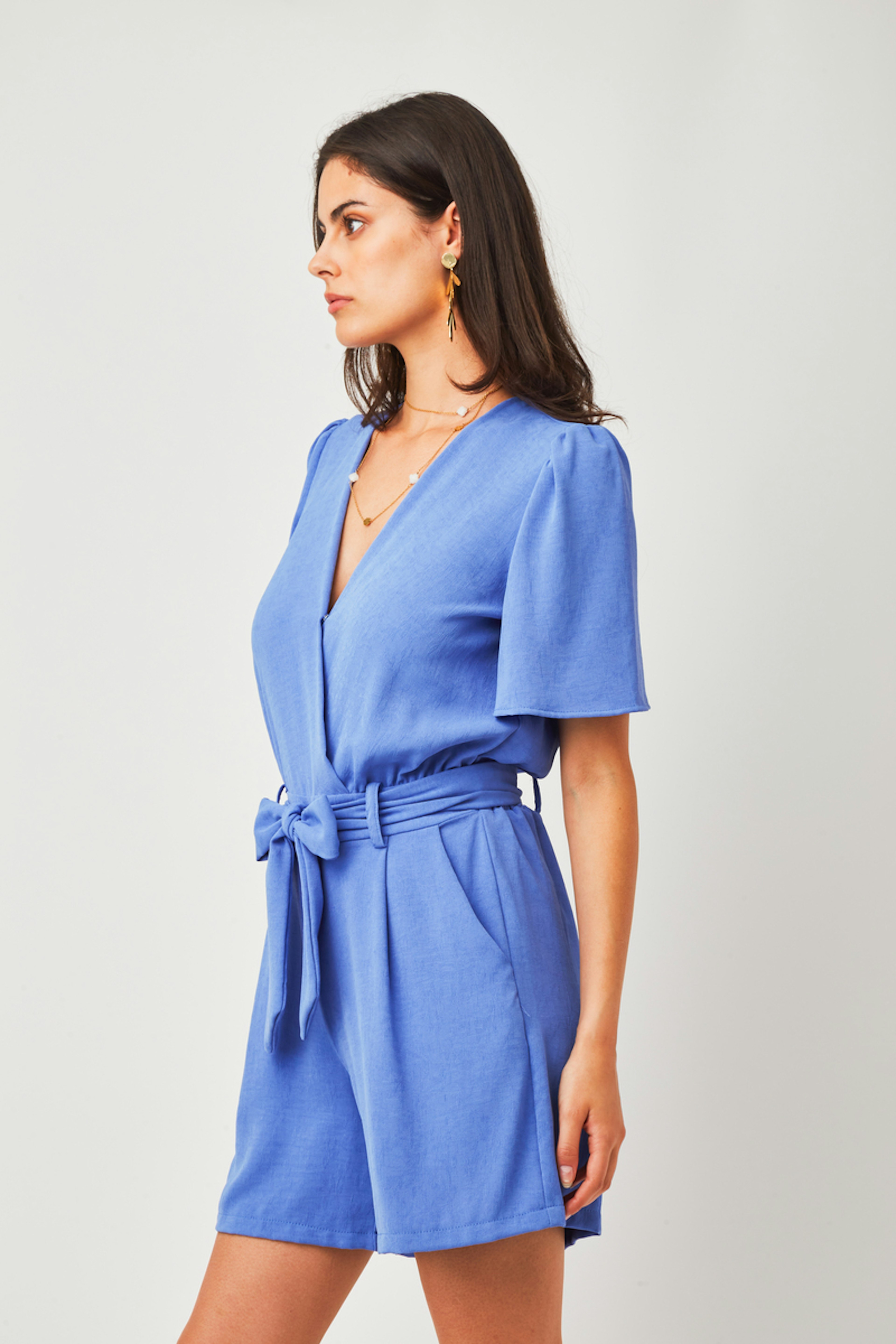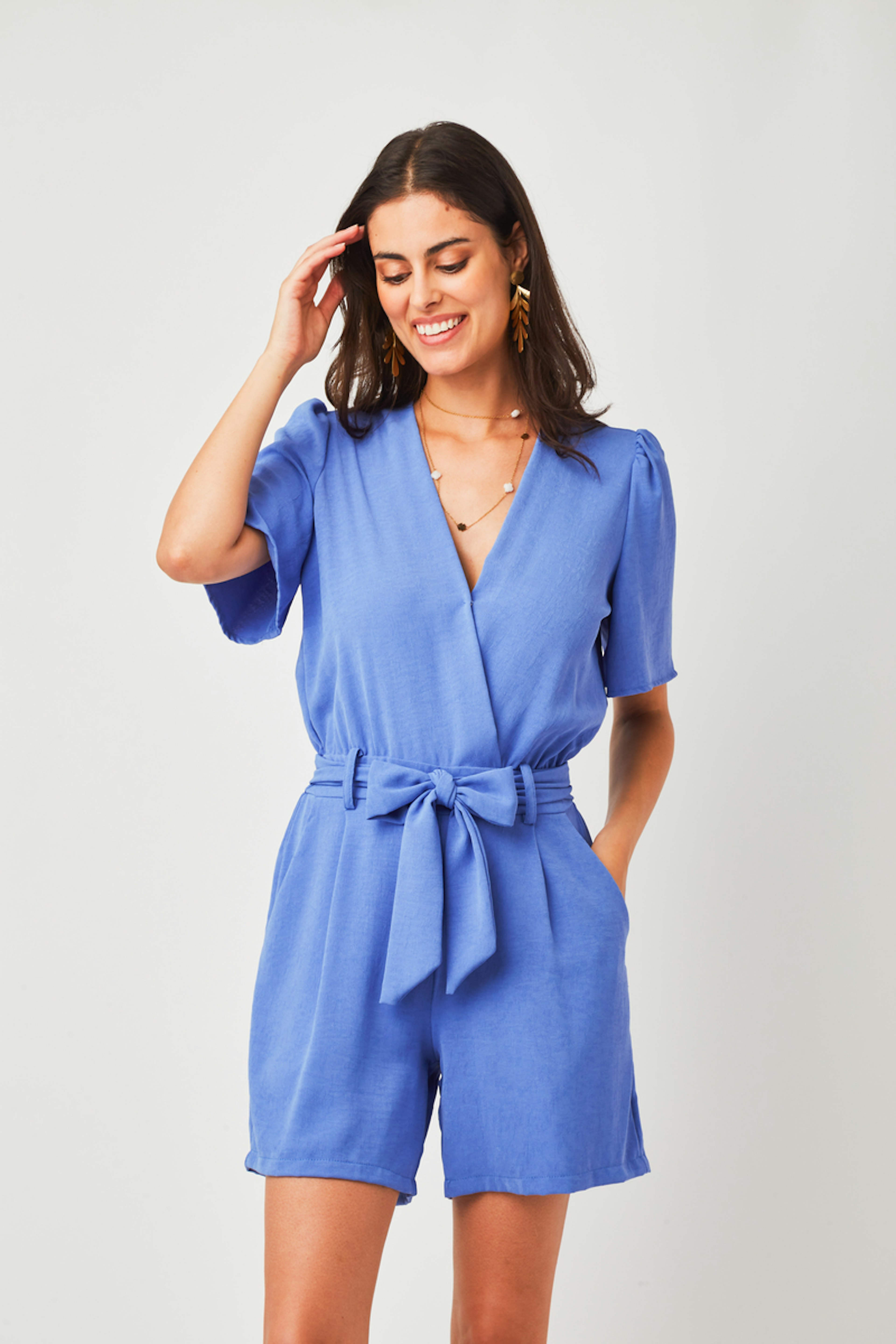 โข Combinaison short bleue โข Ceinturรฉe ร la taille โข Col en V โข Coupe portefeuille โข Manches courtes
