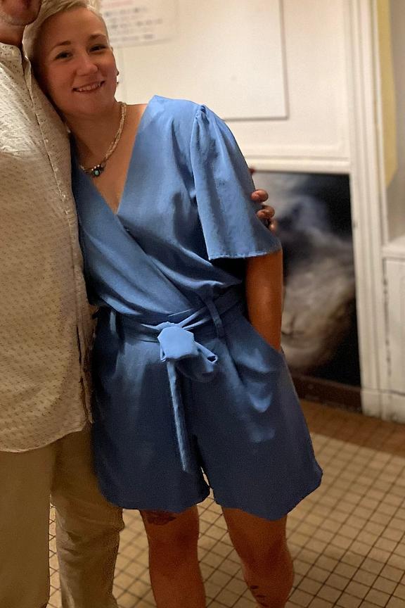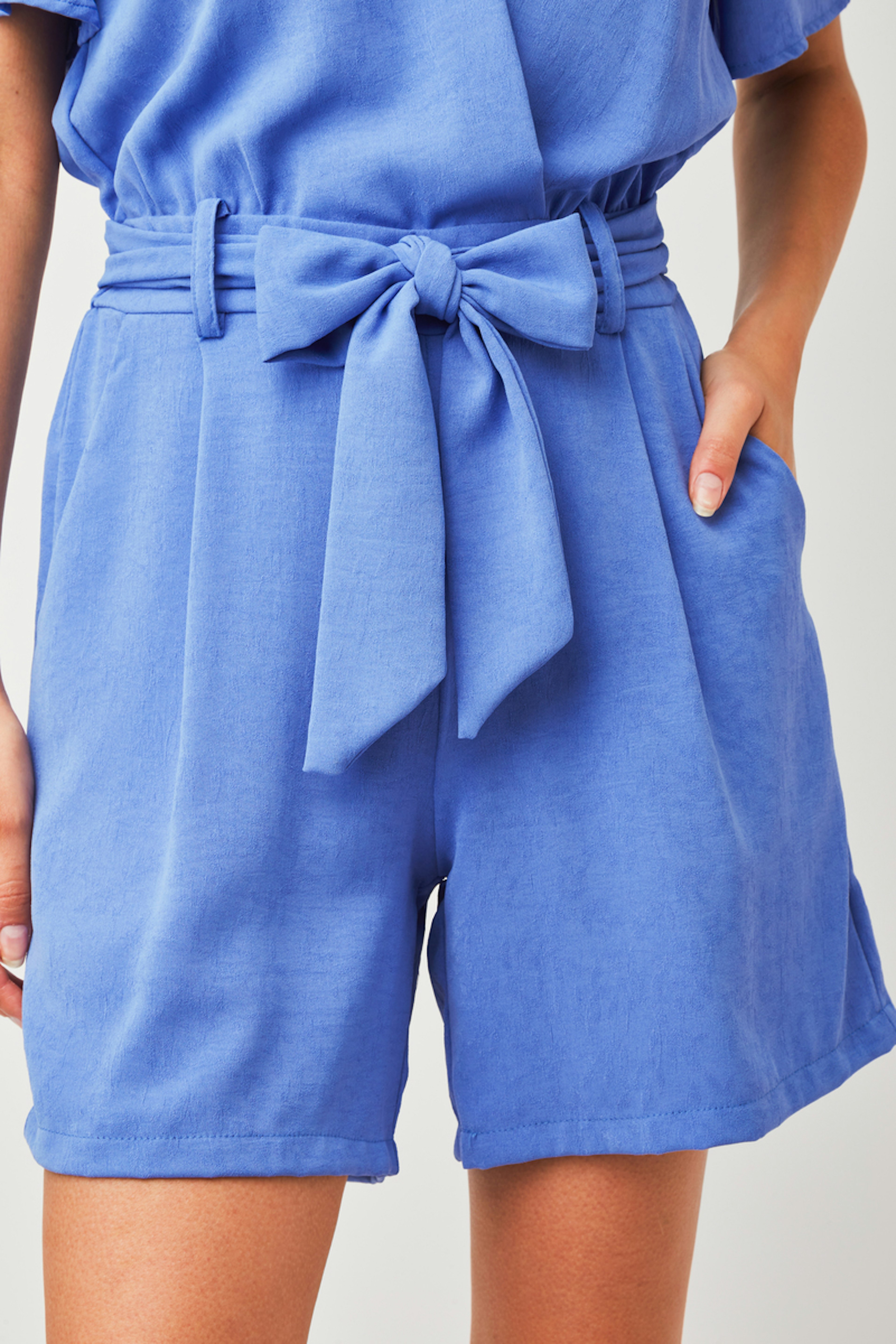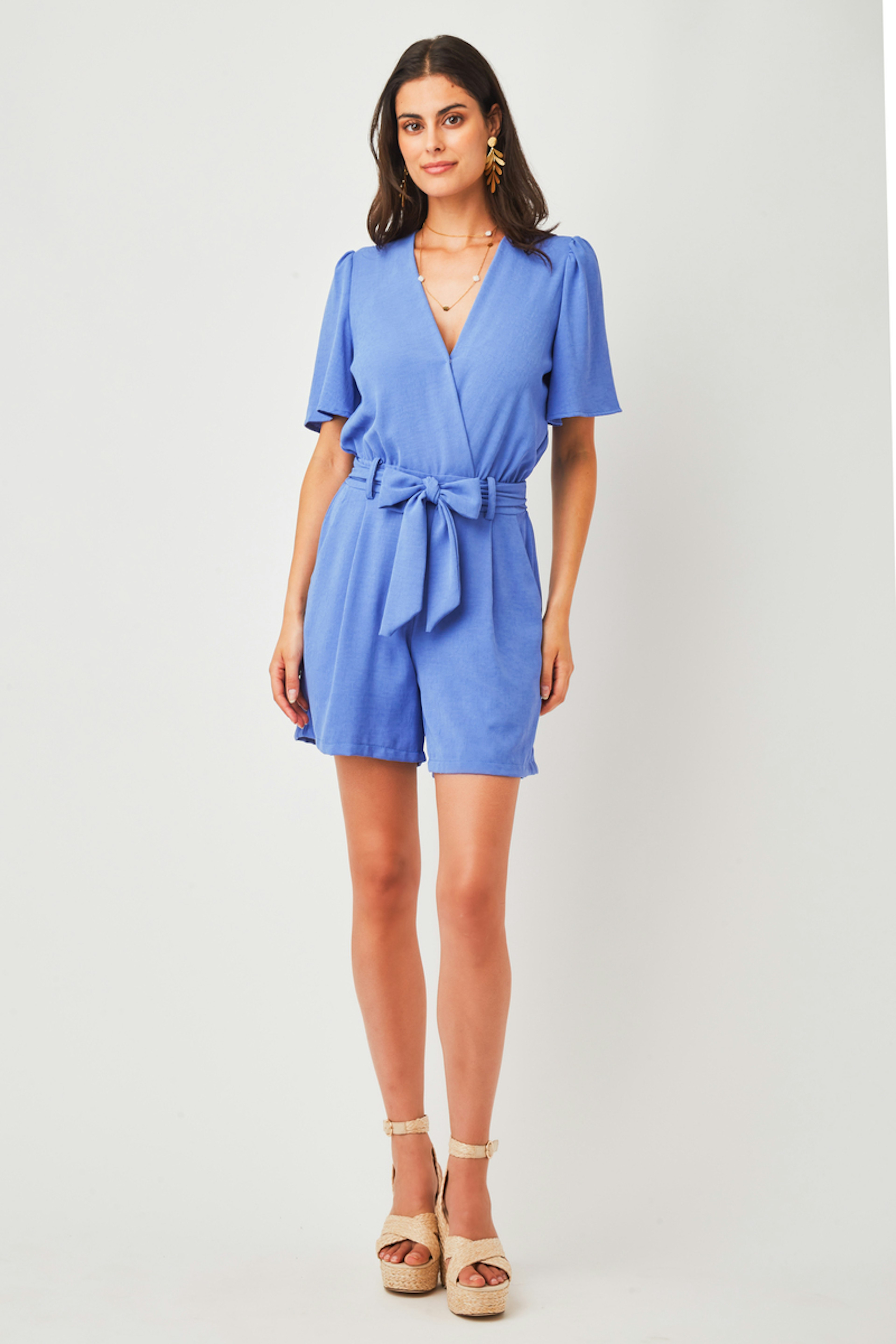 โข Combinaison short bleue โข Ceinturรฉe ร la taille โข Col en V โข Coupe portefeuille โข Manches courtes