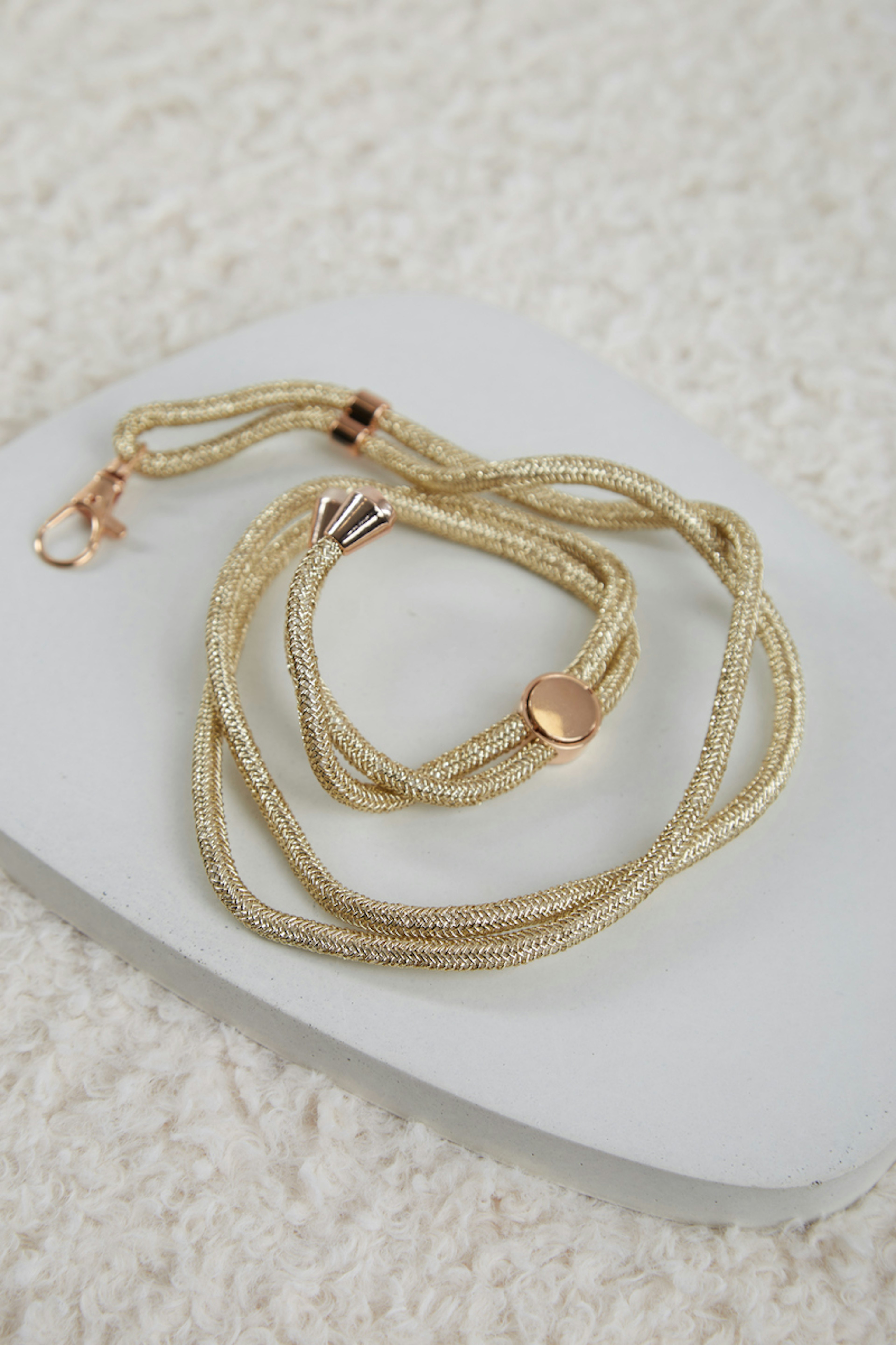 โข Cordon tressรฉ lisse โข Finitions dorรฉes : mousqueton et boule de serrage โข Tissus rigide ร insรฉrer dans la coque du tรฉlรฉphone afin de pouvoir utiliser le cordon โข Convient ร tous types de tรฉlรฉphone โข Couleurs : dorรฉe โข Longueur : 69 cm
