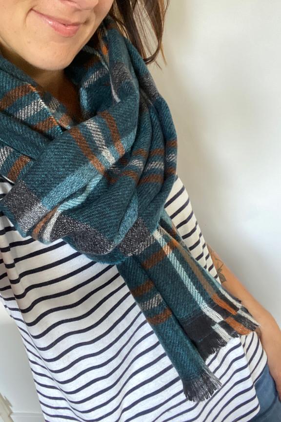 โ€ข Echarpe bleu ร  carreaux marrons et gris โ€ข Bords coupรฉs apparents โ€ข Fils mรฉtallisรฉs dorรฉs