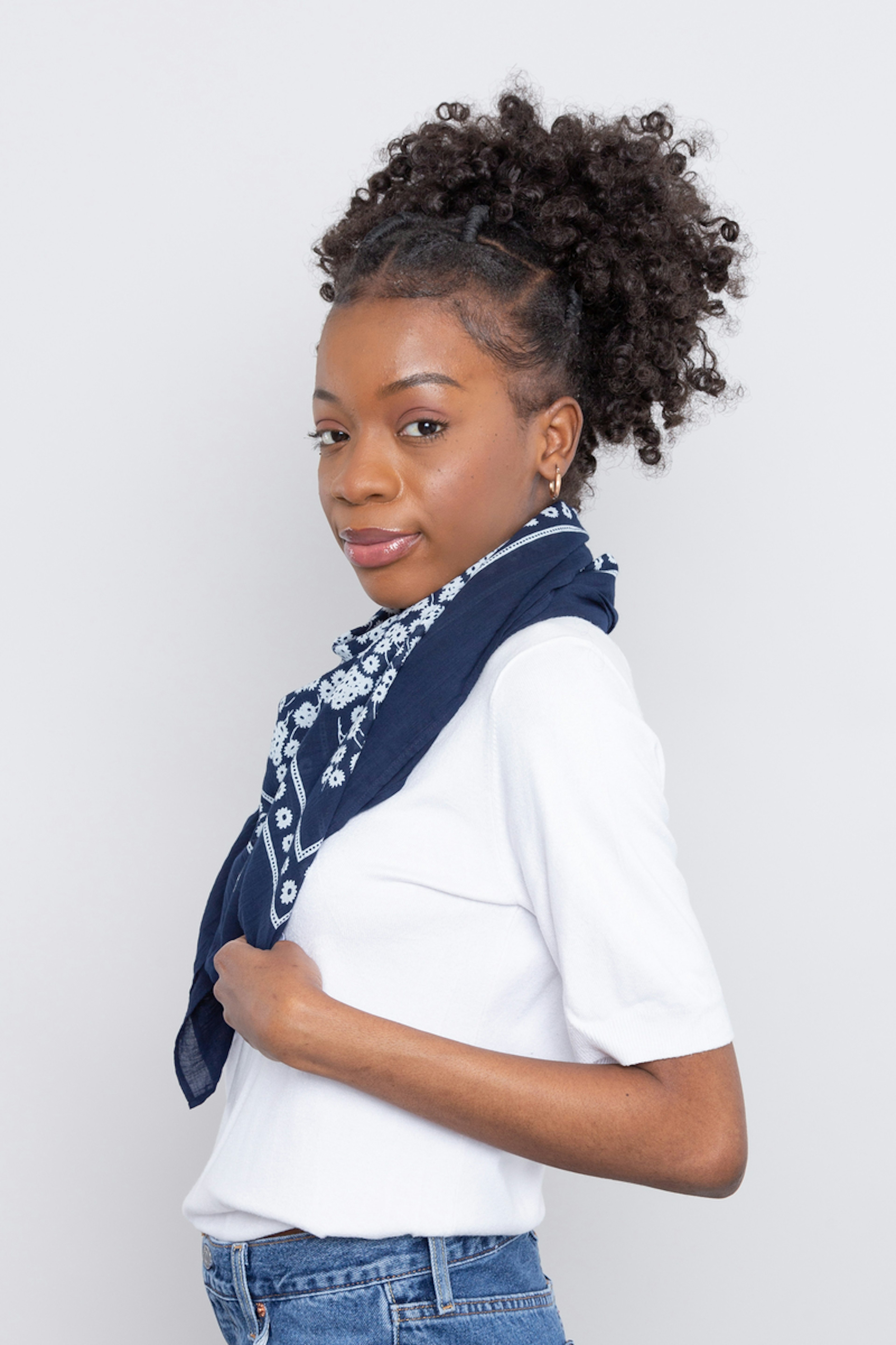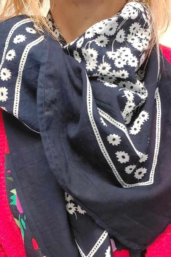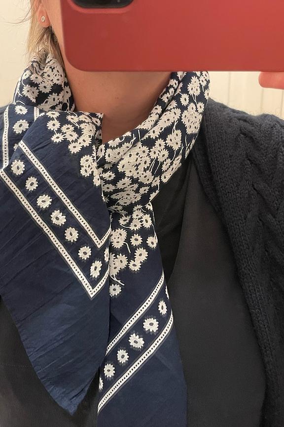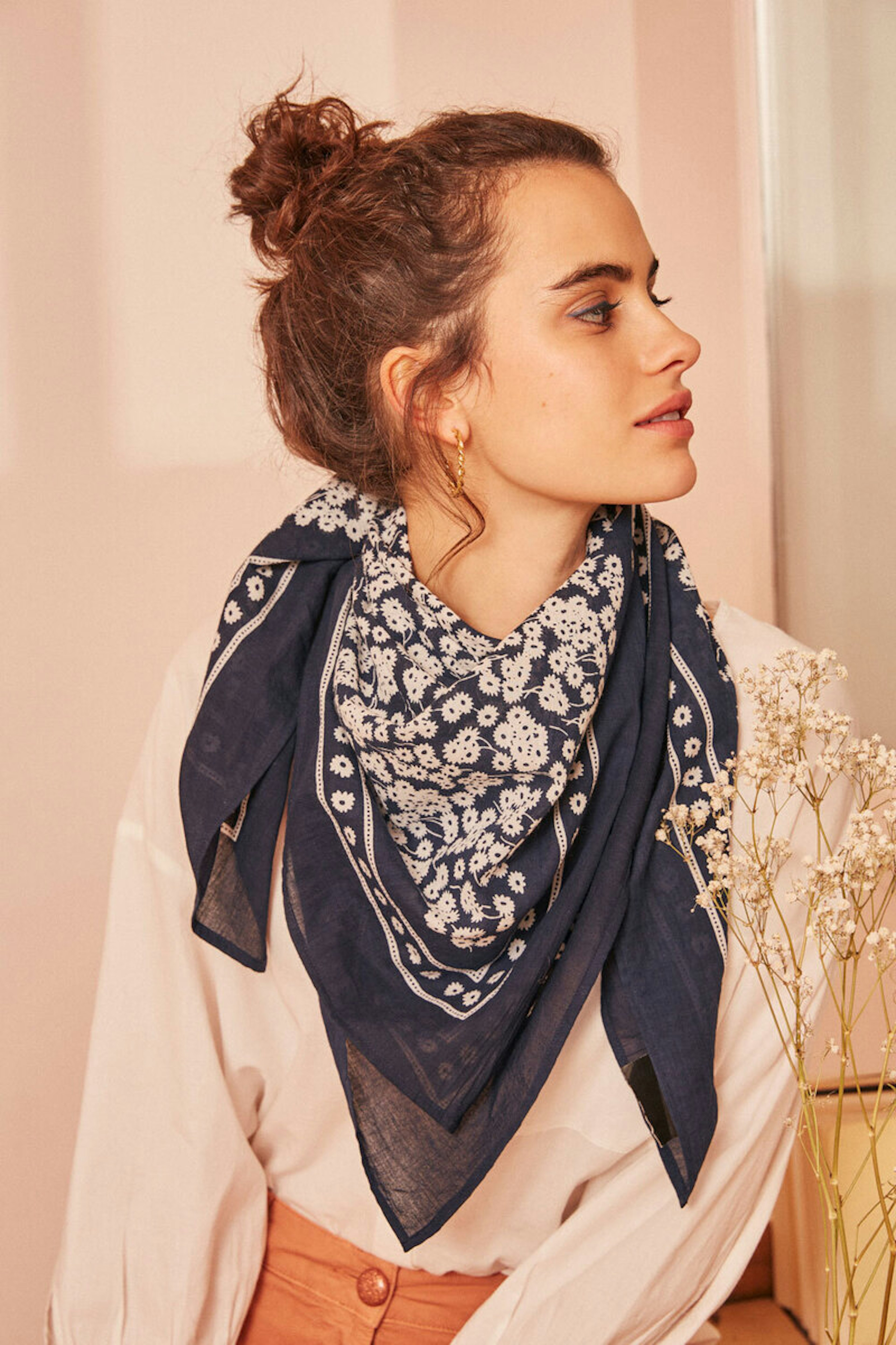 โข Foulard carrรฉ en coton imprimรฉ โข Imprimรฉ fleuri blanc sur fond marine โข Fabriquรฉ en Inde
