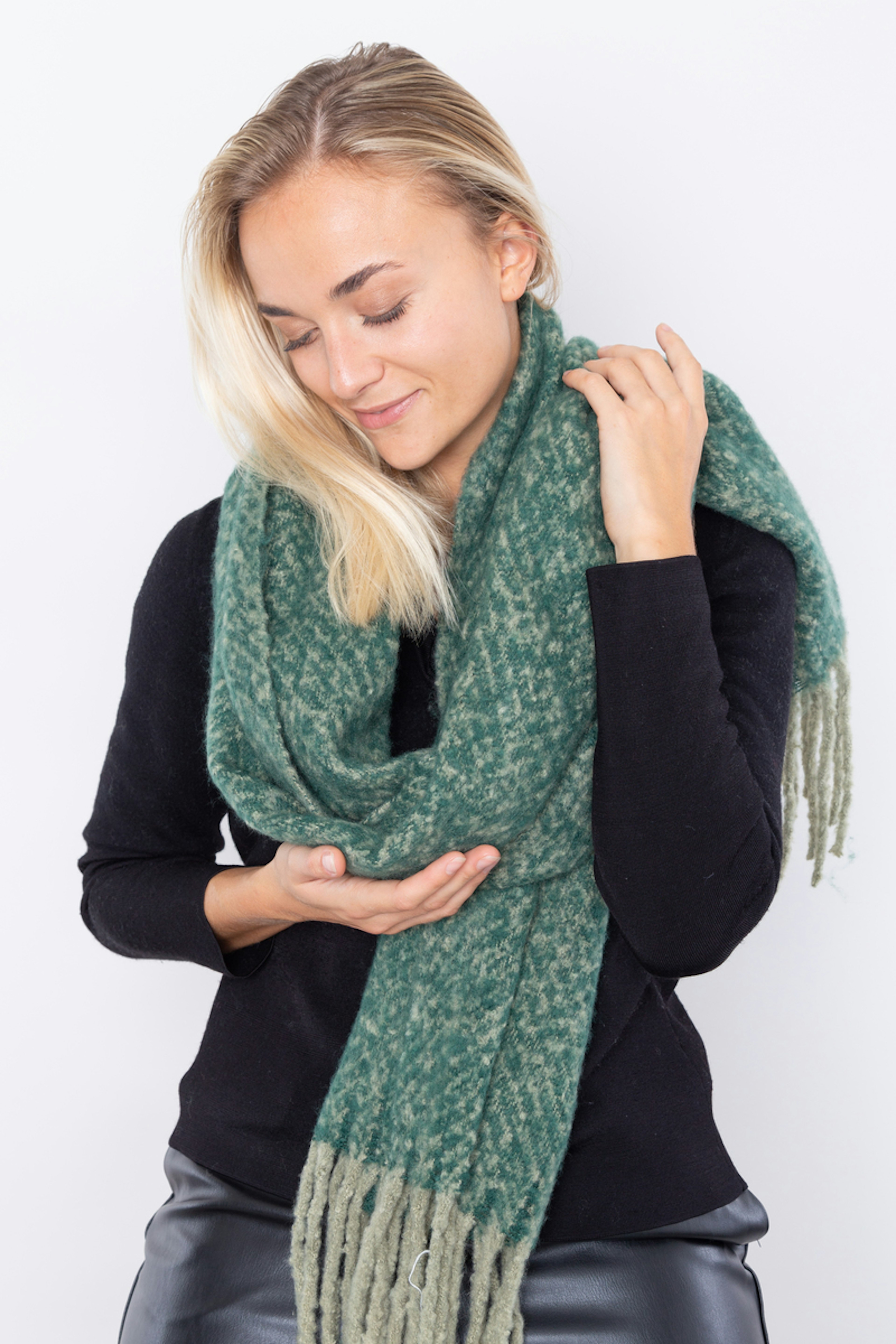 โข Echarpe รฉpaisse verte โข Franges sur le bas de l'รฉcharpe โข Dimensions : 195x60 cm โข Composรฉe ร 50% de polyester recyclรฉ