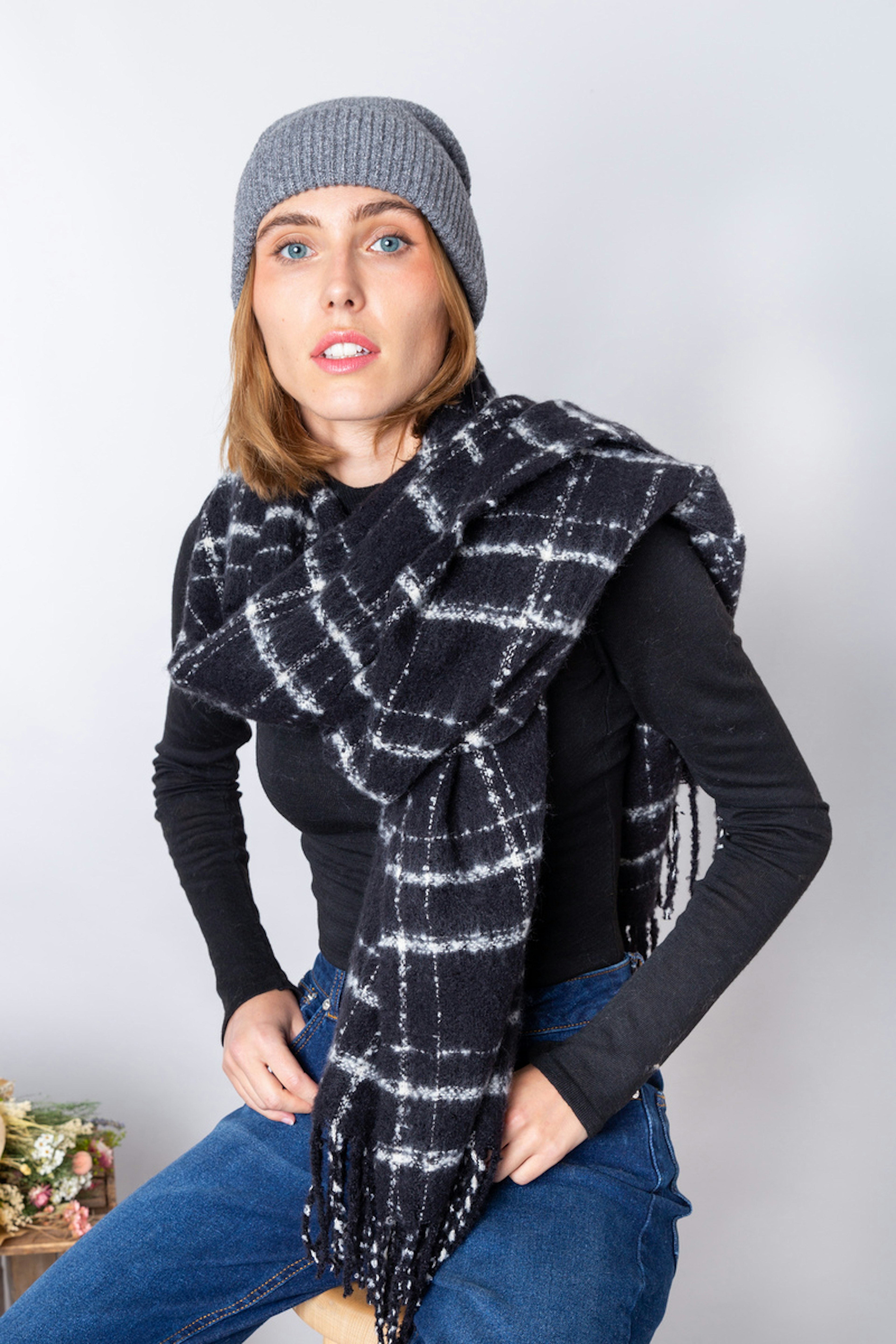 โข Echarpe oversize noire ร carreaux โข Dimensions : 180 x 65 cm โข Contient du polyester recyclรฉ