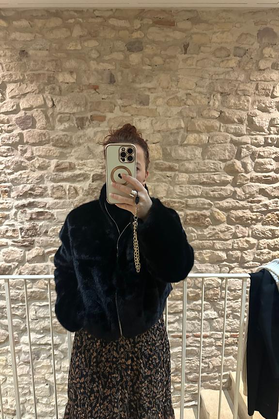 โGros coup de cลur pour cette veste !!! La coupe courte est parfaite, la veste est tellement douce et la fausse fourrure est trรจs bien faite (ne fait absolument pas cheap). Lโintรฉrieur est en cuir retournรฉ, elle tient chaud et mรชme les poches ร lโintรฉrieur ont de la fourrure. Bref, elle est super !!โ