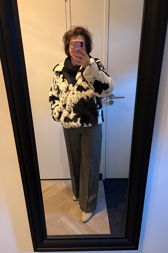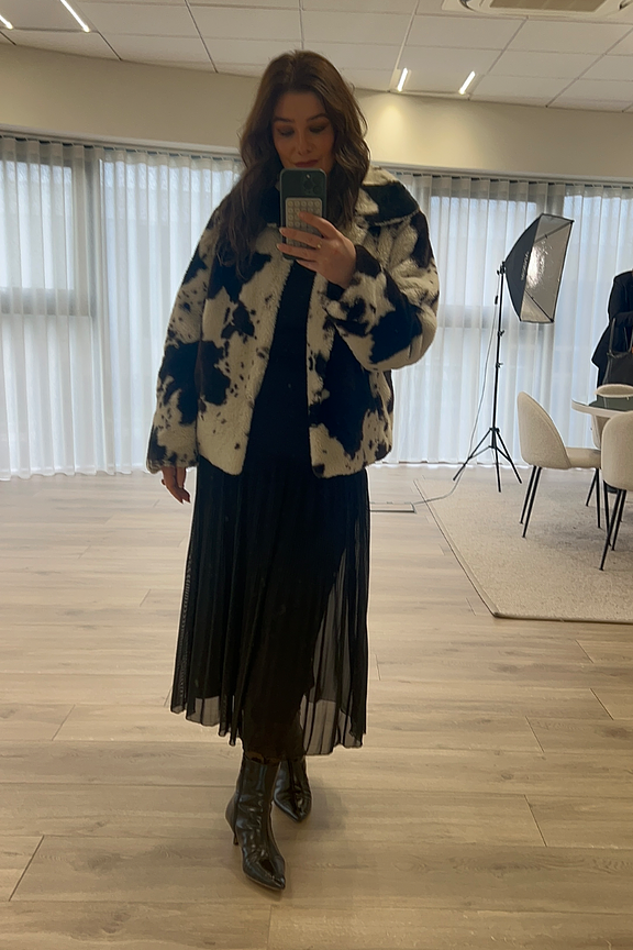Associez cette veste en fourrure synthétique à un col roulé noir et un jean slim pour un look chic hivernal. • Veste en fourrure synthétique • Col italien élégant • Manches longues douillettes • Imprimé audacieux • Entièrement doublé pour plus de chaleur
