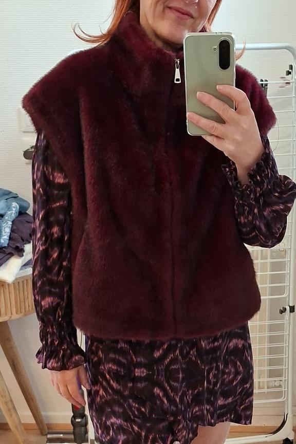 Portez cette veste douillette avec un pull noir et un jean slim pour un look chic et confortable en hiver. Ajoutez des bottines élégantes pour parfaire votre style. • Veste sans manches • Coupe ample • Col montant • Fermeture éclair • Texture duveteuse