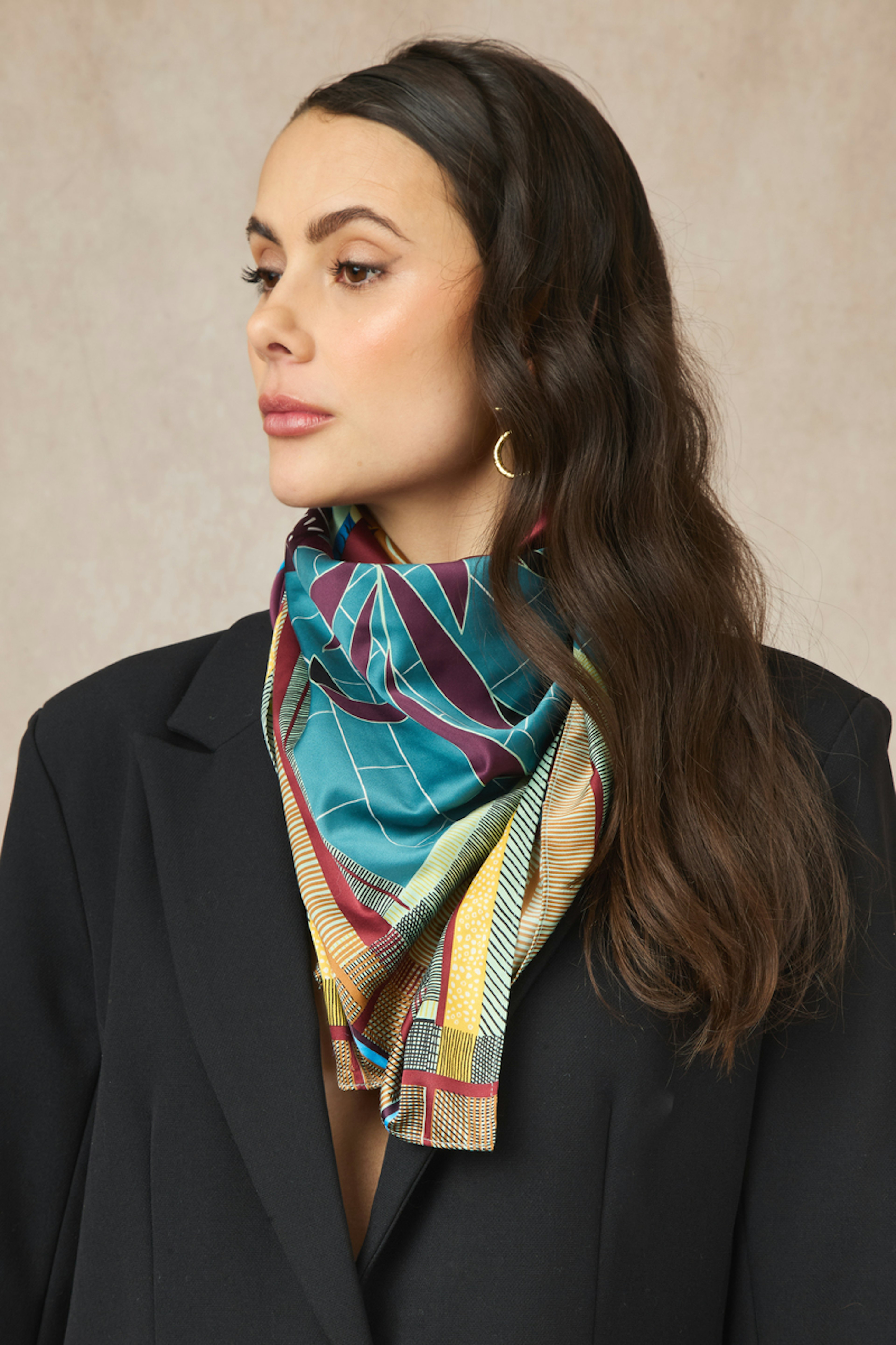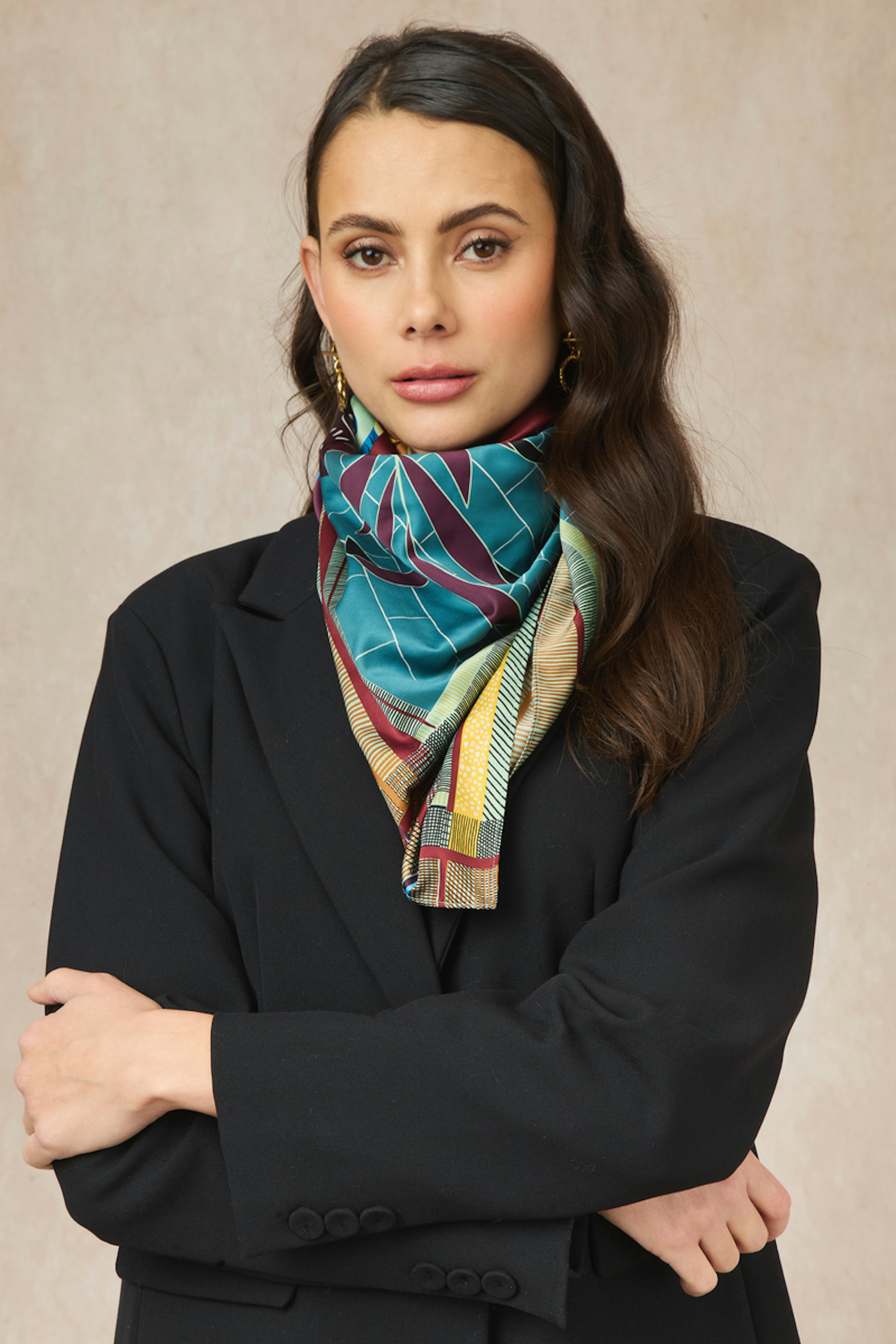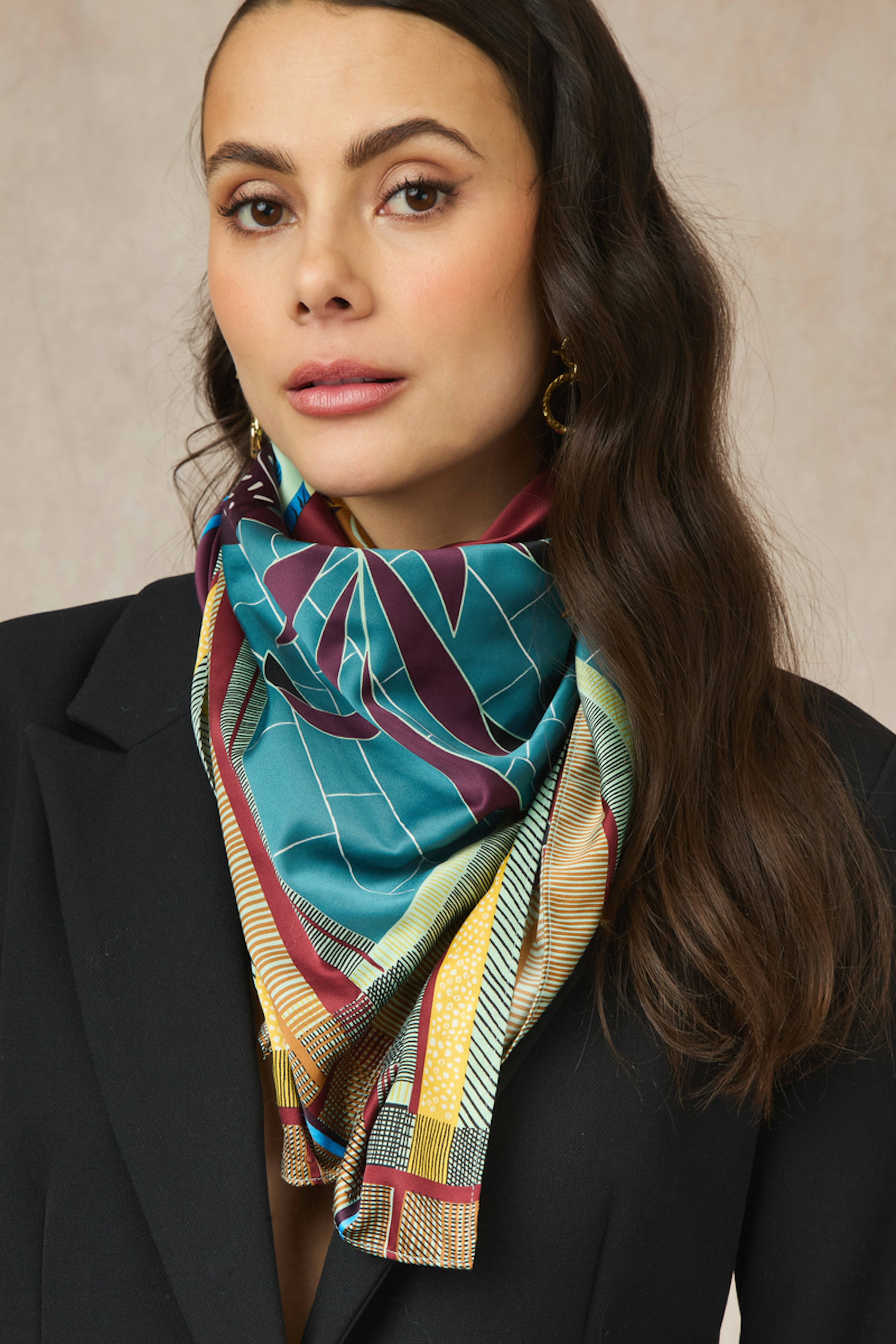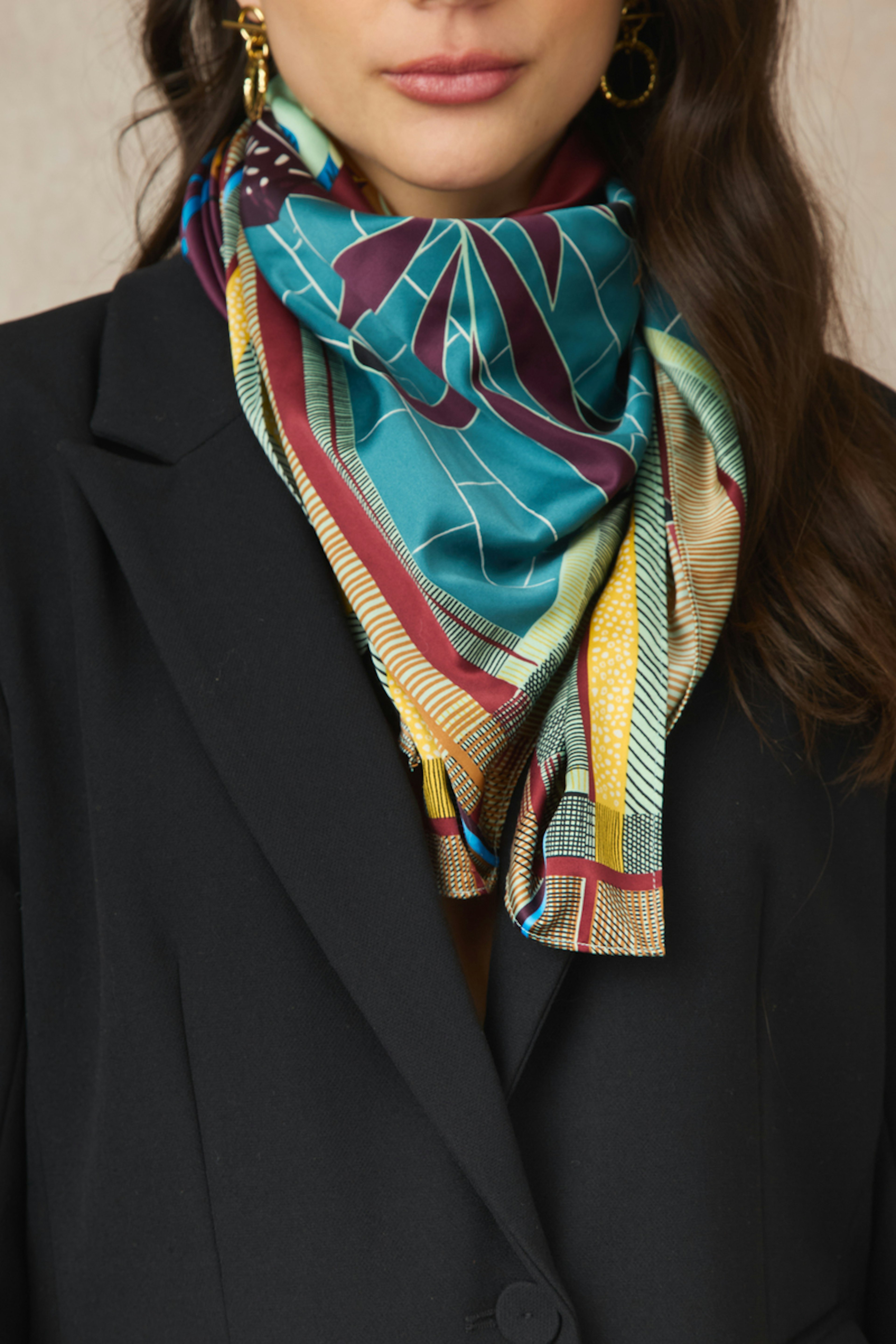 โ€ข Foulard Satome โ€ข Format moyen โ€ข Graphisme : portrait d'une antillaise sur fond de dรฉcor des รฎles โ€ข Dans les tons bordeaux, orange, rose et fuchsia