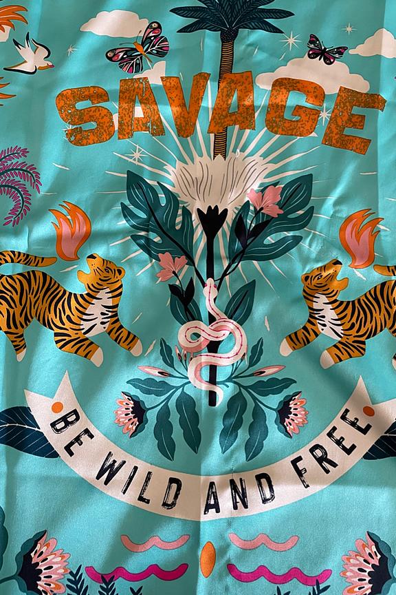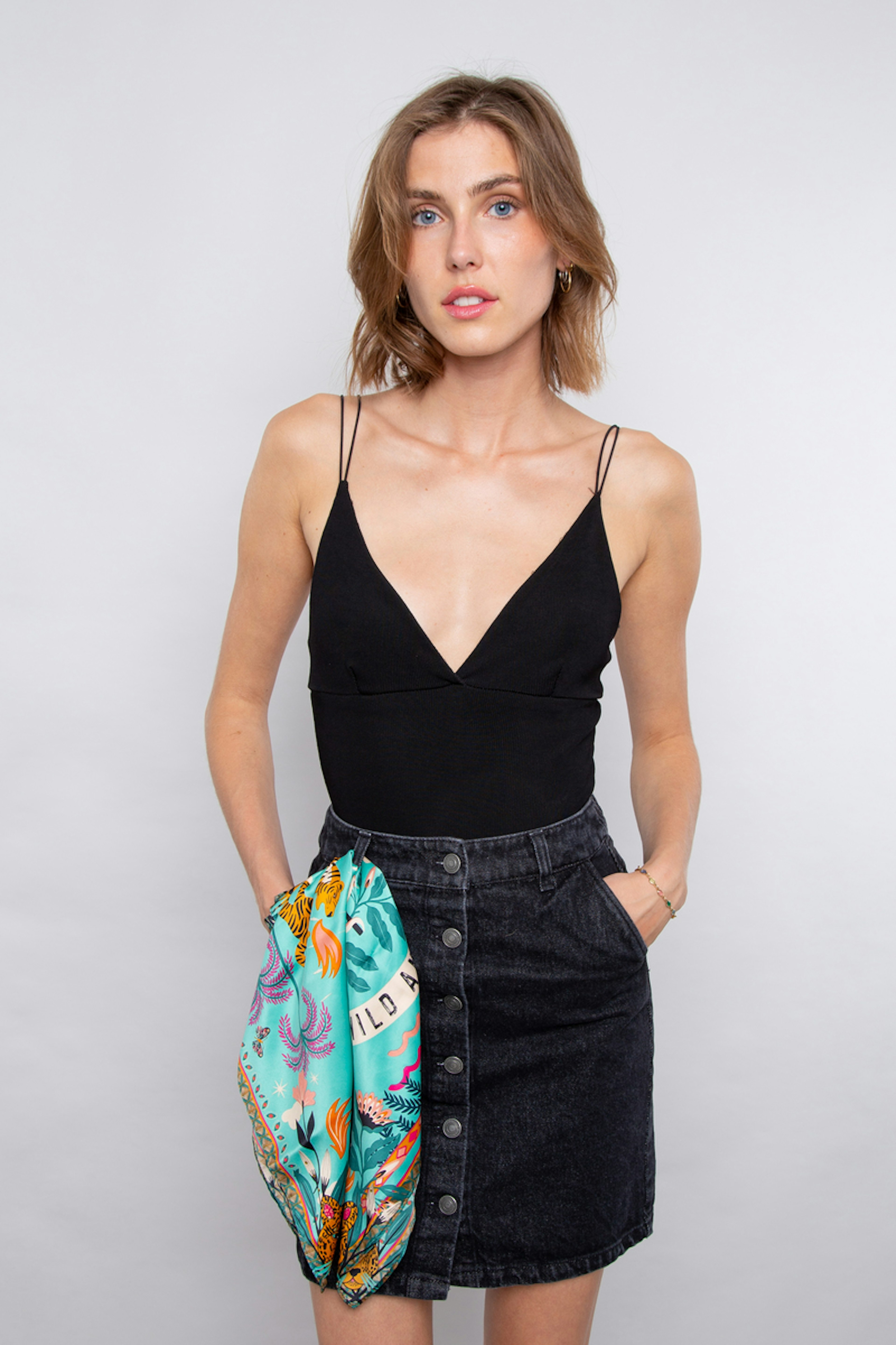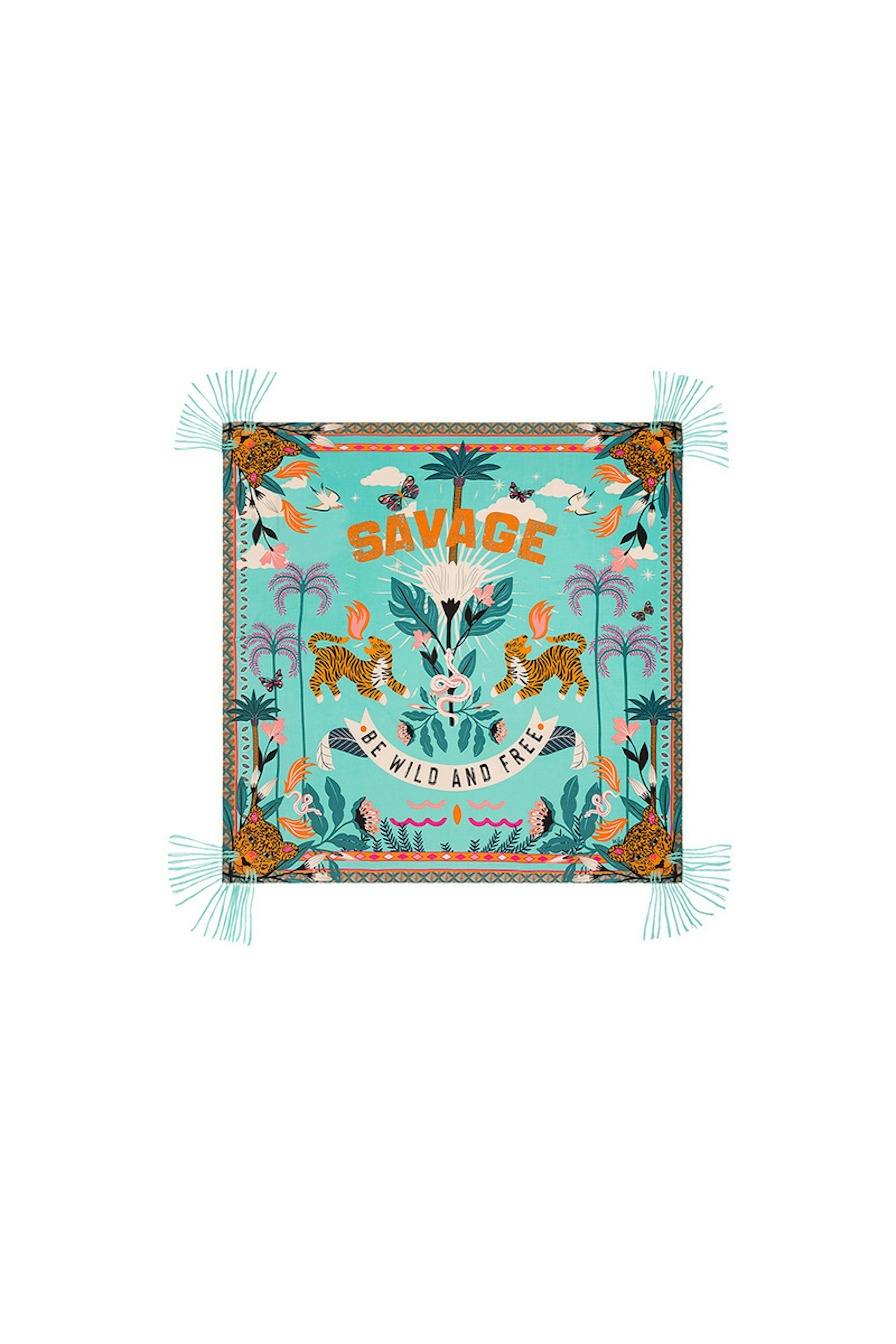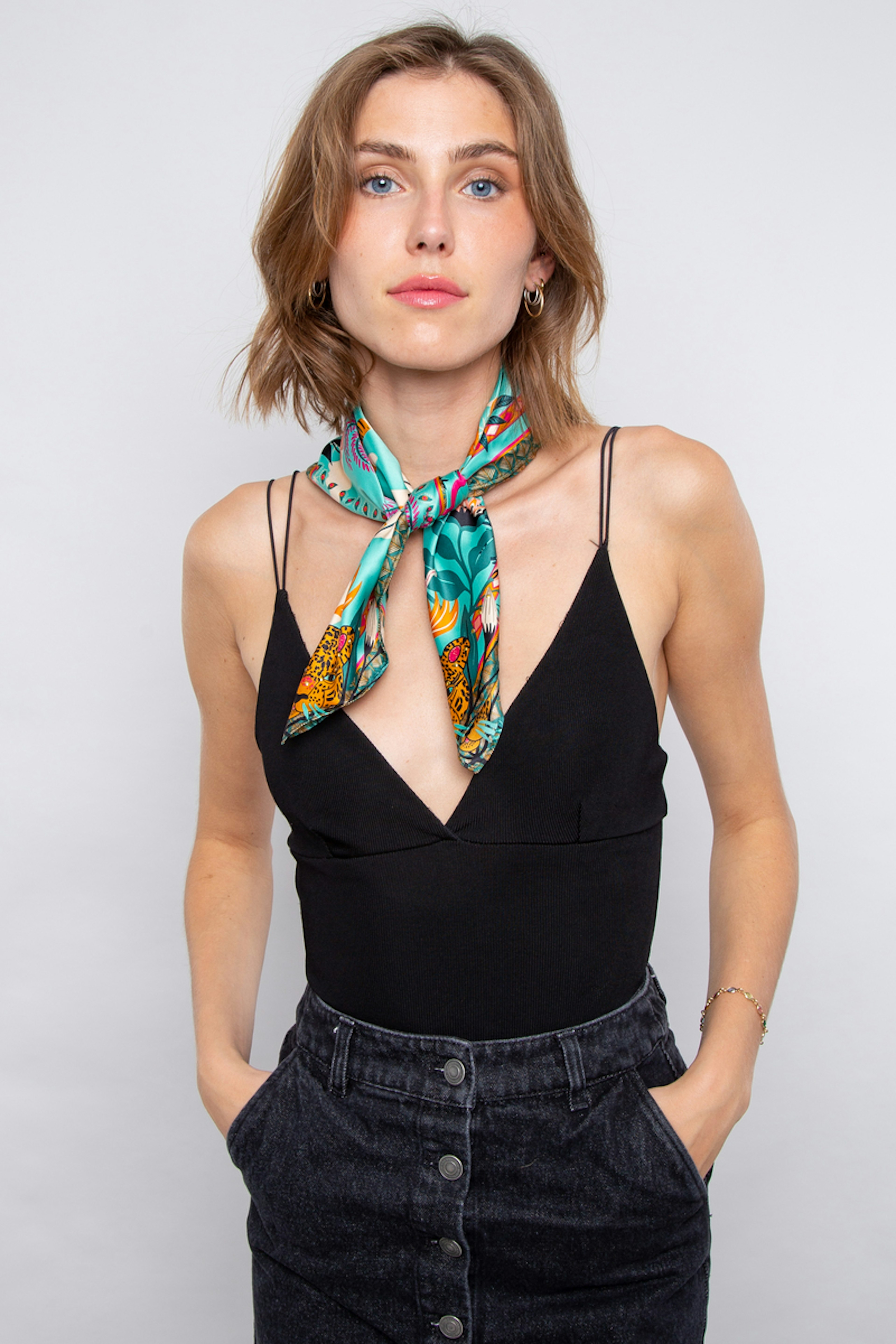 โข Foulard imprimรฉ colorรฉ โข Paysage tropical dรฉcorรฉ de palmier fantastique, de panthรจres graphiques, sur un thรจme qui se veut sauvage โข Peut รชtre portรฉe en bandeau pour les cheveux mais aussi en petit foulard de cou ou encore autour de votre sac โข Dimensions : 55x55cm