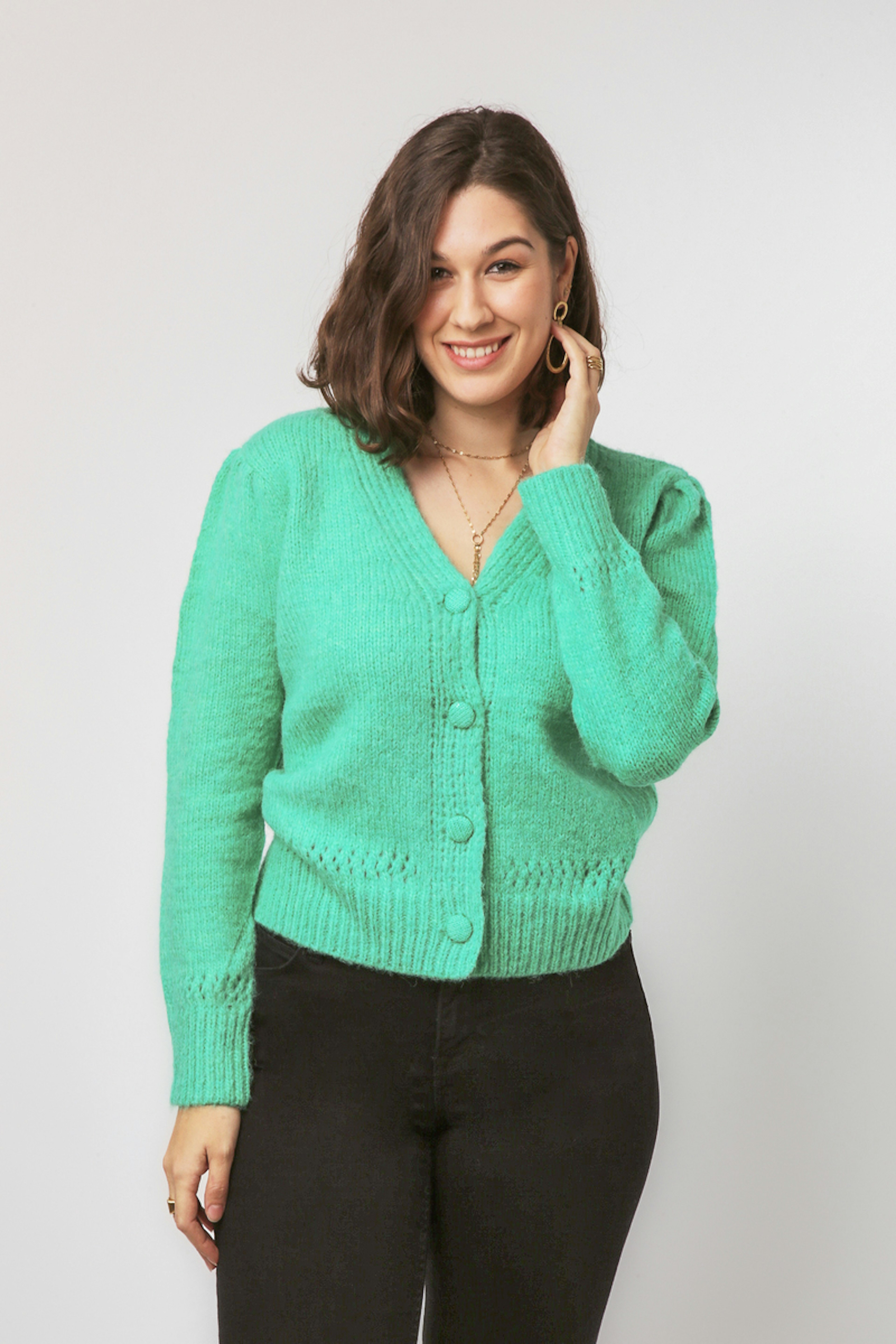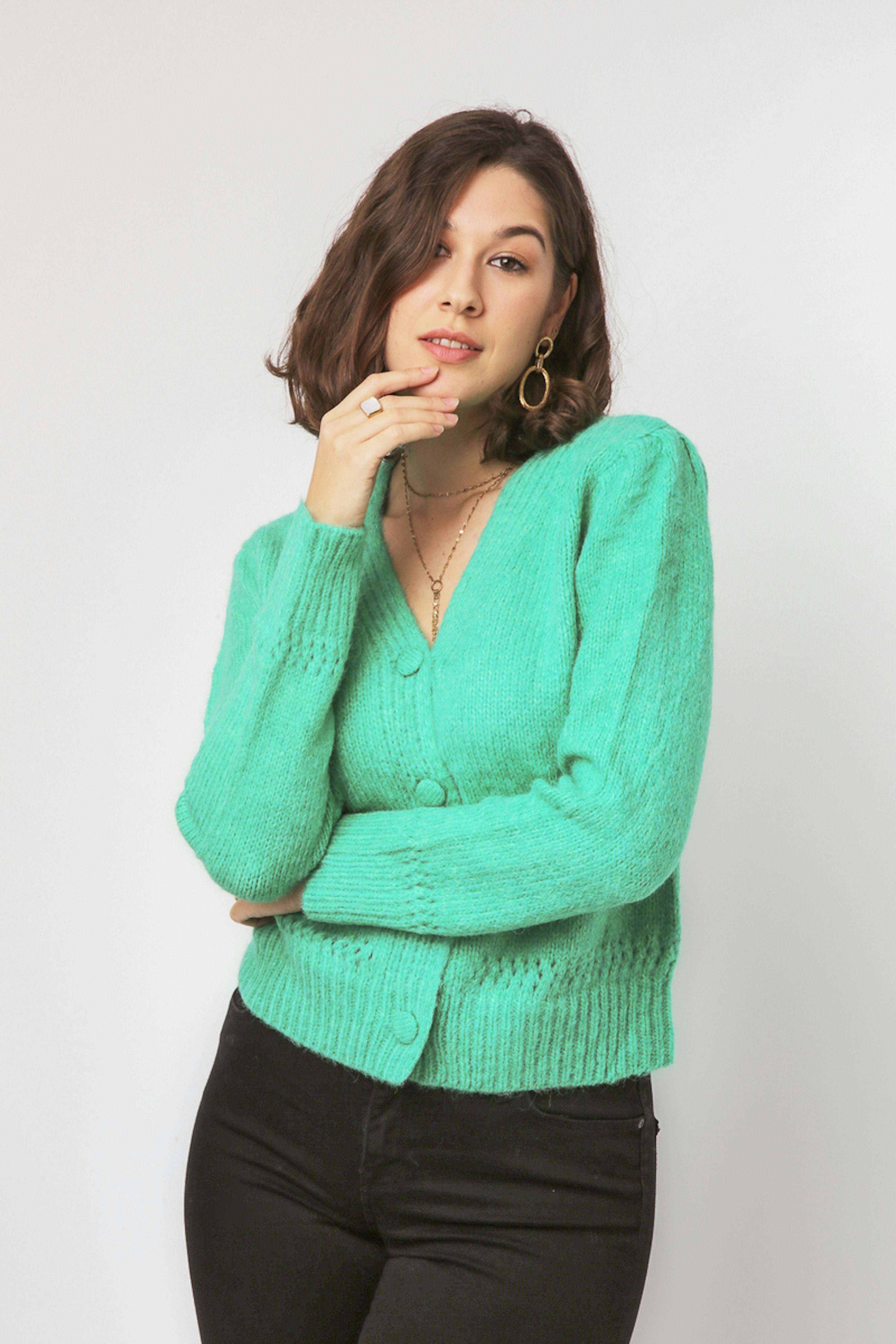 โ€ข Gilet vert ร  manches longues โ€ข Dรฉcolletรฉ en V โ€ข Boutonnage sur le devant โ€ข ร‰paules tombantes โ€ข Manches longues โ€ข Bordures cรดtelรฉes โ€ข Tricot en point de goutte sur l'ensemble โ€ข Matรฉriau texturรฉ โ€ข Tissu doux au toucher โ€ข Coupe classique