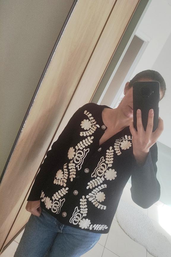 Pour un look hivernal cosy et élégant, associez ce gilet avec un jean taille haute et des bottines en cuir. Parfait pour la saison froide ! • Gilet avec motifs brodés • Manches longues • Fermeture par boutons • Col rond • Détails floraux • La taille unique convient du 34 au 40