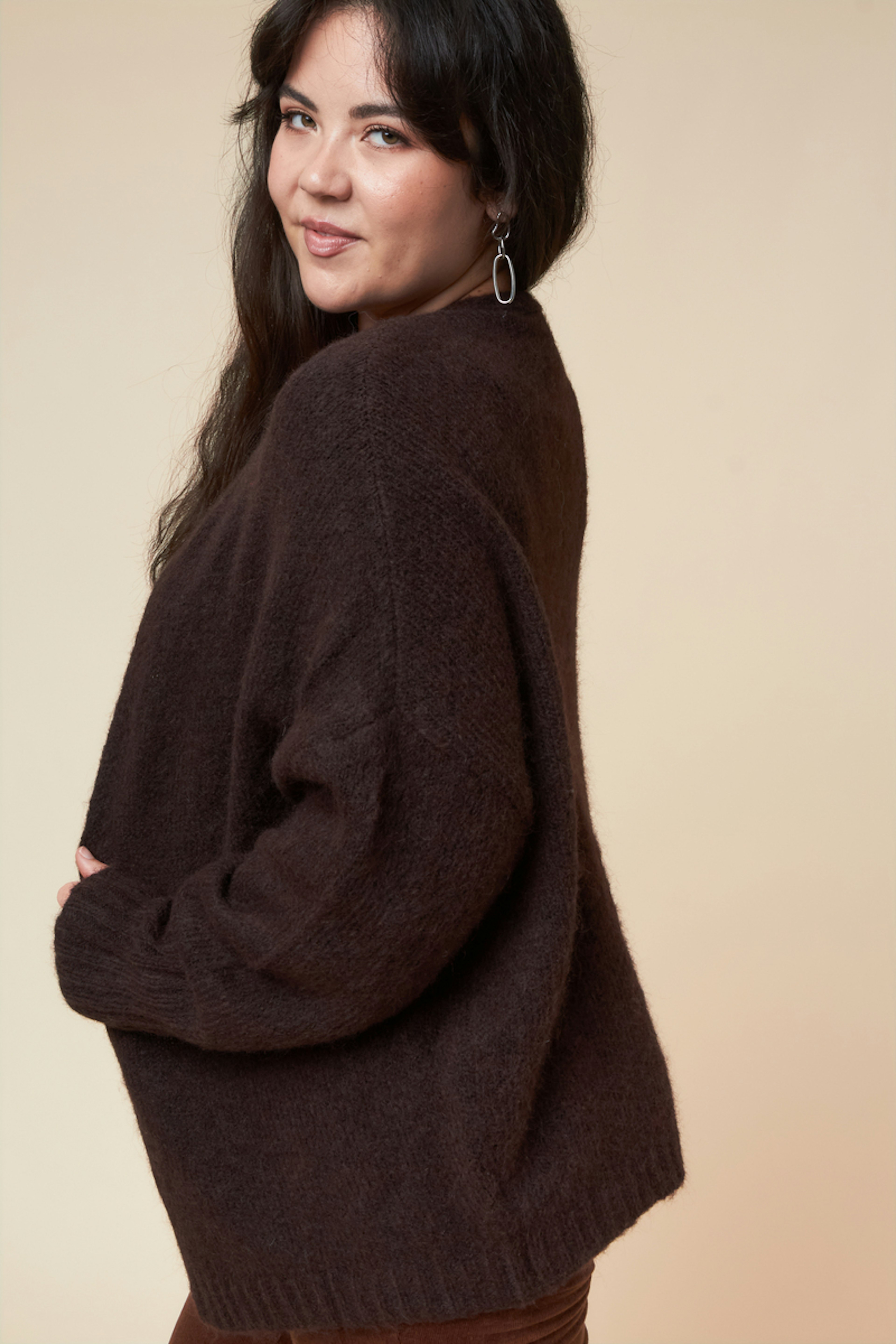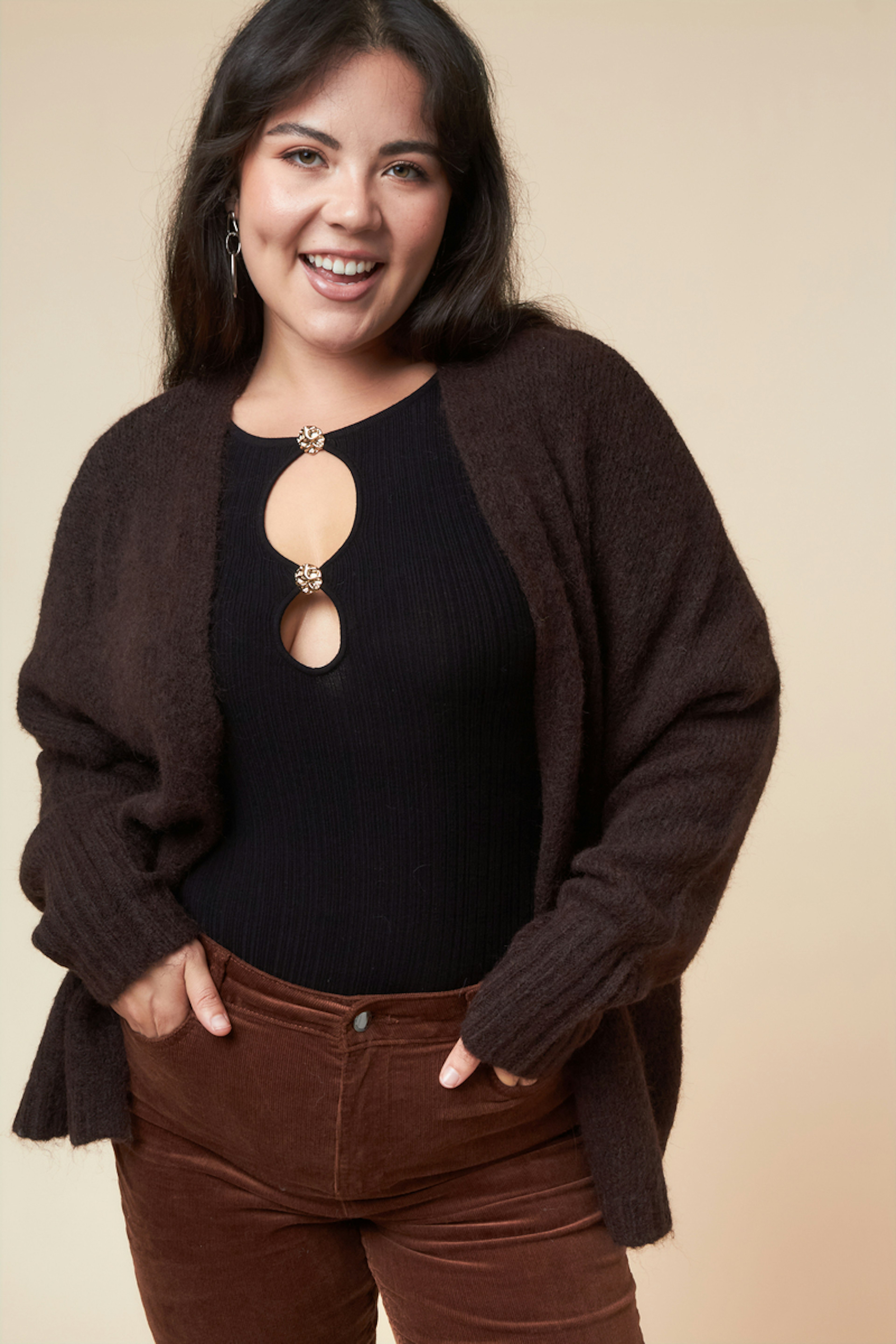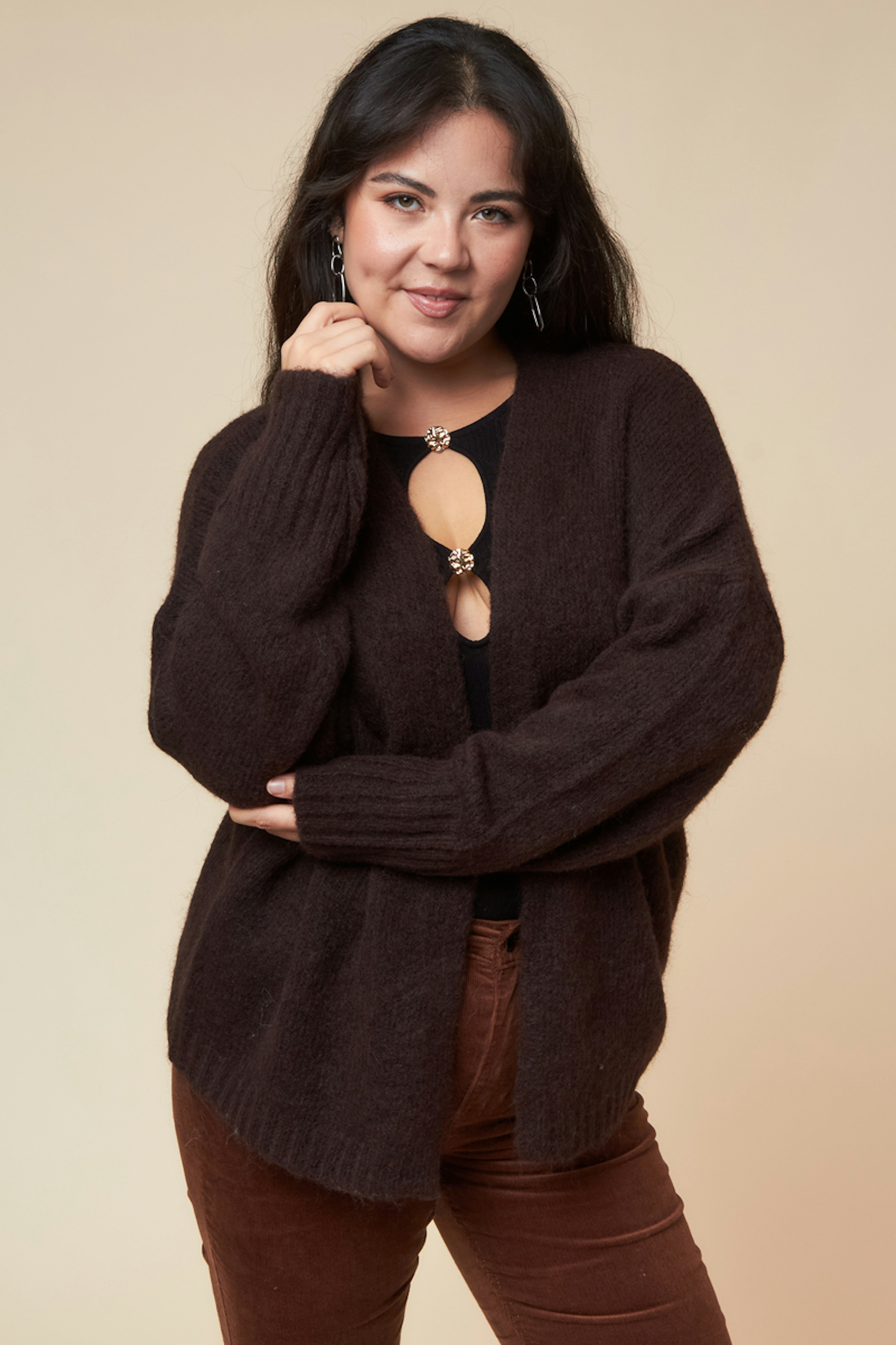 Associez ce gilet cosy à un jean skinny noir et des bottines pour un look chic et décontracté cet hiver. • Gilet en laine mélangée • Manches longues • Coupe ouverte • Texture douillette • Couleur chocolat