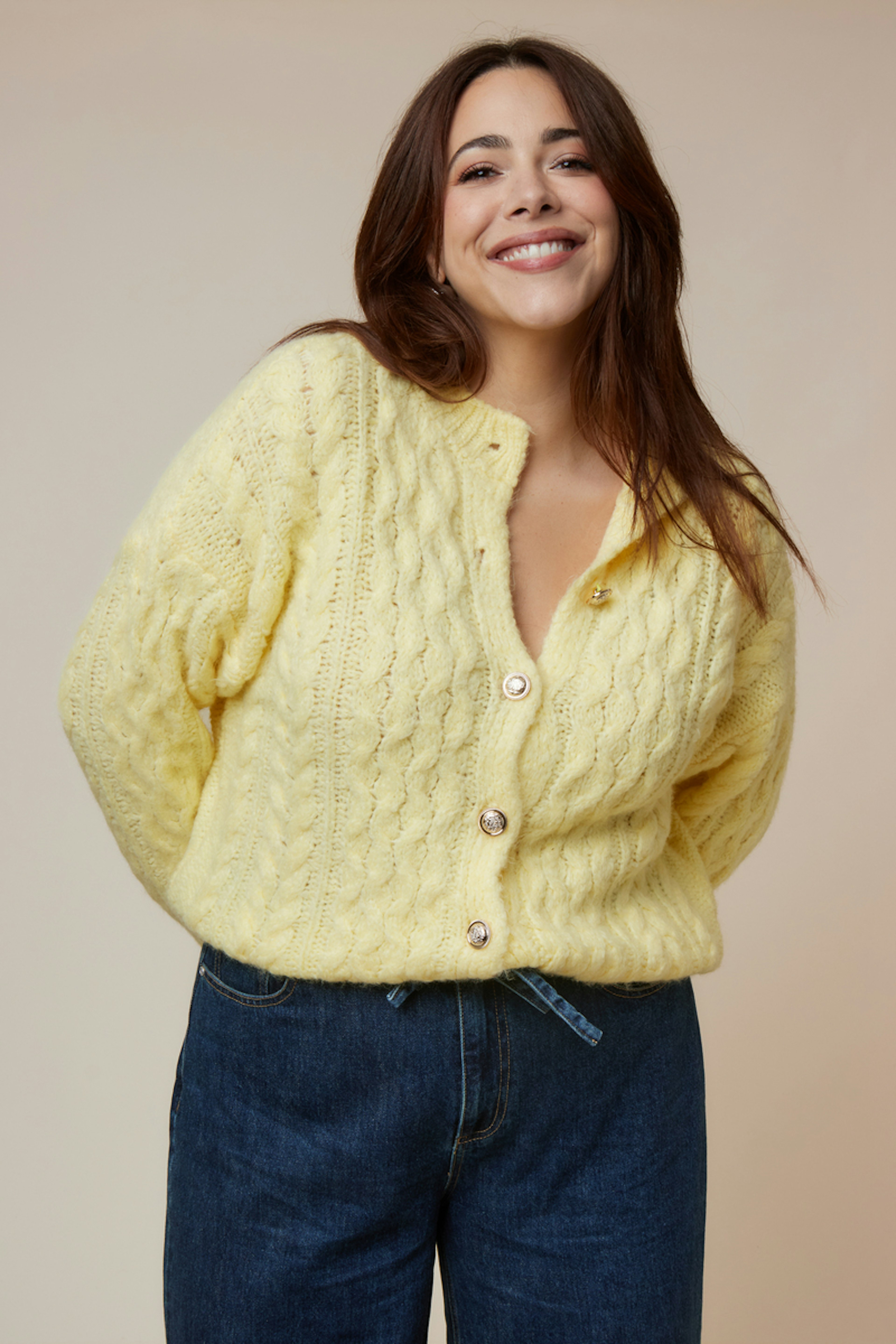 Associez ce gilet doux à un jean brut et des bottines pour une allure cosy et chic. Idéal pour contrer le froid hivernal avec élégance. • Gilet torsadé • Col rond • Manches longues • Boutons décoratifs • Jaune lumineux