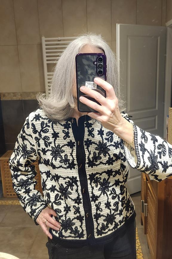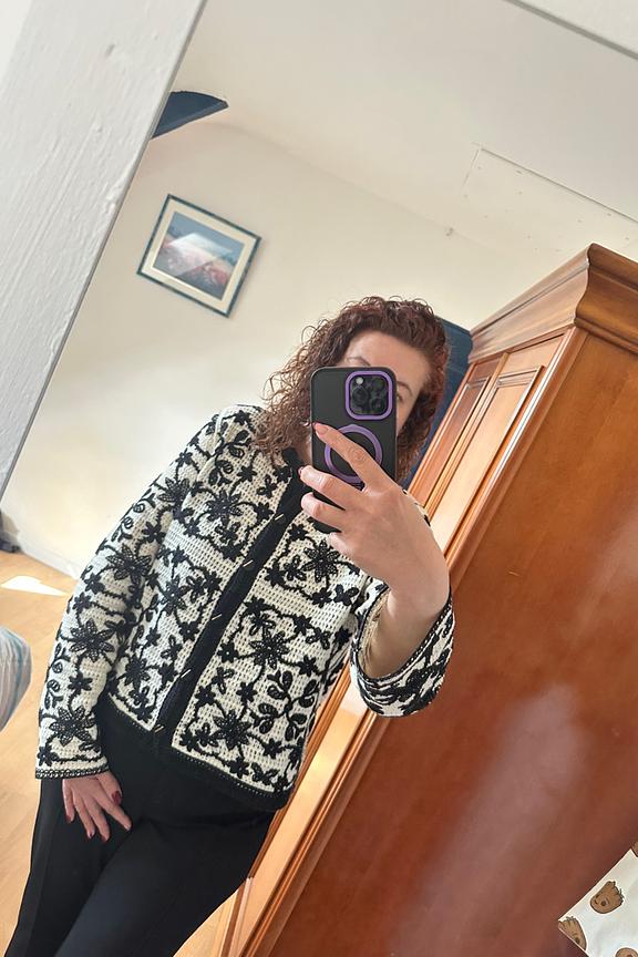 Un gilet chic pour l'hiver, à associer avec un jean brut et des bottines noires pour une allure élégante. • Gilet à motif • Coupe cintrée • Manches longues • Fermeture boutonnée • Broderies florales