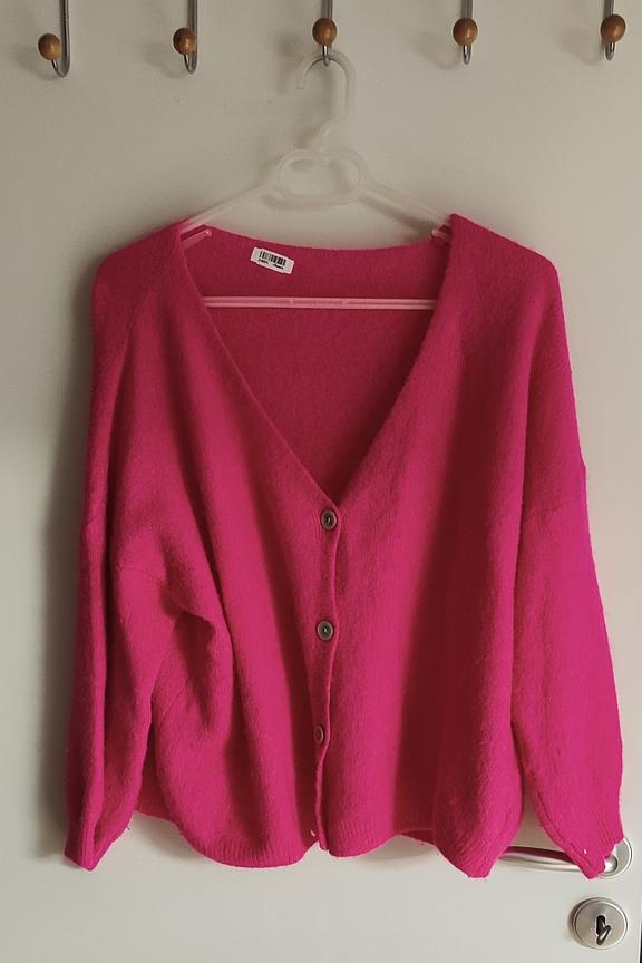 Ajoutez une touche de chaleur ร  votre tenue avec ce gilet rose, idรฉal ร  superposer sur une robe lรฉgรจre, parfait pour les journรฉes d'hiver. Associez-le ร  des bottines pour un look chic et cosy. โ€ข Gilet en alpaga fushia โ€ข Coupe ample โ€ข Manches longues โ€ข Fermeture ร  boutons โ€ข Teinte rose vibrante