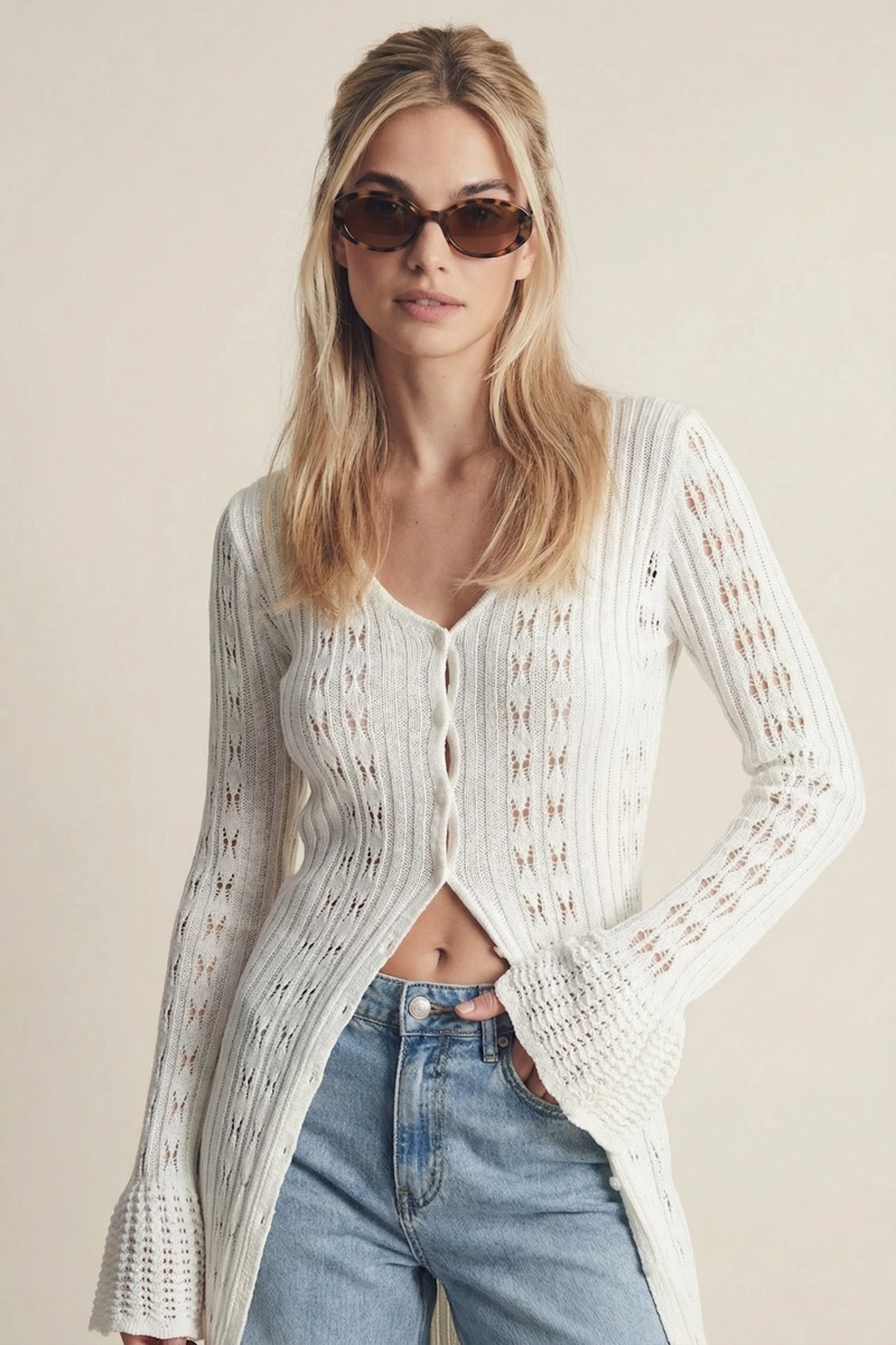 Associez ce gilet en maille à un jean ajusté et des sandales à lanières pour une allure estivale chic et décontractée. • Gilet long en maille transparente • Col en V flatteur • Manches longues évasées • Coupe longue ouverte devant • Motif ajouré élégant