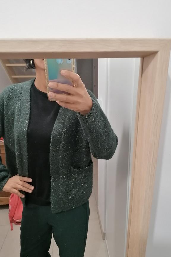 โข Cardigan ร manches longues vert โข Maille avec effet dorรฉ โข Poignets resserrรฉs โข Prรฉsence de 2 poches sur les cรดtรฉs