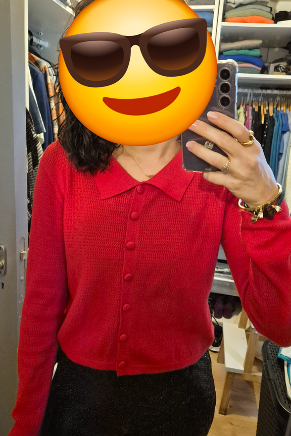 Pour un look chaleureux et รฉlรฉgant cet hiver, associez ce gilet rouge avec un pantalon noir et des bottines en cuir. Ajoutez des boucles d'oreilles dorรฉes pour une touche de glamour. โข Gilet en laine mรฉlangรฉe โข Col chemise classique โข Boutons recouverts assortis โข Manches longues โข Texture ajourรฉe sophistiquรฉe