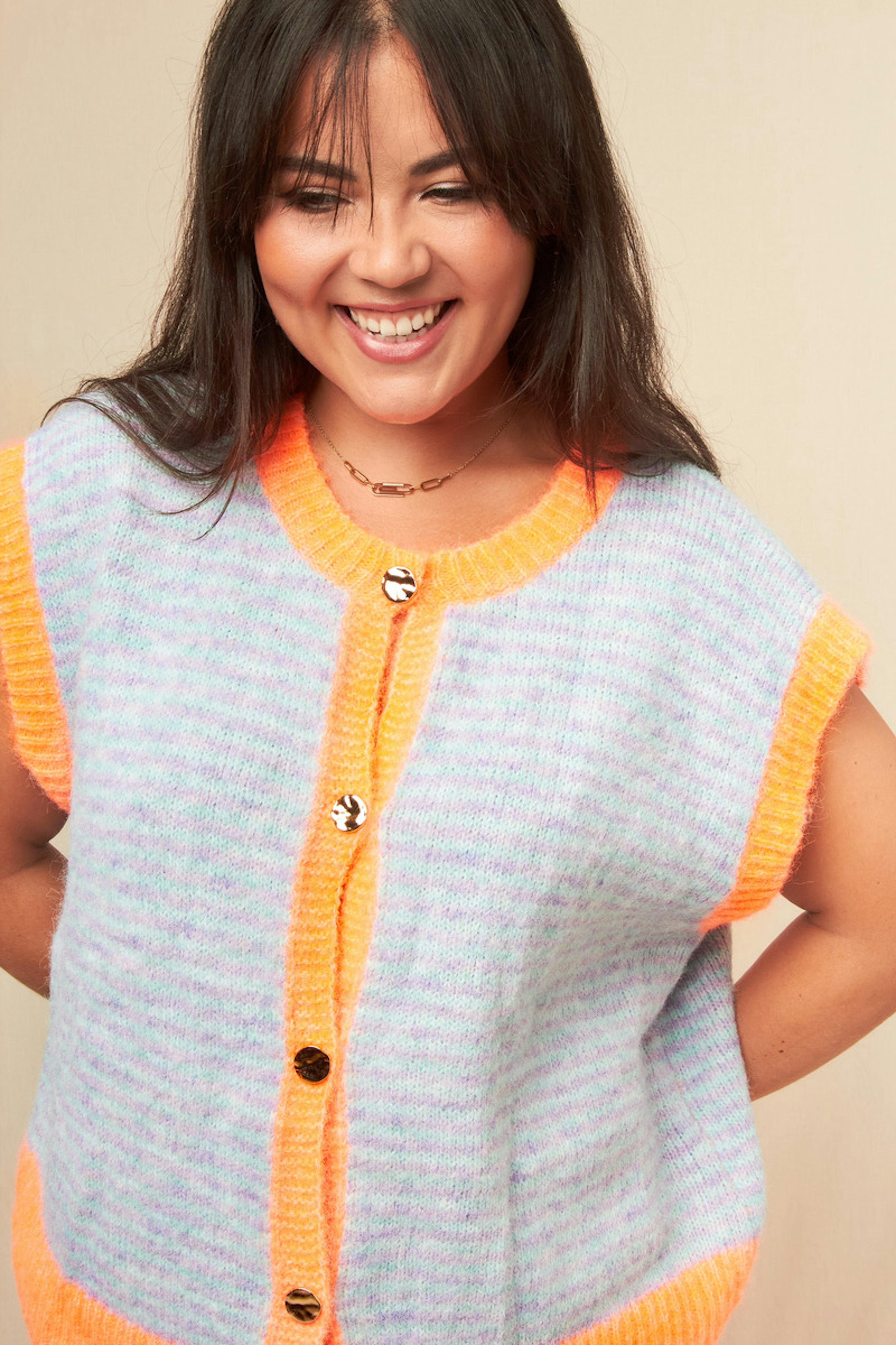 Associez ce gilet à un jean foncé et des bottines pour un look chic et décontracté en hiver. • Gilet en laine mélangée • Coupe ample et décontractée • Sans manches • Fermeture boutonnée • Finitions colorées contrastantes