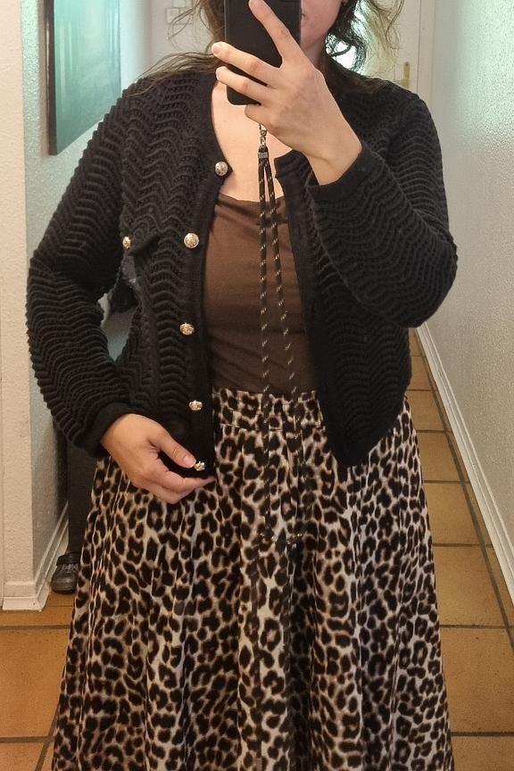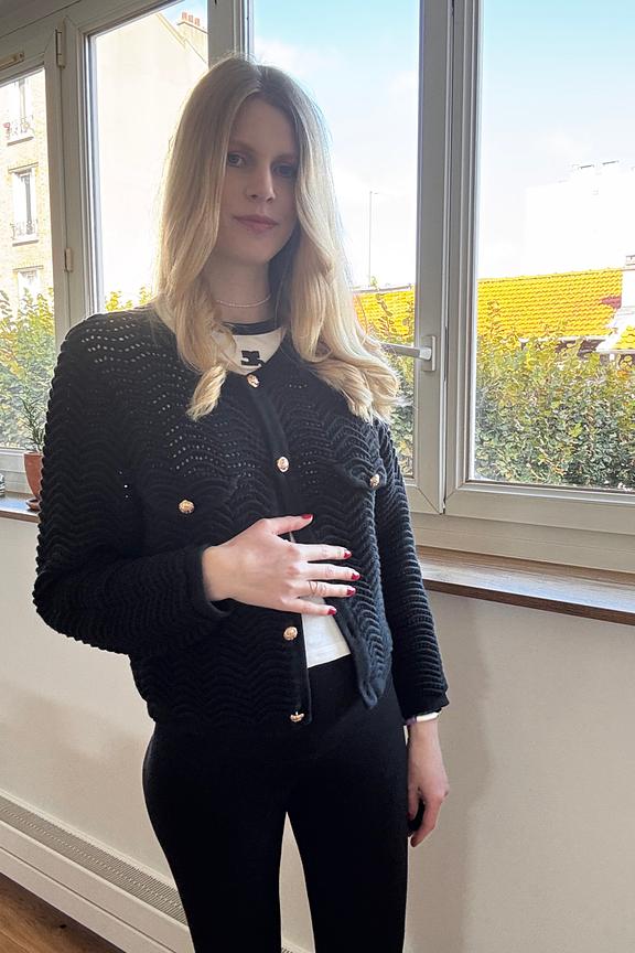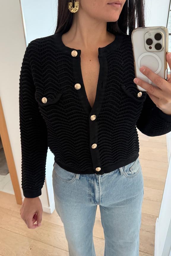Associez ce gilet noir avec une jupe ร motifs ou un jean taille haute pour une allure chic en รฉtรฉ. โข Gilet en coton โข Manches longues โข Coupe droite โข Boutonnage dorรฉ โข Motif en relief