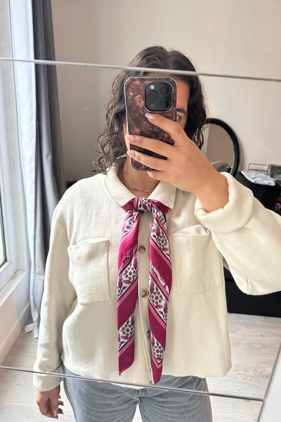 Associez cette veste beige à une jupe en laine ou un pantalon en cuir pour un look chic hivernal. • Gilet en coton • Col chemise • Manches longues • Poches à rabat • Fermeture à boutons contrastés