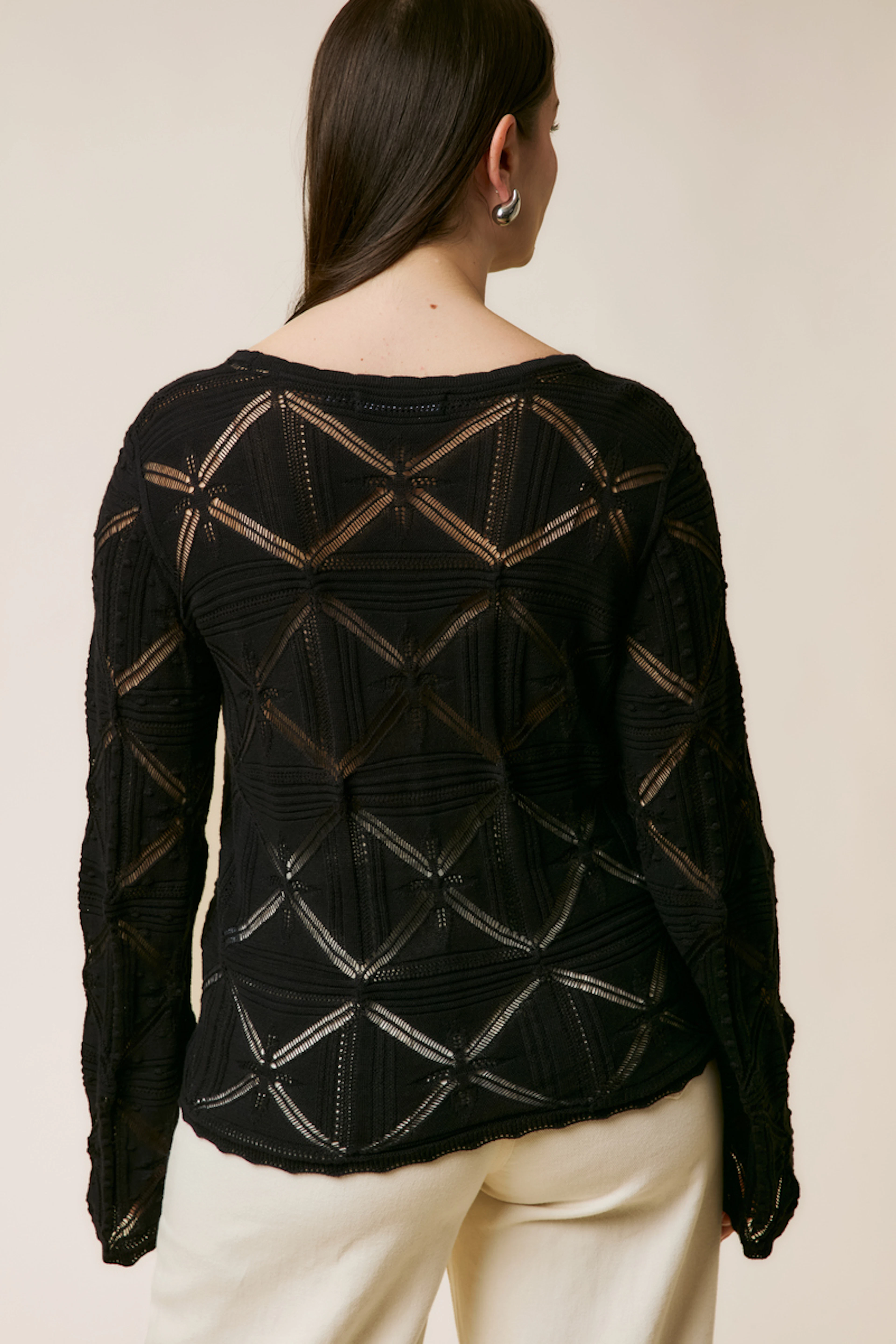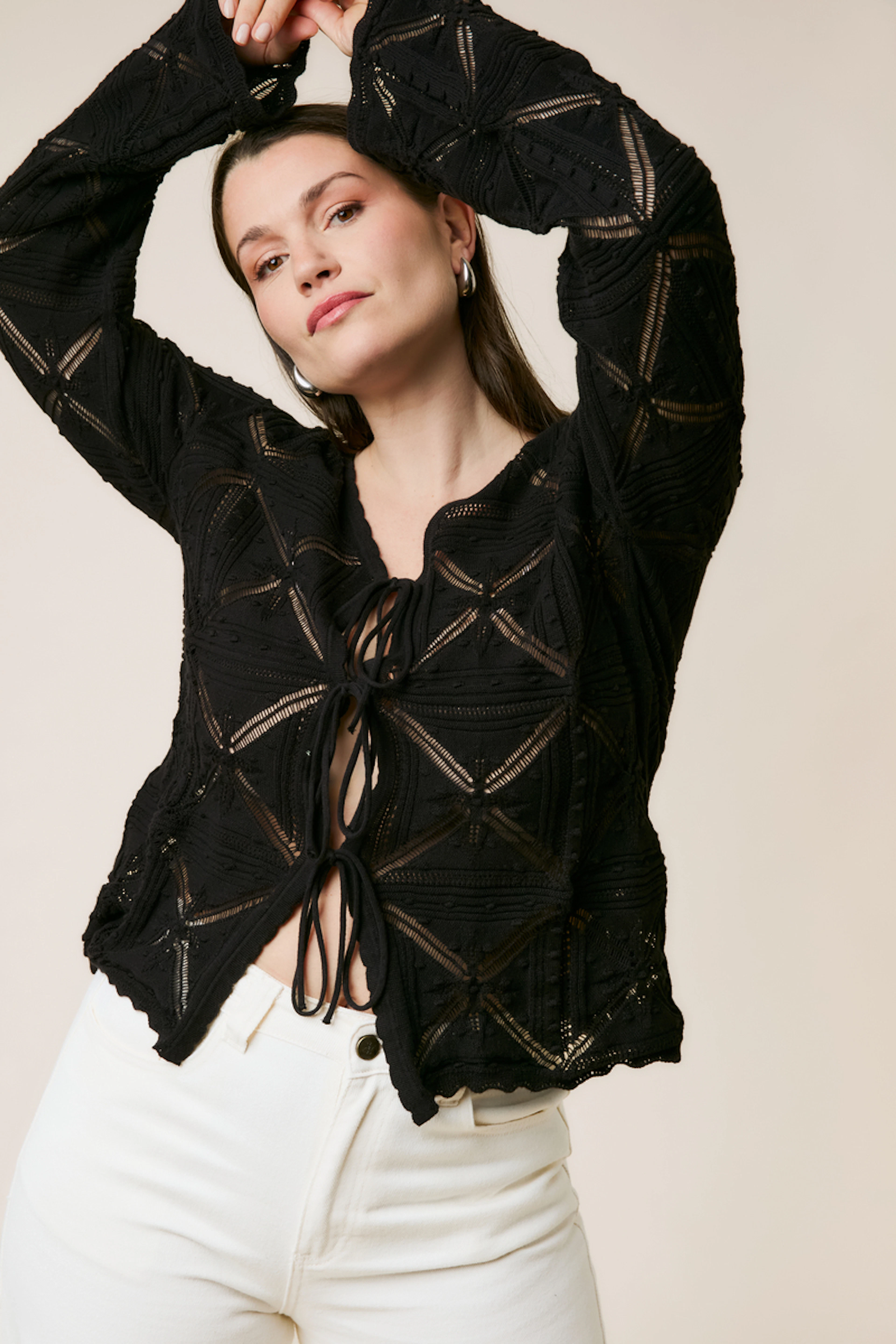 Associez ce gilet à une jupe crayon et des bottines pour un look chic d'hiver. • Gilet en coton • Coupe ajustée • Manches longues • Fermeture nouée à l'avant • Motif géométrique ajouré