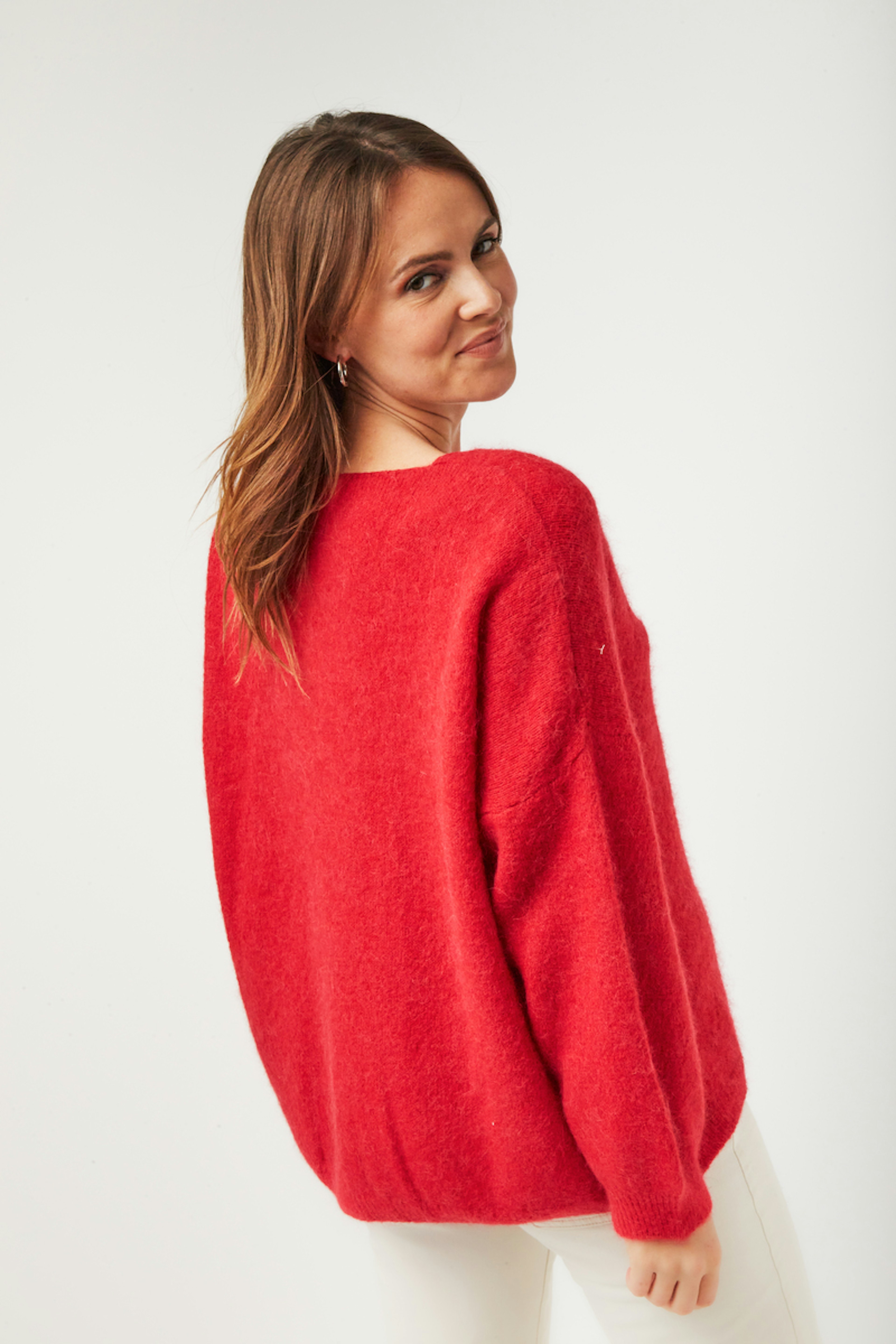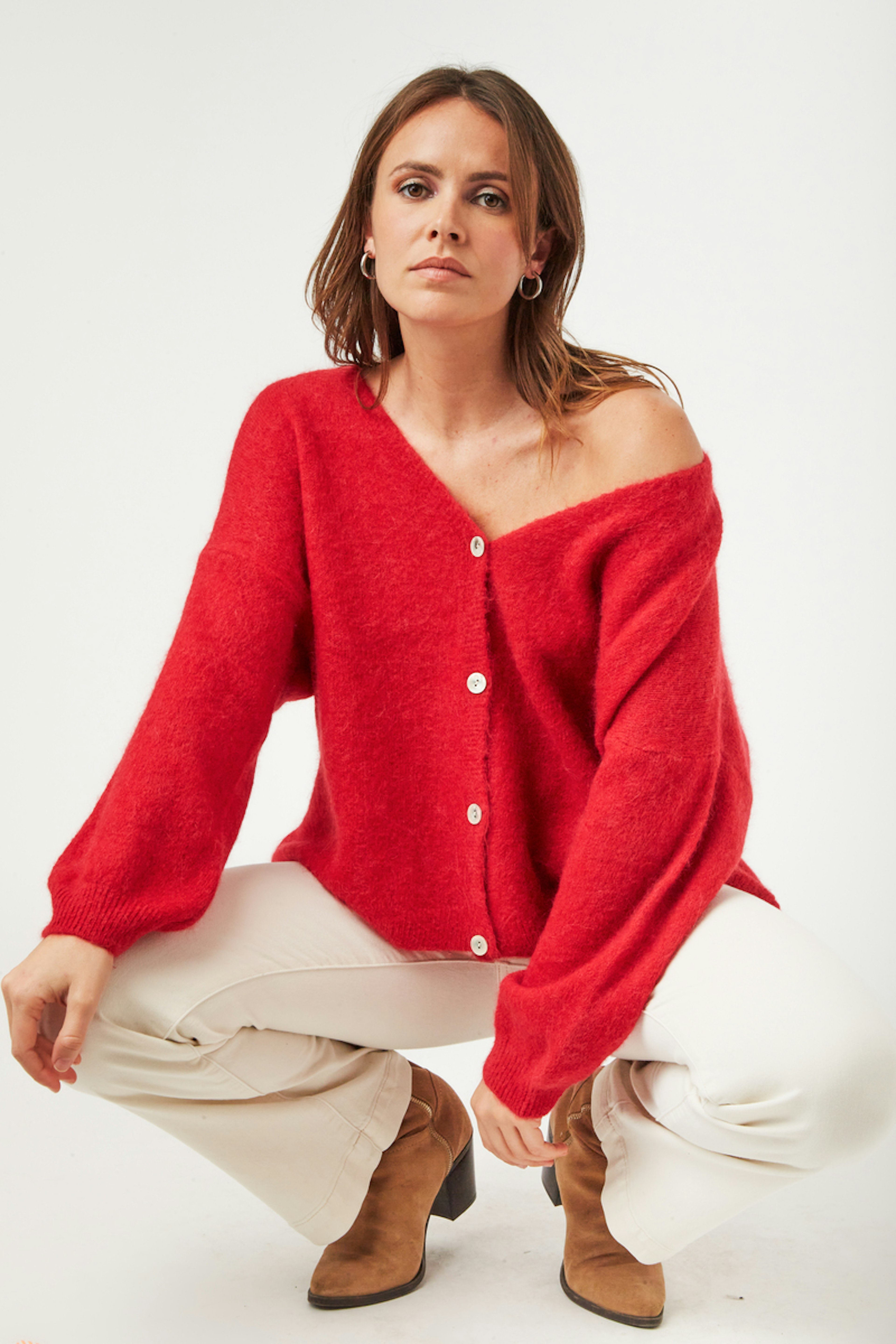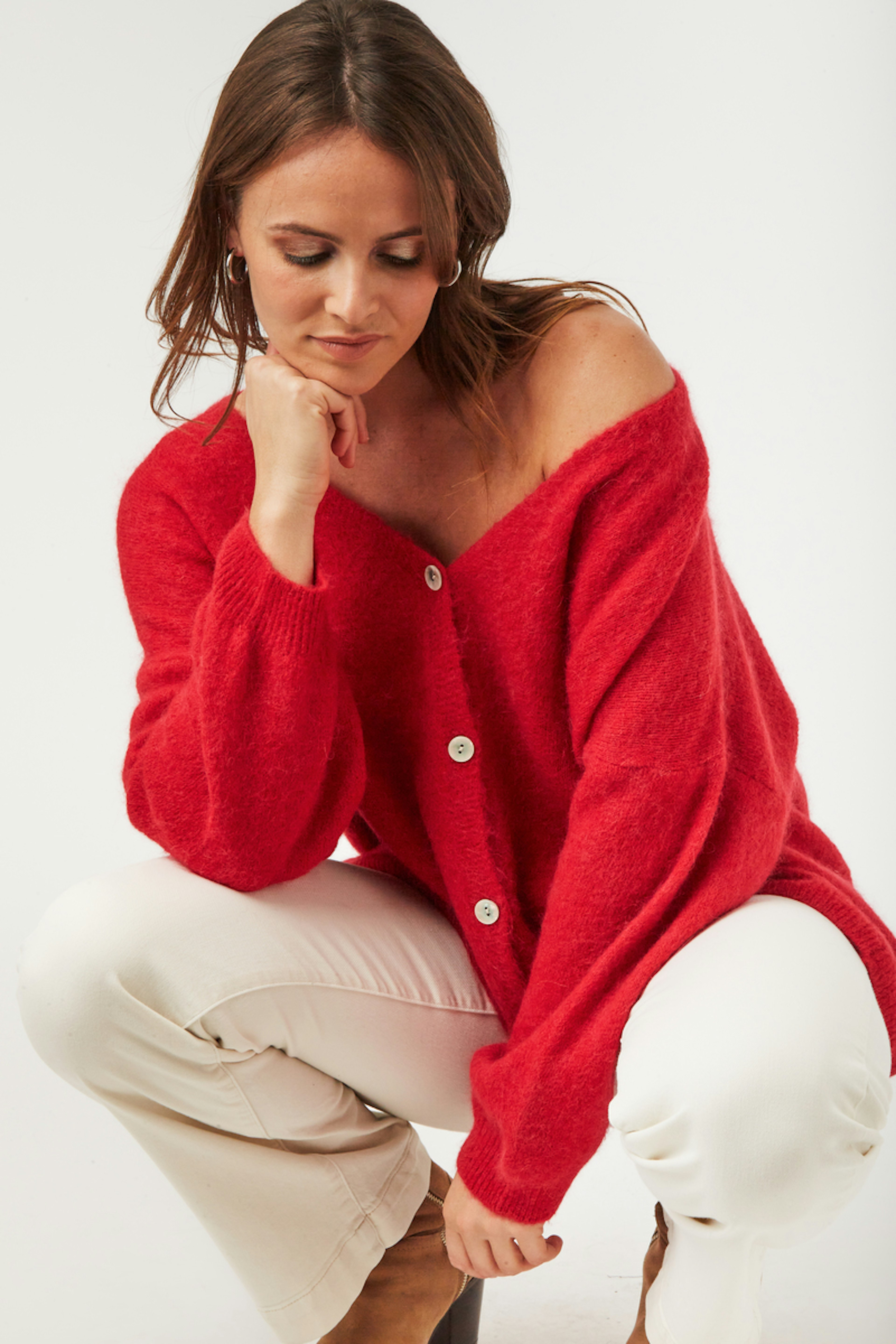 โข Gilet rouge avec de l'alpaga โข Manches longues โข Boutons fantaisies sur le devant โข Finitions bords-cรดtes โข Couple ample