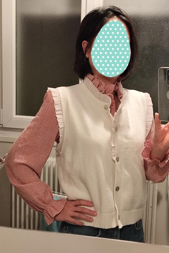 “Très joli gilet avec les froufrous, je le porte avec la chemise Latasha, chez Majolica. J'aurais juste aimé qu'il soit un peu plus cintré ; c'est l'inconvénient d'une taille unique.”