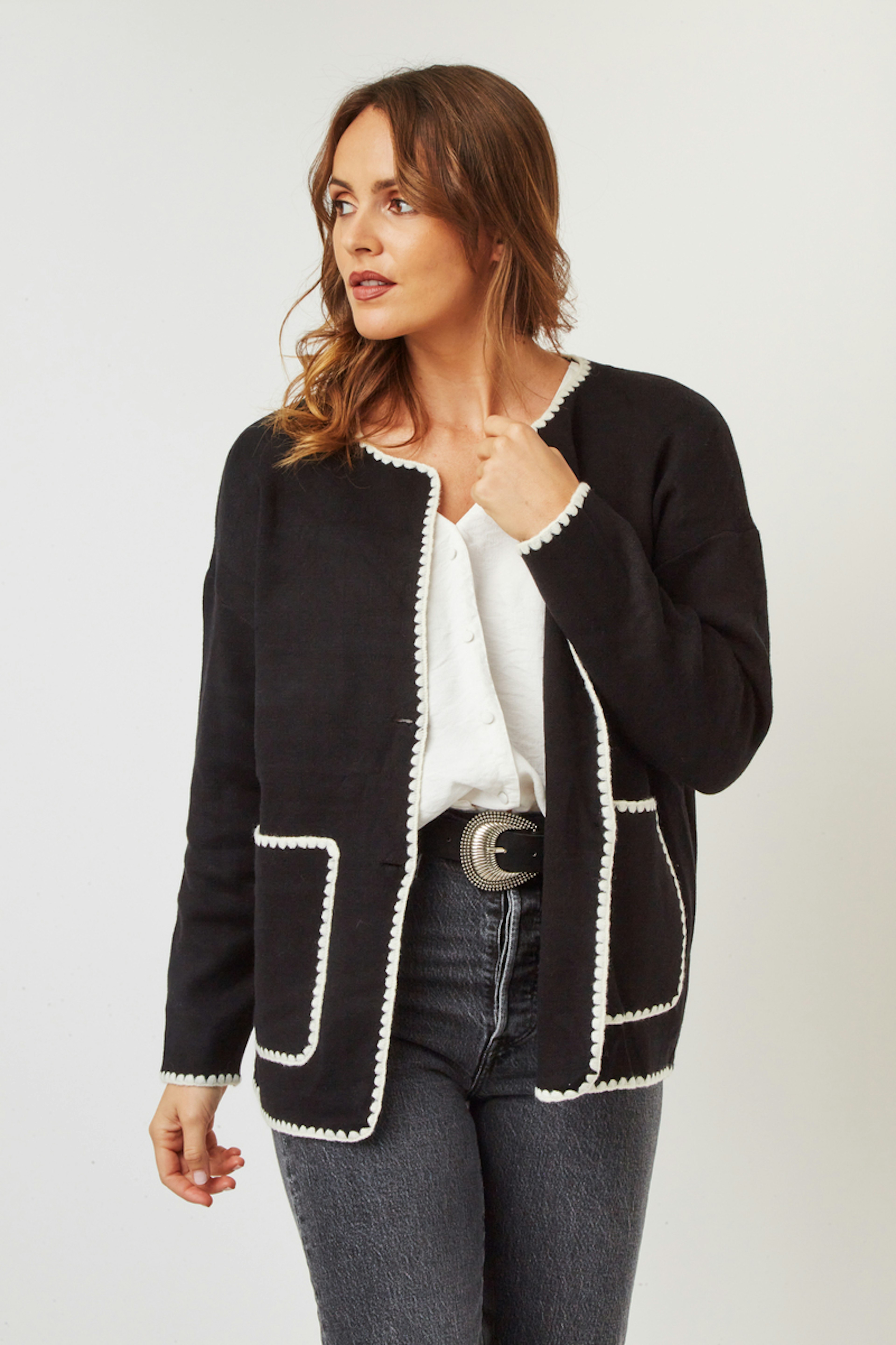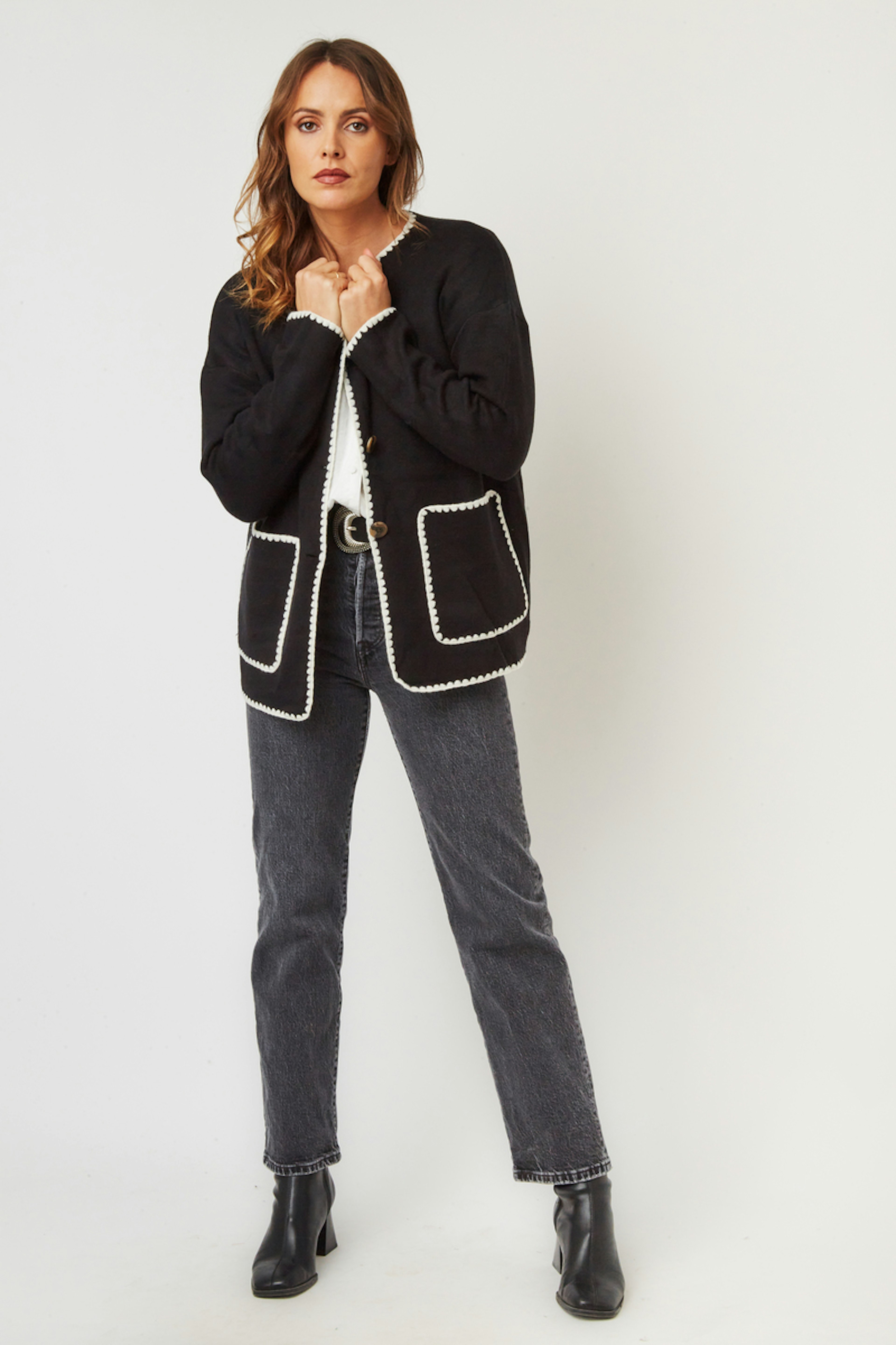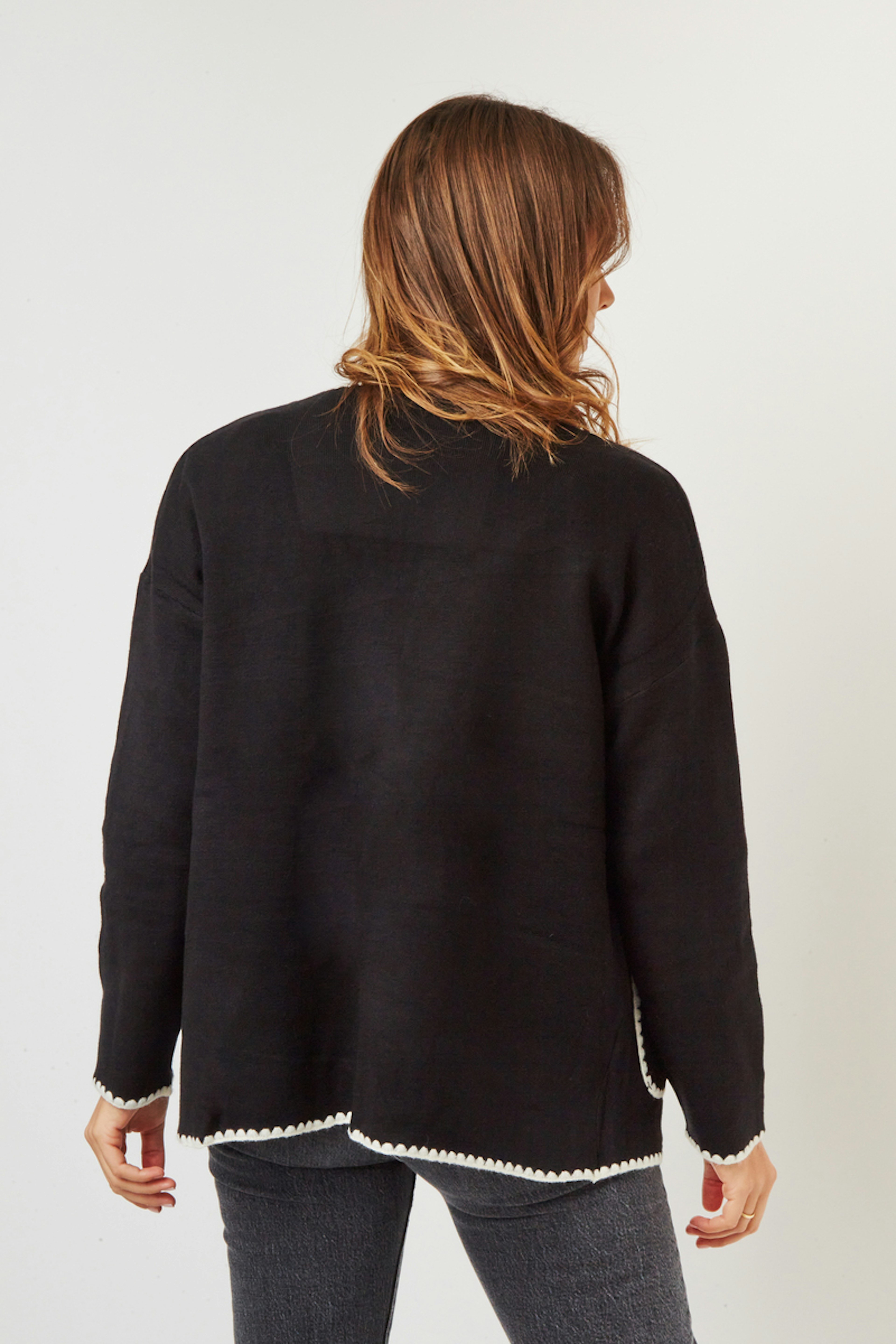 โ€ข Cardigan large noir avec liserรฉ blanc โ€ข Se boutonne sur le devant (2 boutons) โ€ข Deux grandes poches โ€ข Bordures fines crochetรฉes (couleur blanche) โ€ข Maille dense โ€ข Trรจs confortable