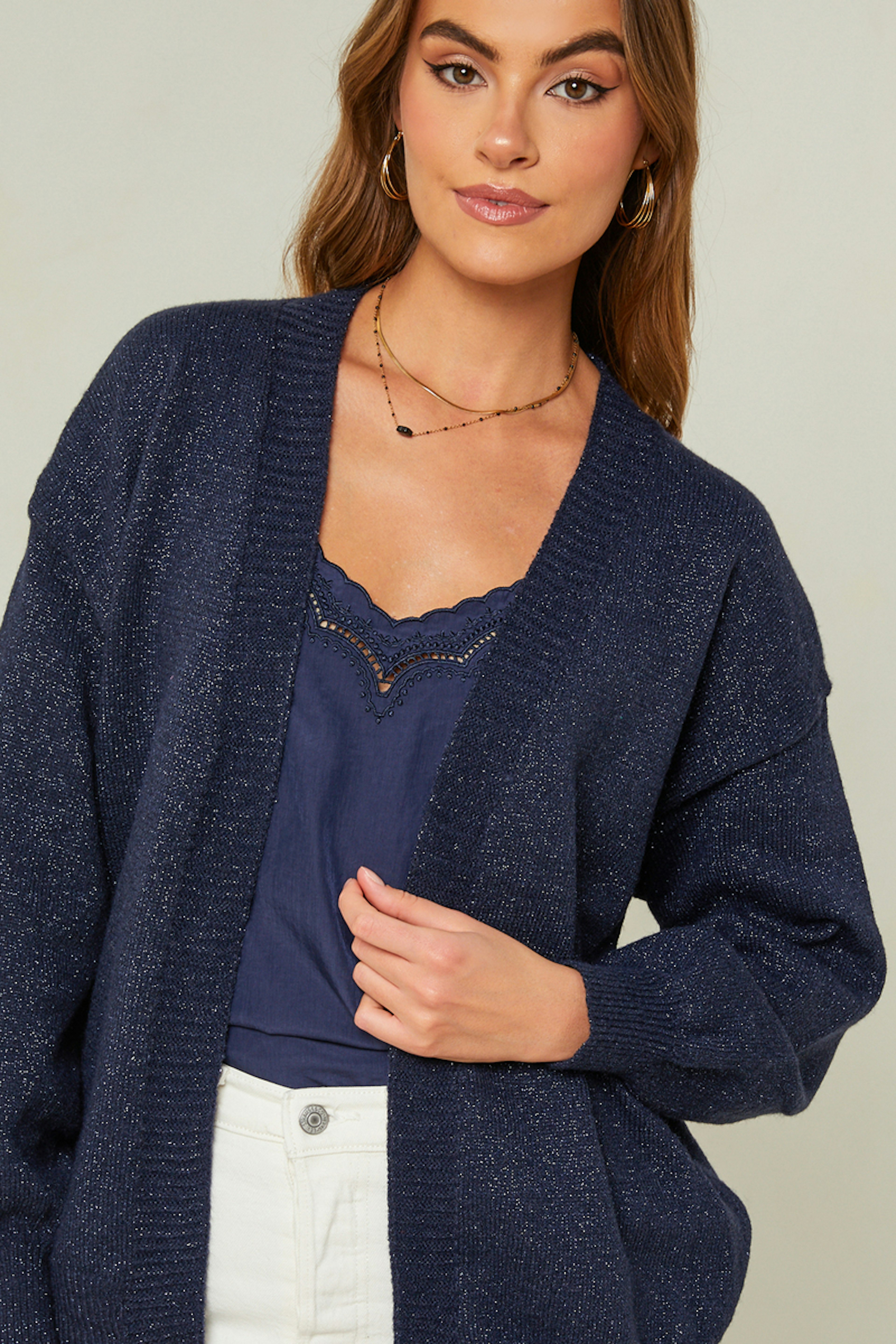 โข Gilet bleu marine avec dรฉtails en lurex argentรฉs โข Manches longues โข Bords cรดtes โข Coupe oversize โข La taille unique convient du S au L