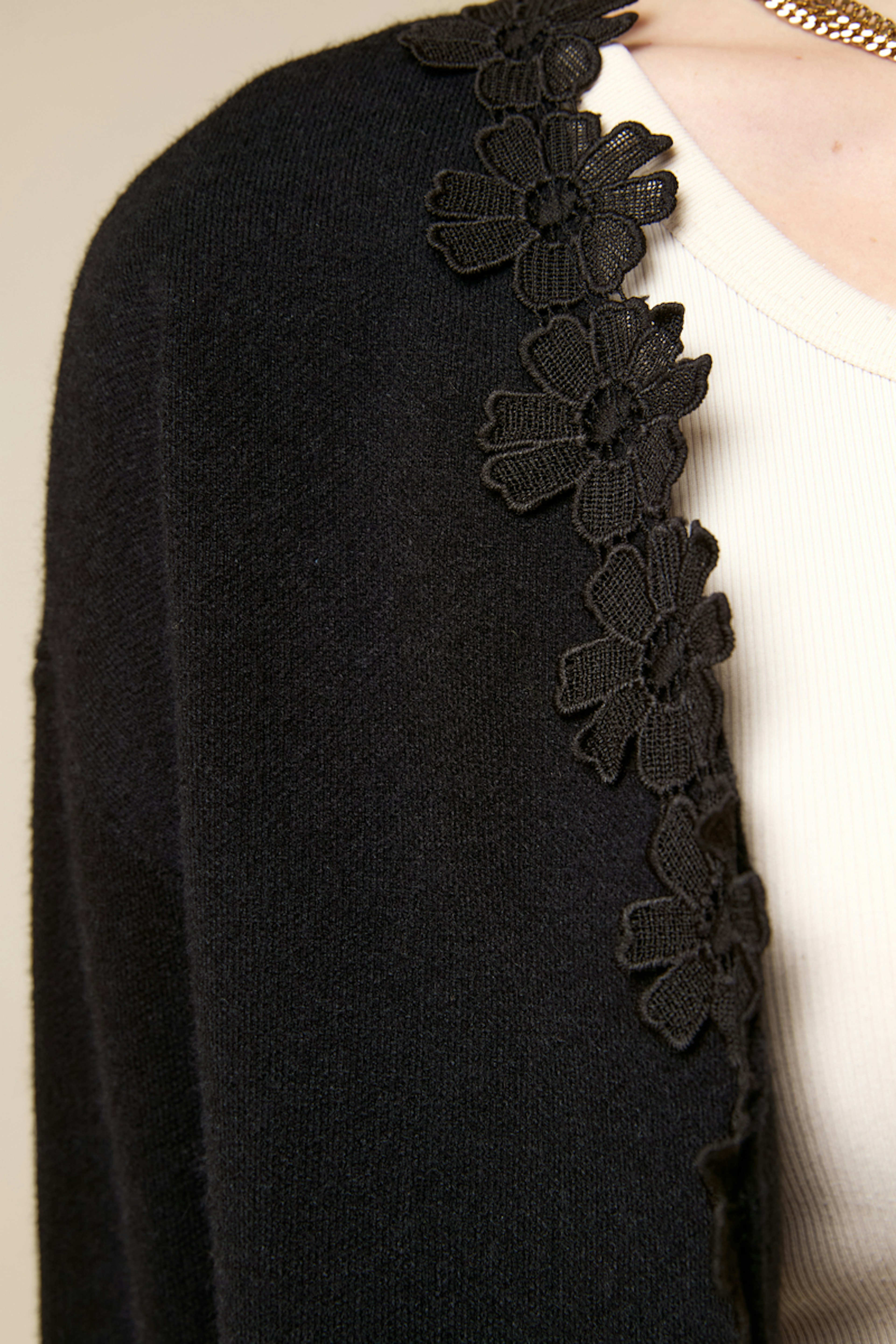 Ce gilet noir se marie à merveille avec un jean blanc ou une jupe crayon pour un look chic d'hiver. • Gilet en laine mélangée • Douce texture • Détails floraux élégants • Coupe ouverte • Parfait pour superposer