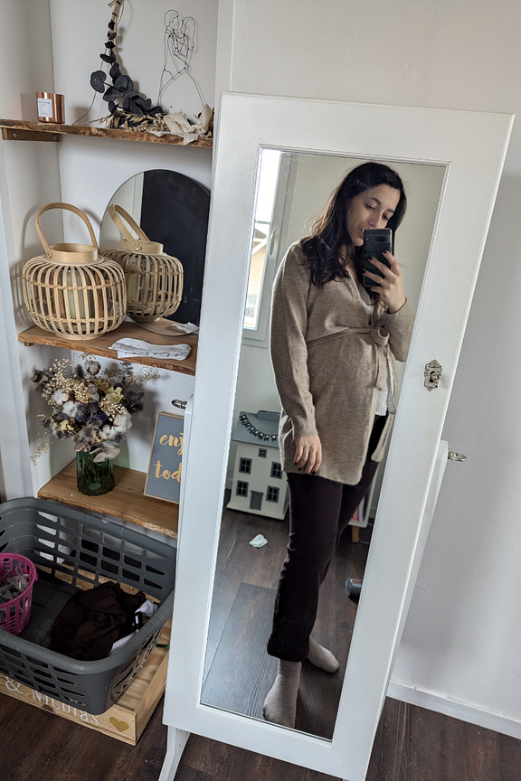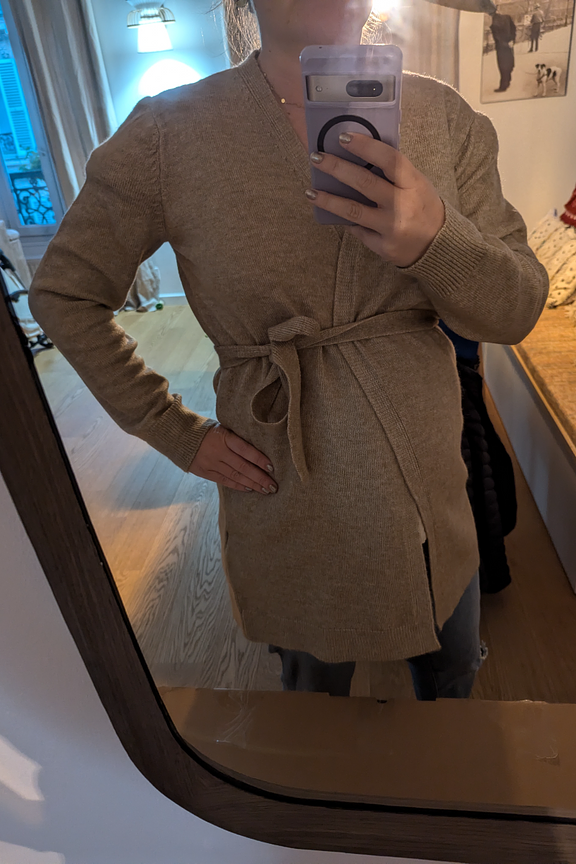 Ce gilet beige de maternité est votre allié confort pour les journées fraîches. Associez-le avec un jean slim noir et des bottines pour un look chic et décontracté. Parfait pour l'hiver. • Gilet • Coupe longue • Ceinture à nouer • Manches longues • Texture douce