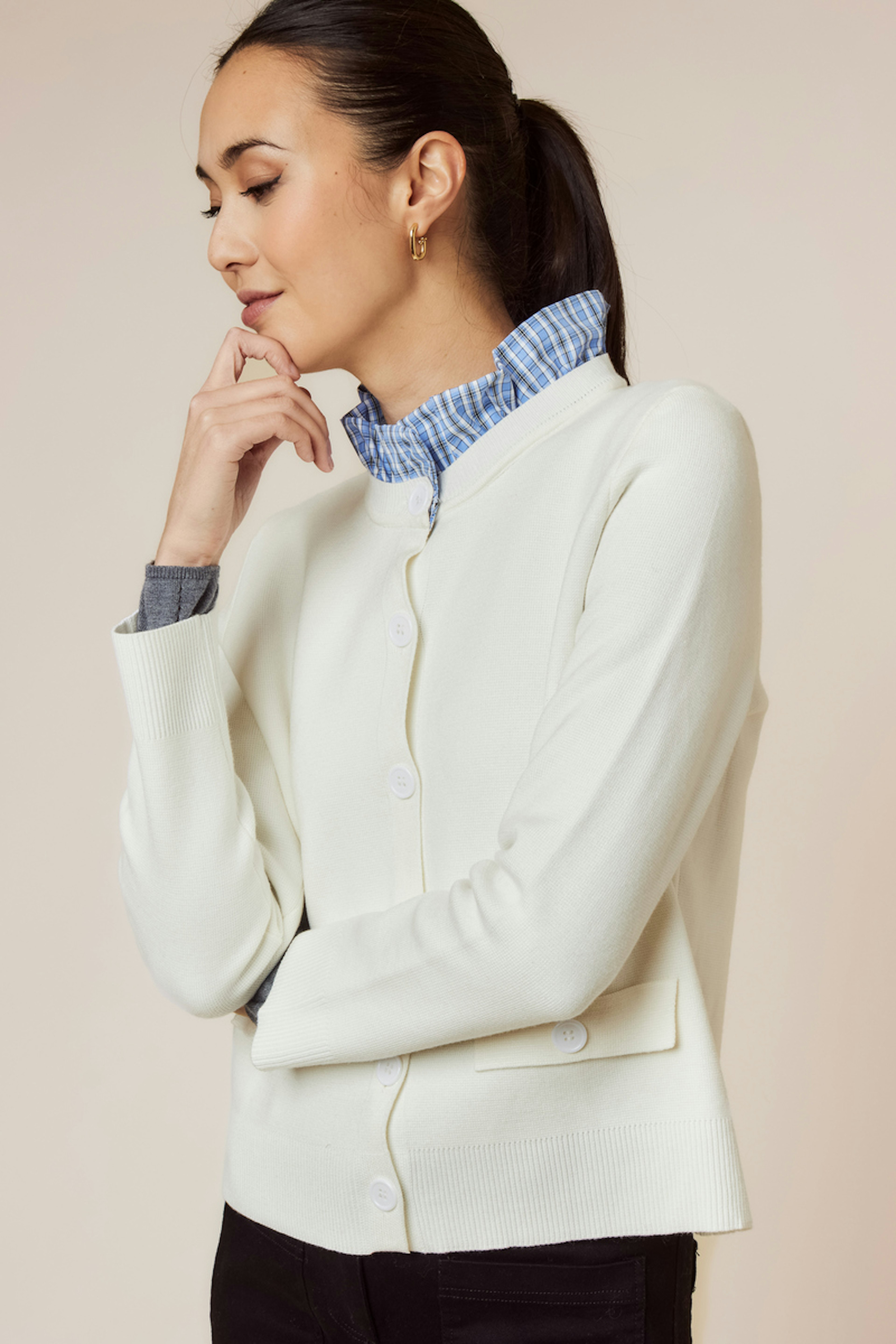 Associez ce gilet blanc ร  un jean taille haute pour un look cosy et sophistiquรฉ en hiver. โ€ข Gilet en laine โ€ข Boutonnage central โ€ข Poches ร  rabat โ€ข Col rond โ€ข Manches longues