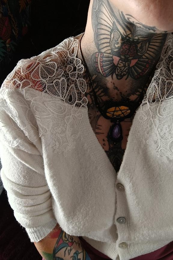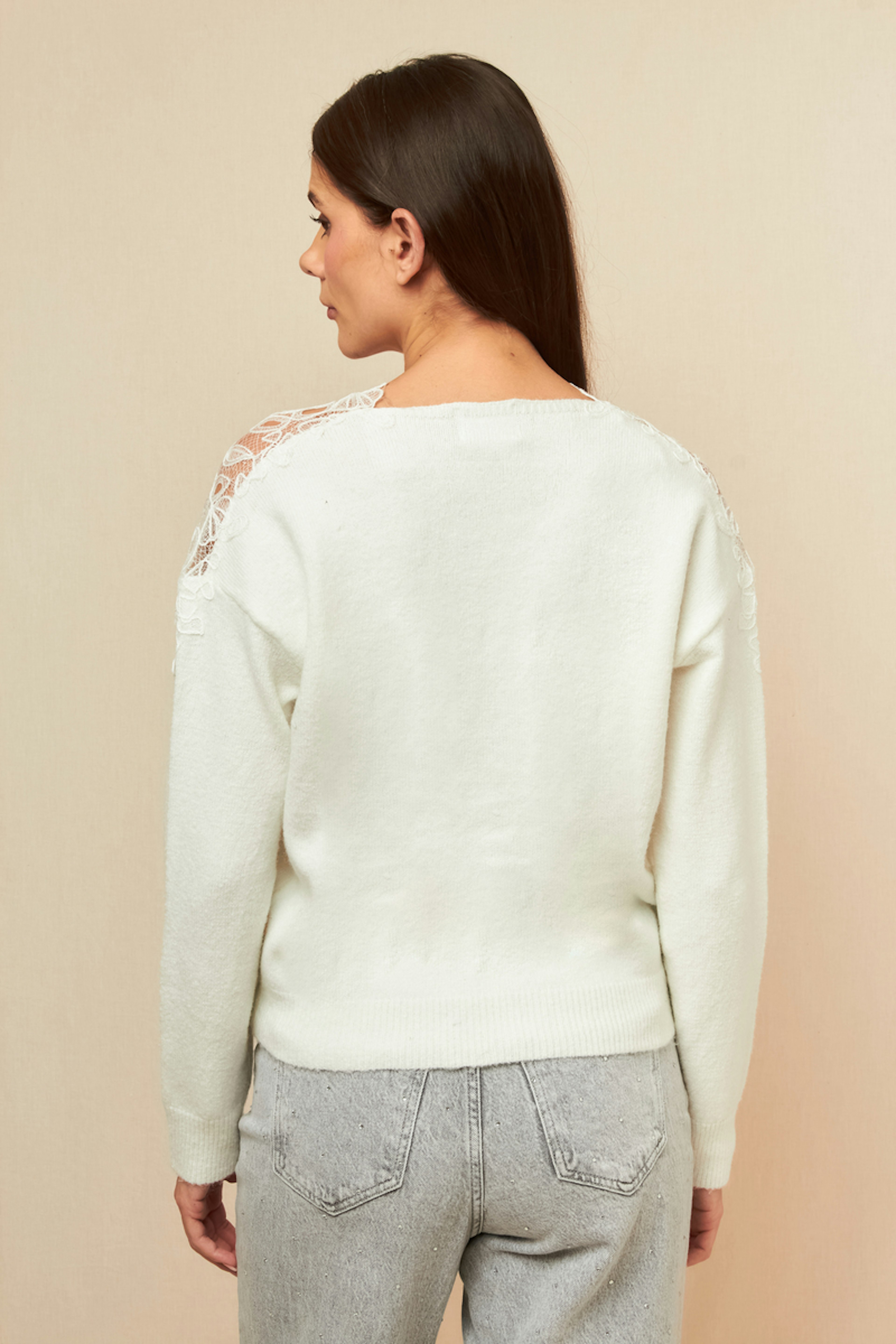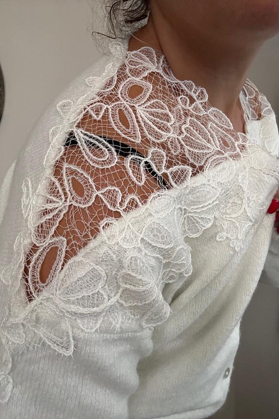 Portez-le avec un jean slim et des bottines pour un look chic et décontracté, parfait en toute saison. • Gilet à manches longues • Délicat col en V • Matière douce et confortable • Épaules en dentelle • Boutons contrastants