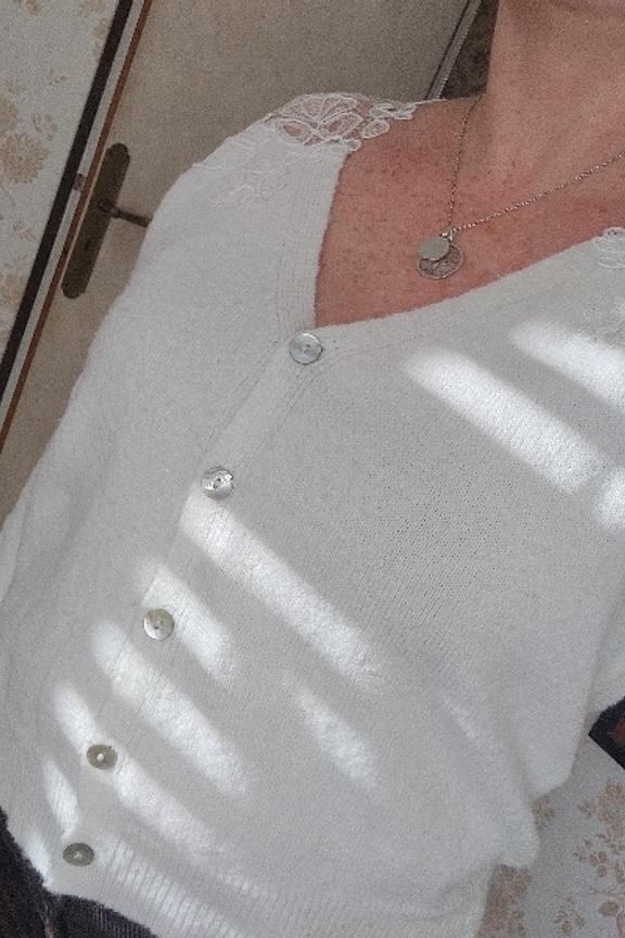 Portez-le avec un jean slim et des bottines pour un look chic et décontracté, parfait en toute saison. • Gilet à manches longues • Délicat col en V • Matière douce et confortable • Épaules en dentelle • Boutons contrastants