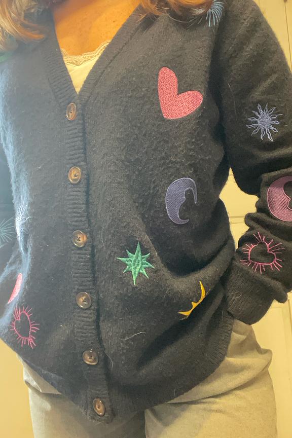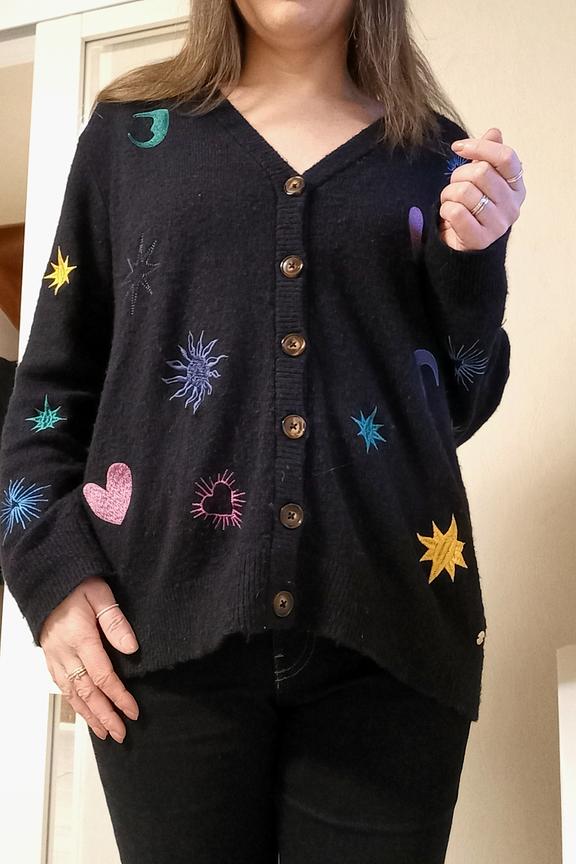 Associez ce gilet avec un jean décontracté et des bottines pour un look cosy et moderne en hiver. • Gilet à motifs astraux • Coupe ample et confortable • Manches longues douillettes • Fermeture à boutons en bois • Étoiles et lunes colorées