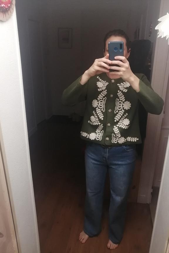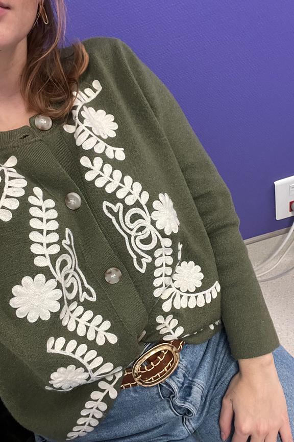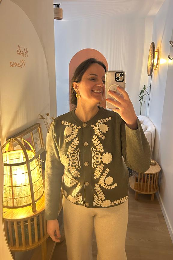 Pour un look hivernal cosy et รฉlรฉgant, associez ce gilet avec un jean taille haute et des bottines en cuir. Parfait pour la saison froide ! โข Gilet avec motifs brodรฉs โข Manches longues โข Fermeture par boutons โข Col rond โข Dรฉtails floraux โข La taille unique convient du 34 au 40