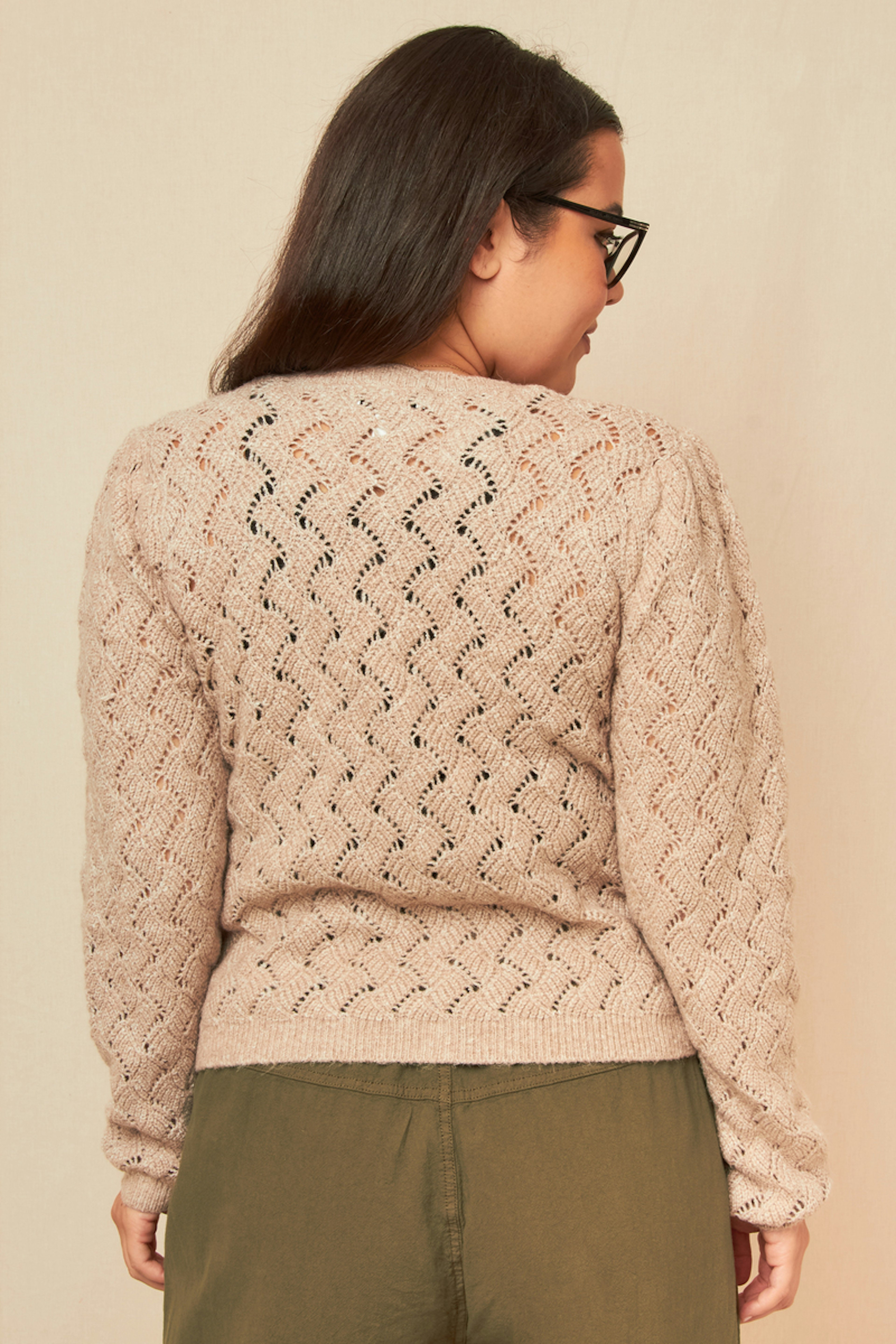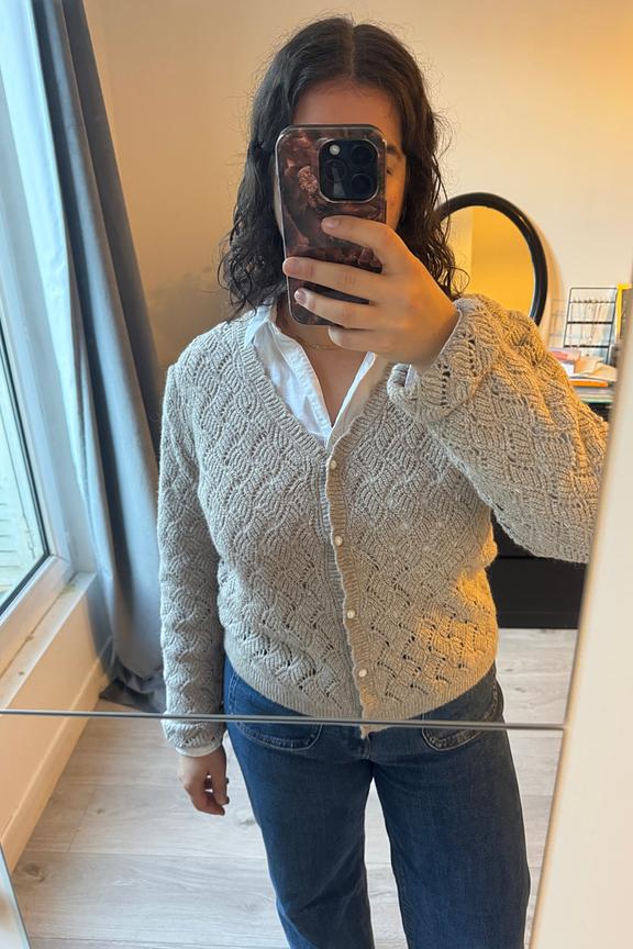 Pour un look cosy chic, associe ce gilet avec un pantalon taille haute et des bottines en cuir. Idéal pour l'hiver. • Gilet en maille • Coupe ajustée • Manches longues • Fermeture boutonnée • Motif ajouré