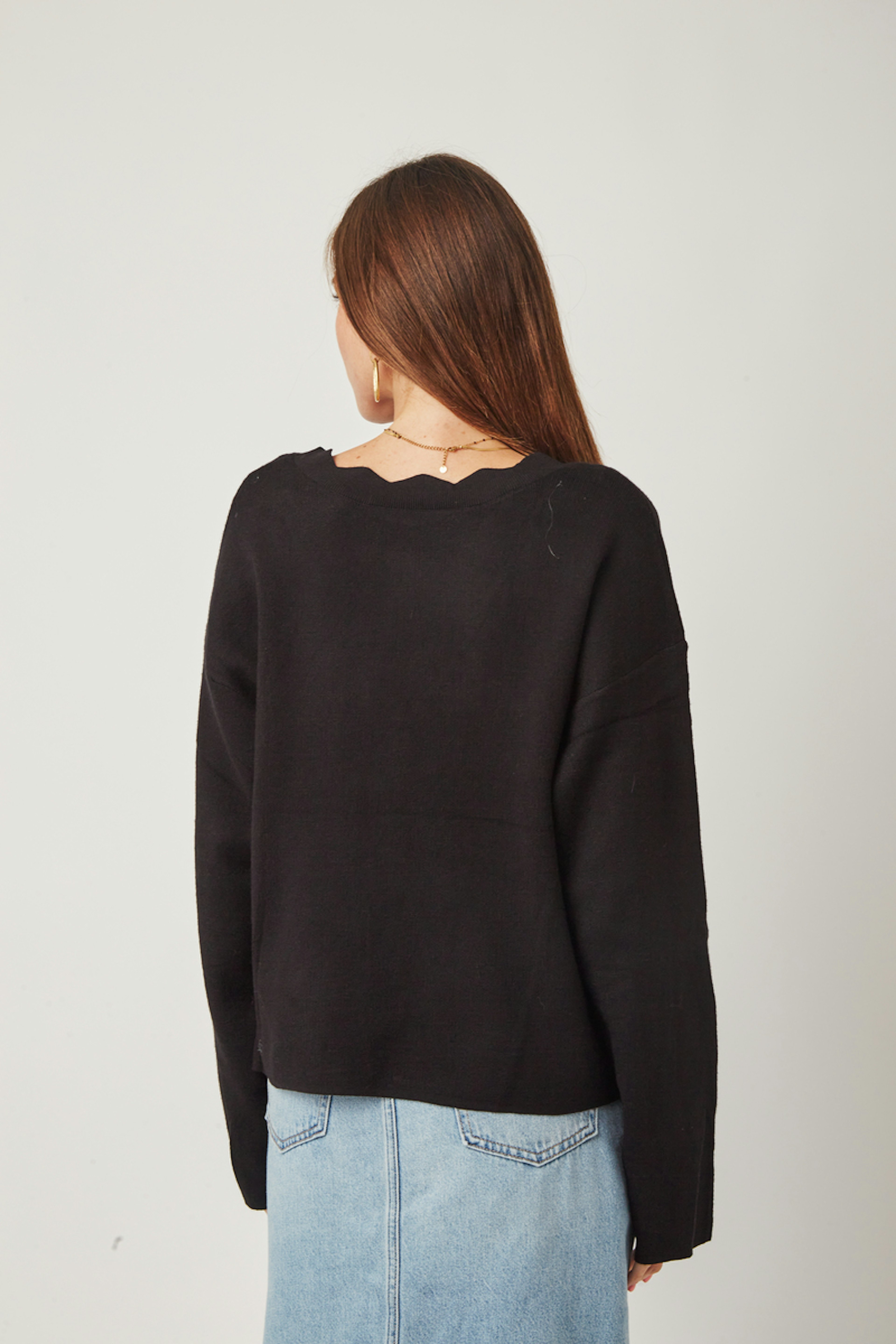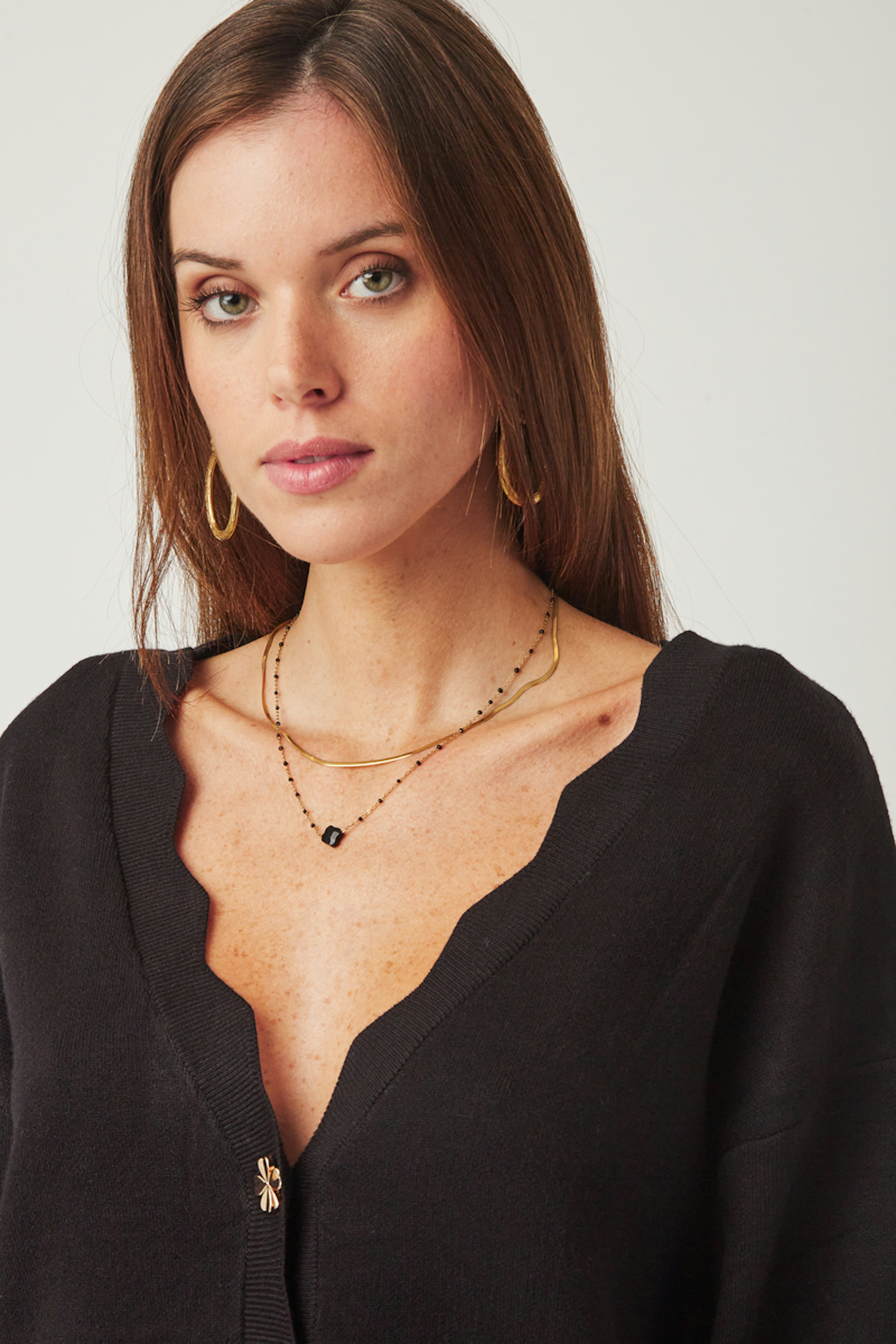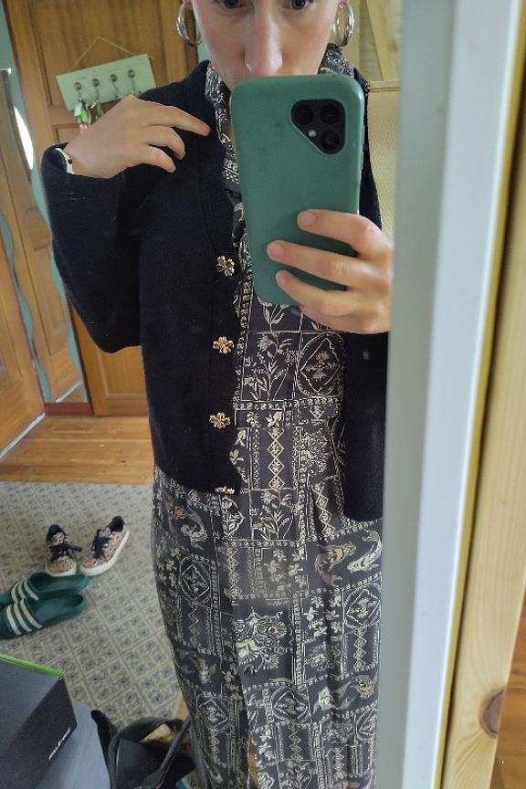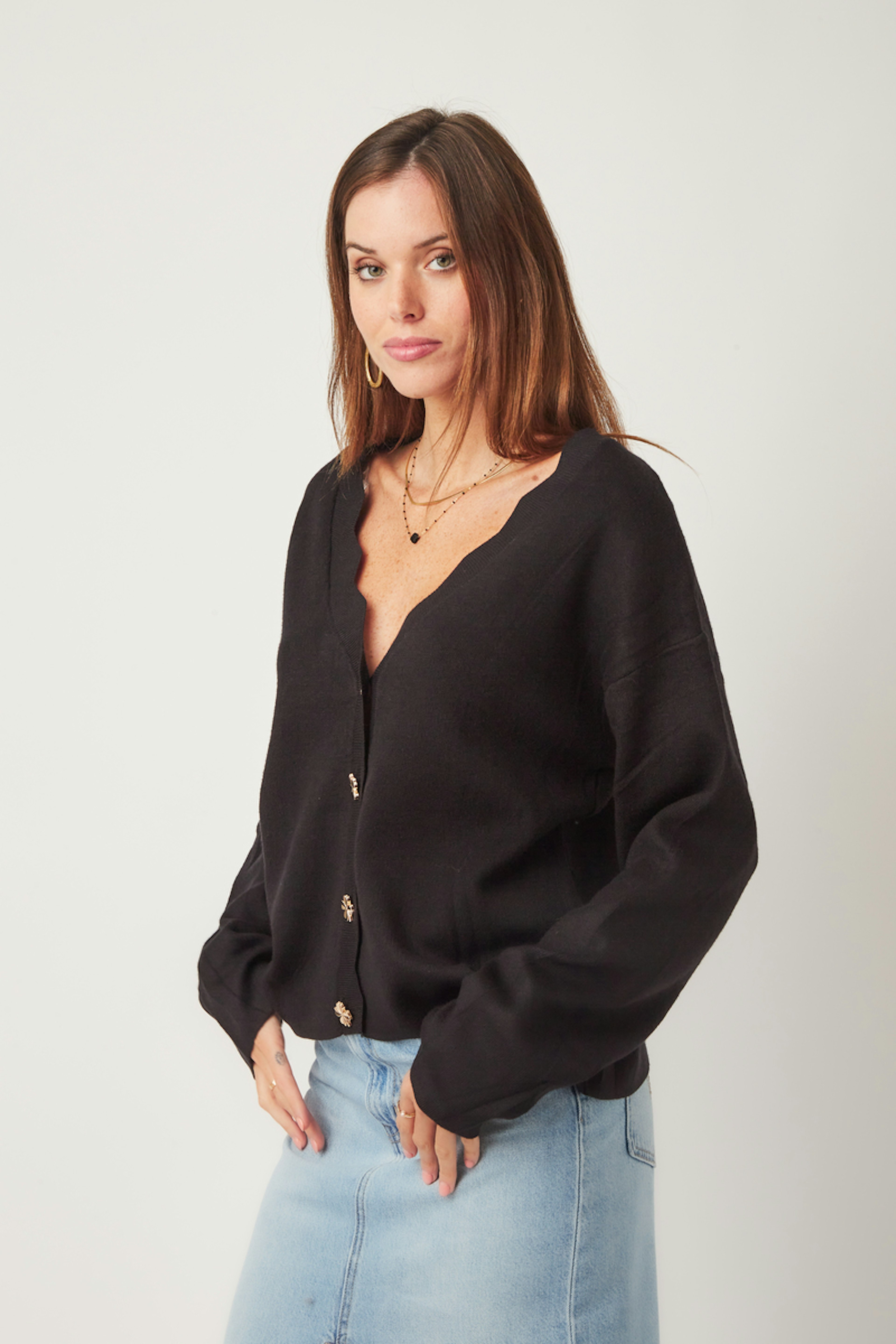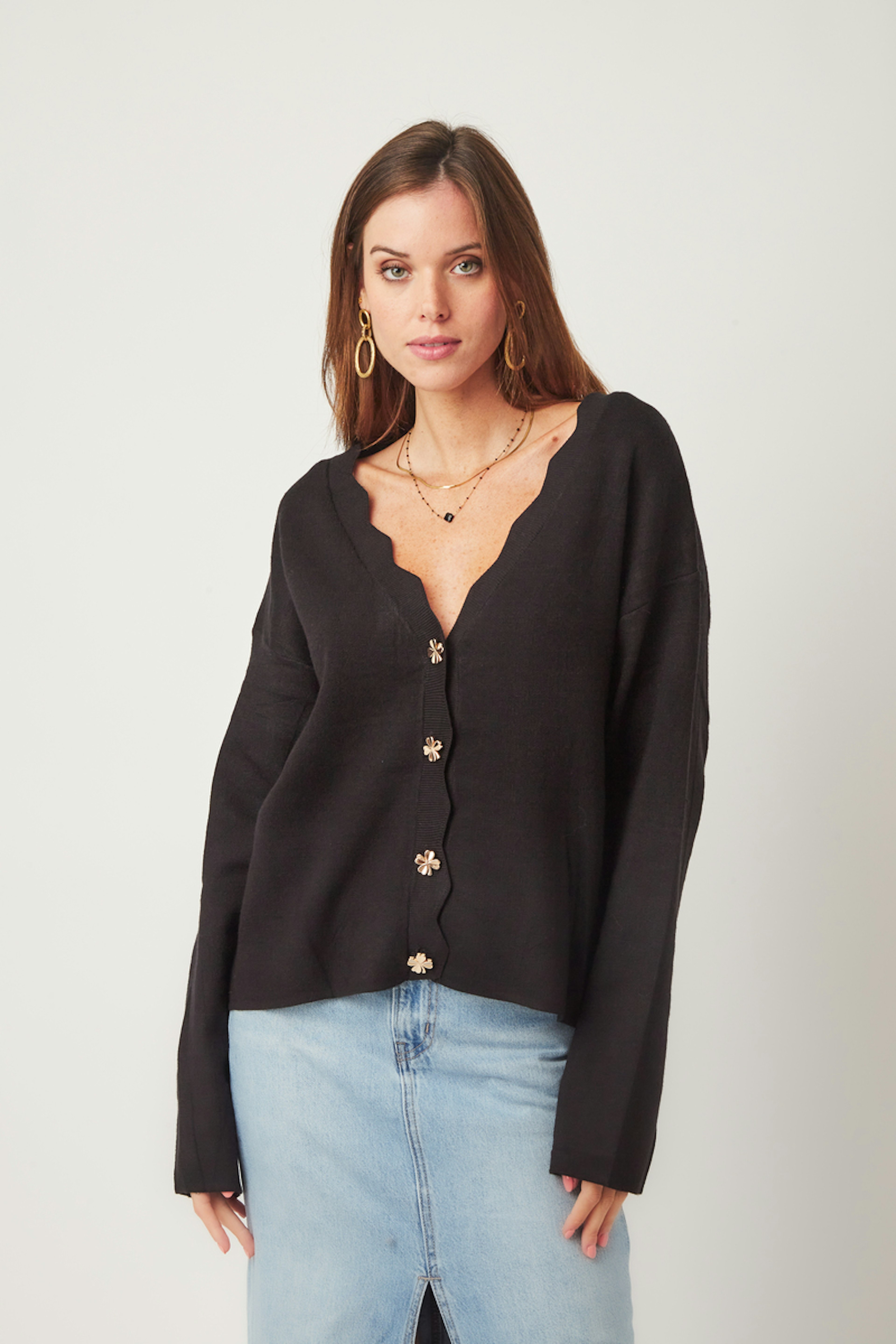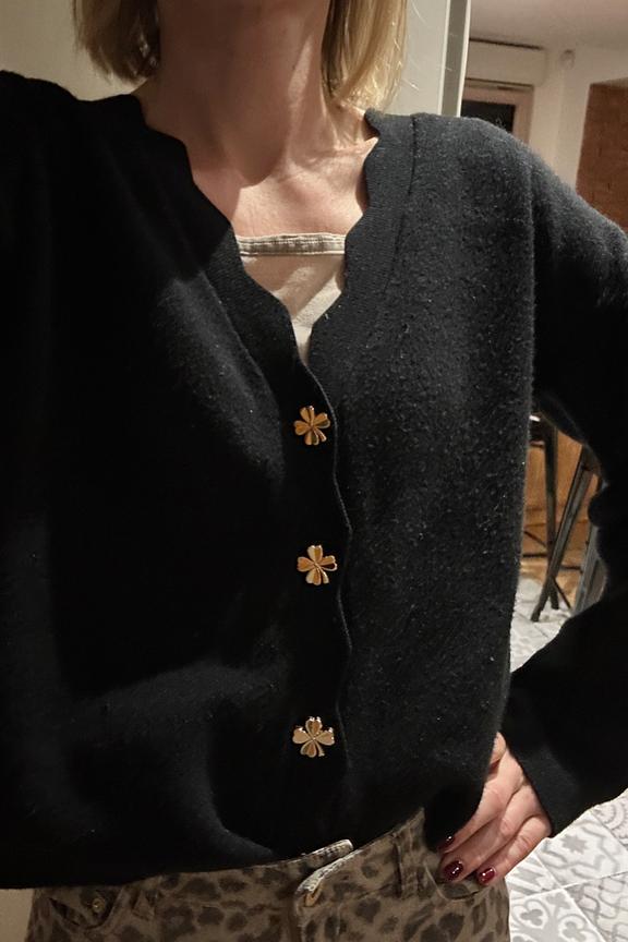โข Gilet ร manches longues โข Boutonnรฉ sur le devant โข Boutons dorรฉs en forme de trรจfles โข Col V