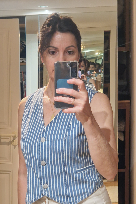 Associez ce gilet avec un pantalon blanc fluide pour un look estival chic. • Gilet à rayures • Coupe ajustée sans manches • Encolure en V flatteur • Fermeture à boutons devant • Motif à rayures