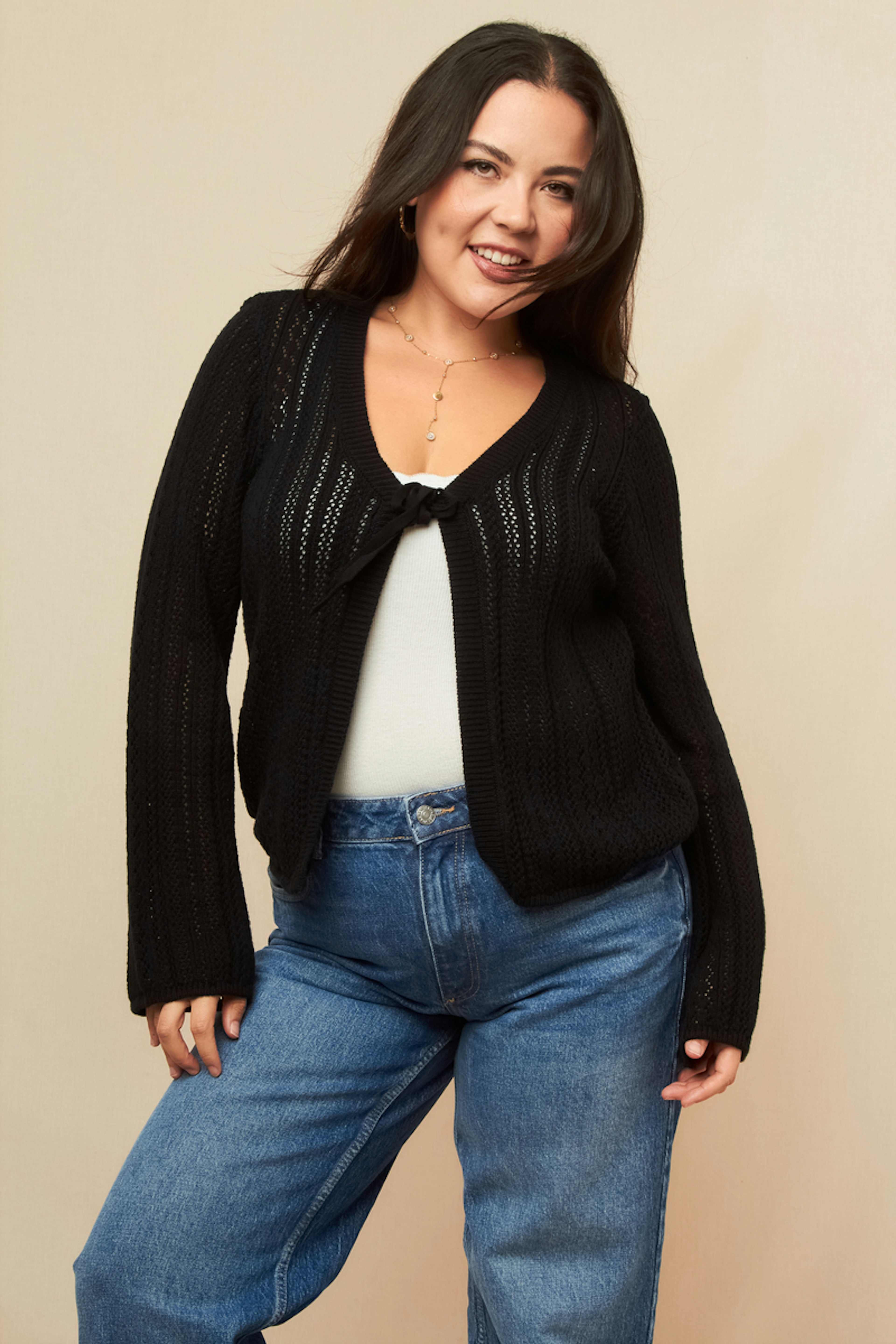 Optez pour une élégance simple en associant ce gilet à un débardeur clair et un jean taille haute pour un look d'été chic. • Gilet en 100% coton recyclé • Manches longues amples • Ouverture avec nœud à nouer • Mailles ajourées • Couleur noir intemporel