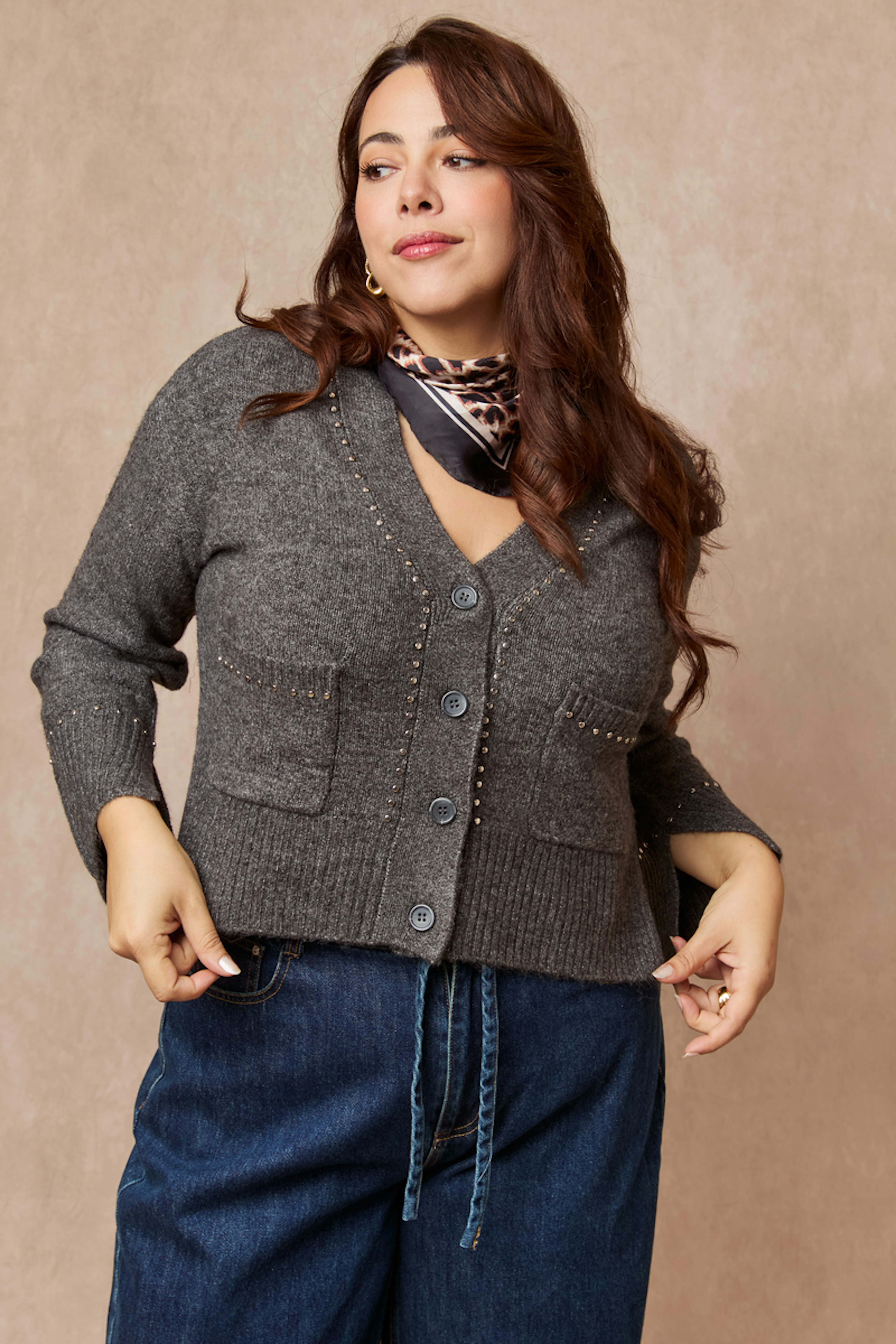 Associez ce gilet à un pantalon taille haute et des bottines pour un look chic et moderne. Parfait en toute saison. • Gilet court • Coupe ample • Col en V • Manches longues • Détails de strass