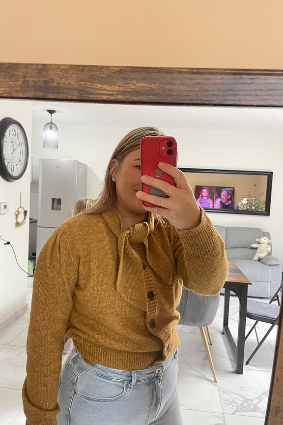 Associez ce gilet avec un pantalon ร carreaux et des bottines pour un look รฉlรฉgant cet hiver. โข Gilet en laine mรฉlangรฉe โข Coupe droite intemporelle โข Manches longues gรฉnรฉreuses โข Nลud au col pour une touche originale โข Boutons visibles sur le devant