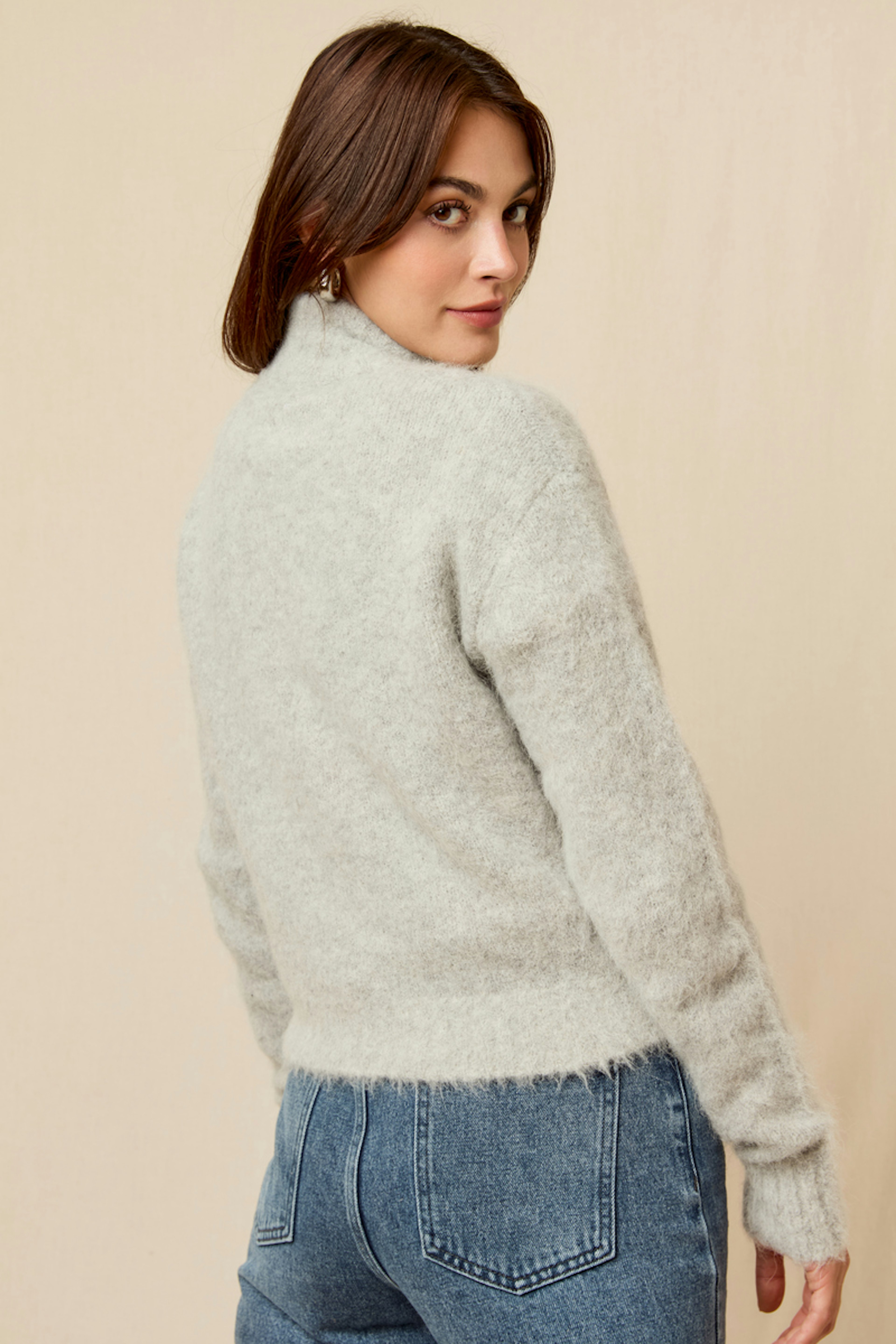 Associez ce gilet gris avec un jean bootcut et des baskets blanches pour une allure décontractée chic. Idéal pour l'hiver avec une étole colorée. • Gilet en alpaga • Fermeture éclair • Manches longues • Col montant • Texture douce