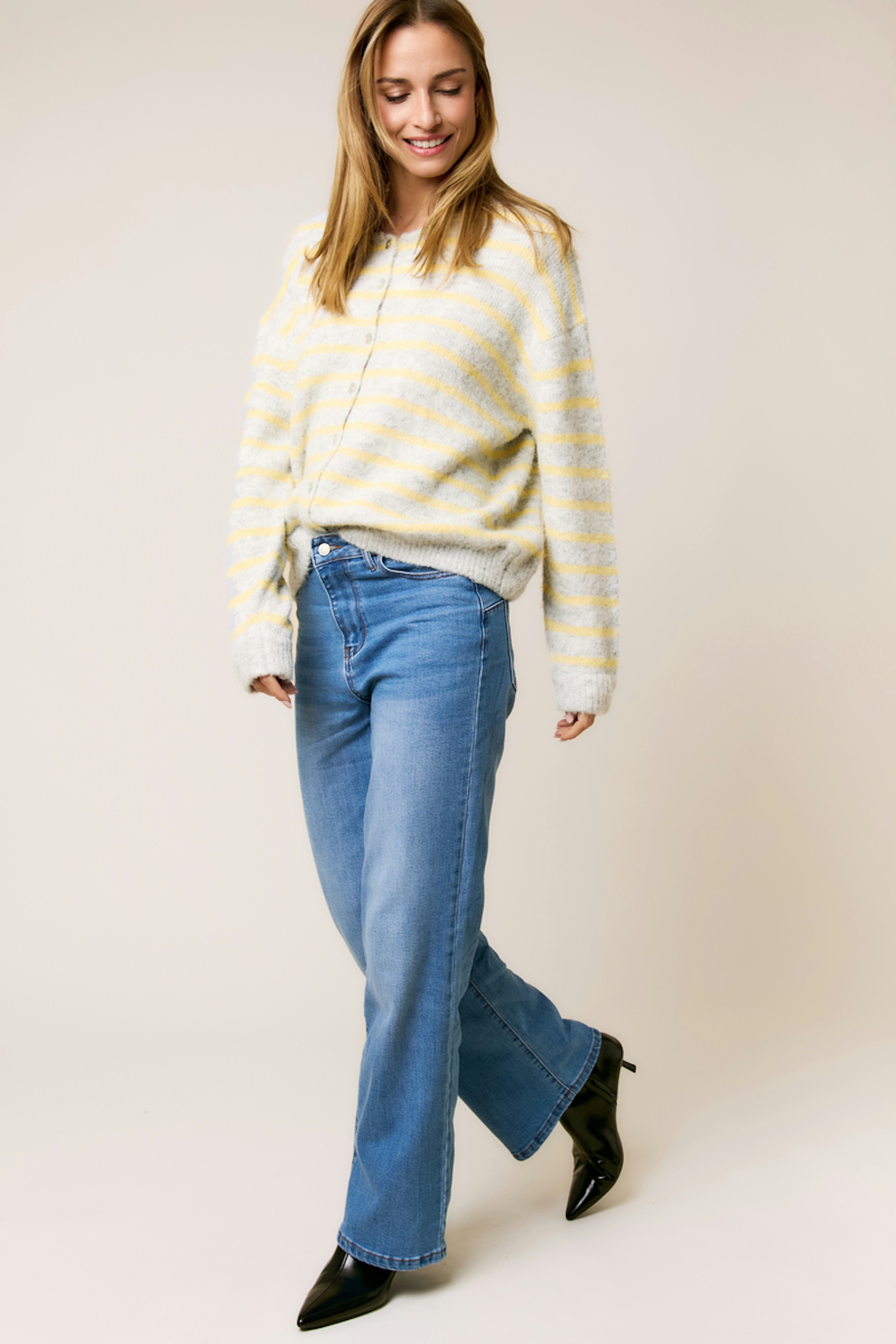 Associe ce gilet avec un jean taille haute et des bottines. Idéal pour ajouter une touche de confort chic en hiver. • Gilet à rayures • Coupe ample • Manches longues • Fermeture boutonnée • Motif rayé