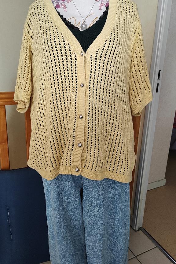 Associez ce gilet lumineux à un jean taille haute et des bottines pour un look chic et décontracté. Parfait en toute saison. • Gilet ajouré • Mi-long avec manches courtes • Fermeture boutonnée • Encolure en V • Texture confortable